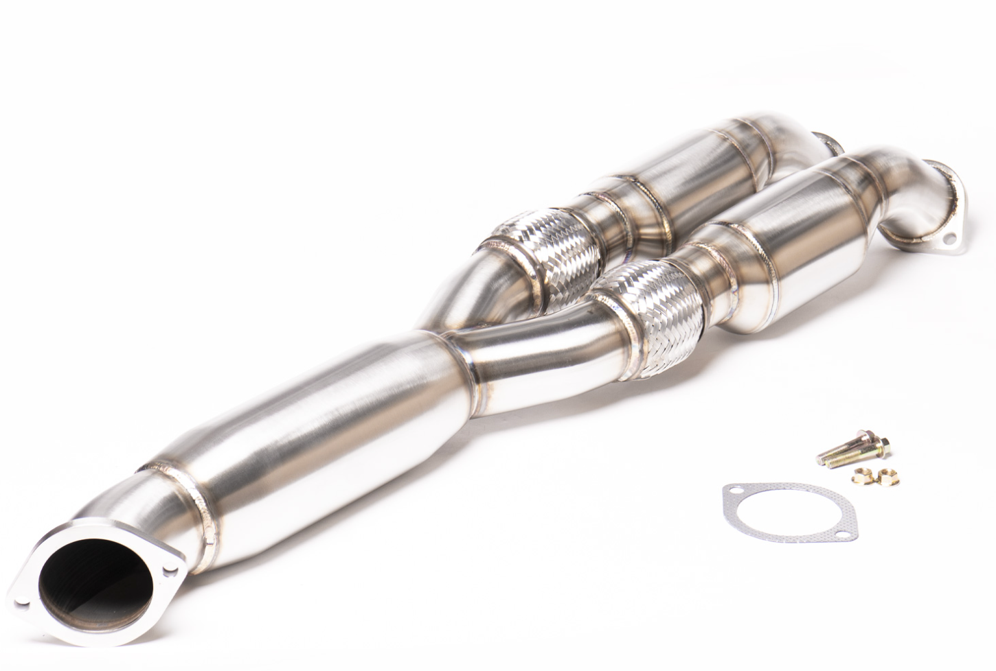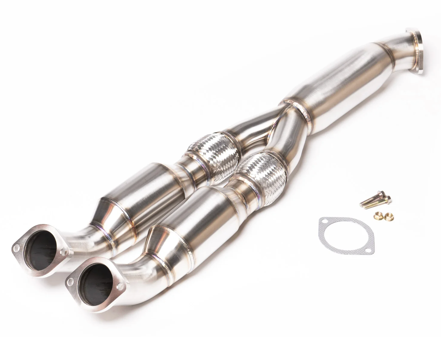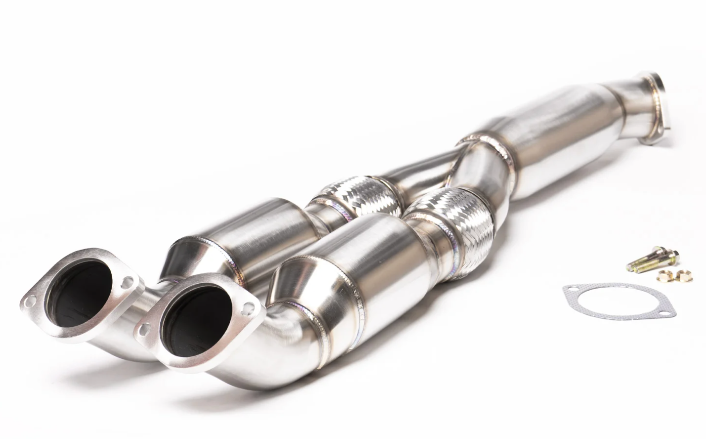 Bolts up to the stock or aftermarket downpipes and stock exhaust or most aftermarket systems