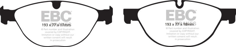 EBC Yellowstuff is an aramid fibre based brake compound with high brake effect form cold and is possibly one of the first ever compounds that can be used for STREET AND TRACK DRIVING. These pads do not require warm up but do get even stronger under the heat of hard driving. These are not a low dust pad and if your desire is for a low dust premium street use pad, you should consider EBC Redstuff.When considering full race use, Yellowstuff has been a strong favourite, having been used for two years in the Swedish Camaro Cup and at numerous other race events where a stock caliper system is fitted.It is also the choice of 90-percent of the Mazda MX5 Miata competitors in the UK race series and has an unblemished record as rotor friendly track pad for vehicles up to 2000 lbs weight or 200 BHP.In the USA the SCCA and NASA drivershave been testing Yellowstuff with feedback and good reports POURING in from a 543 test driver major market proving event with these groups. Read that figure again 543 test drivers.There is no guesswork here.
