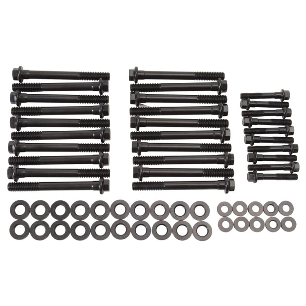 The Edelbrock #8595 bolt kit contain a complete set of the highest quality head bolts and hardened washers available. Cold-formed to ensure molecular integrity and heat treated prior to thread rolling and machining. Reduced diameter bolt heads eliminate the need for valve train removal to facilitate cylinder head re-torqueing. Hardened and parallel-ground washers are included. Rated at 170,000 p.s.i.