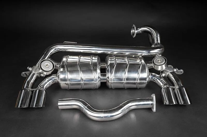 This system includes eliminates the OEM Catalytic Converter with a Cat Delete Pipe. When the valves are closed exhaust gas goes through Capristo Muffler. When valves are open, the exhaust gas bypasses the rear silencer.