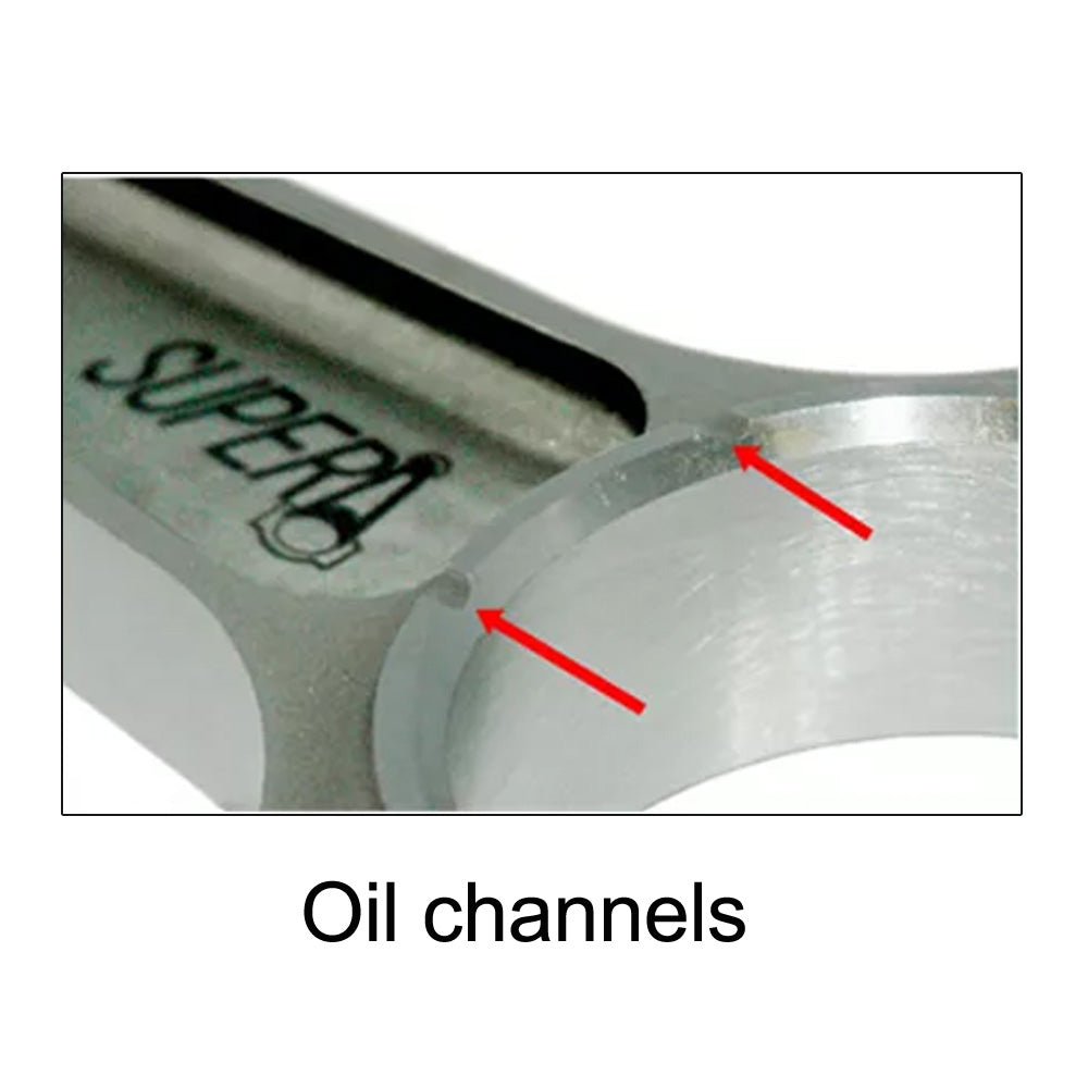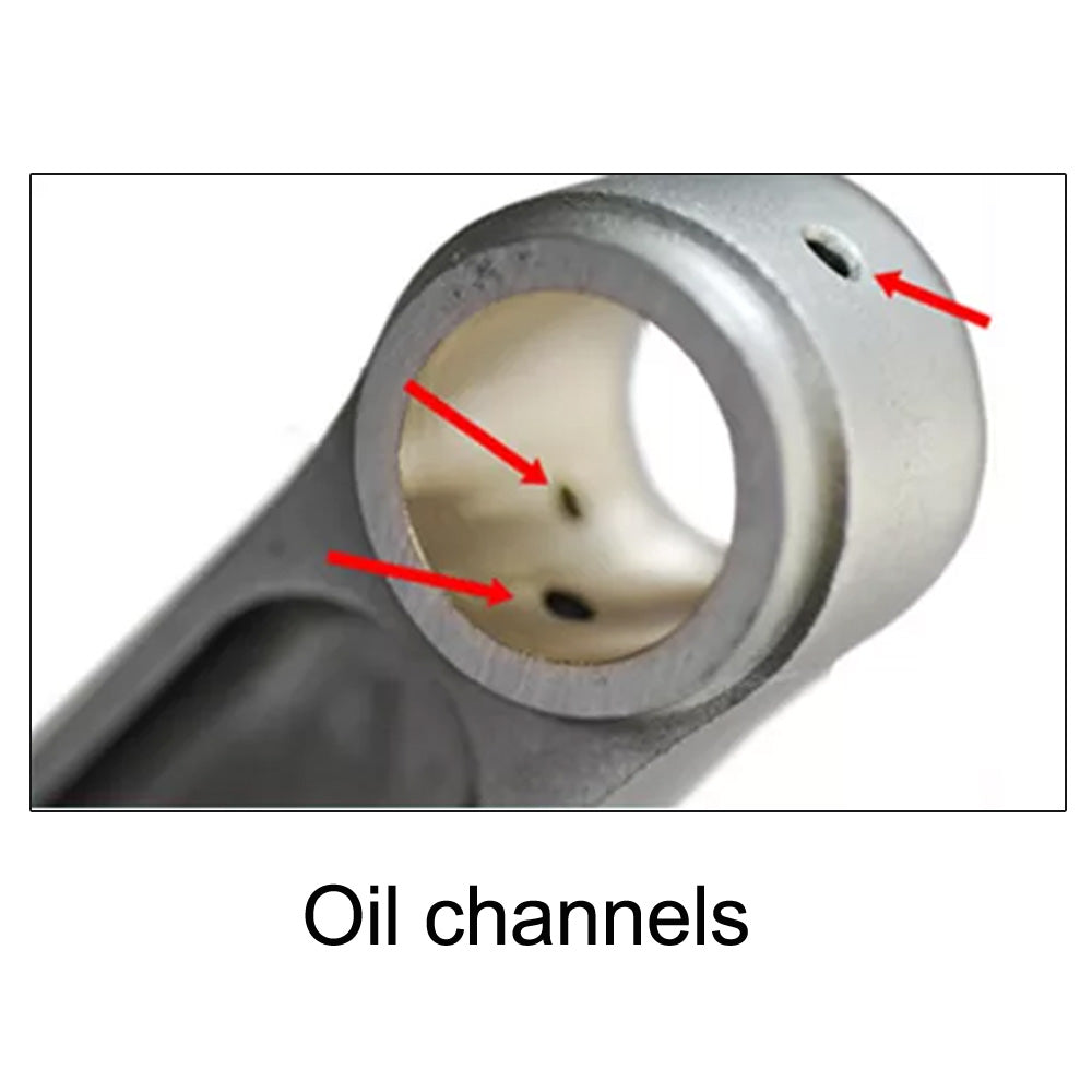 - 3 oil channels at the small end and 2 oil channels at the big end for maximum pin lubrication