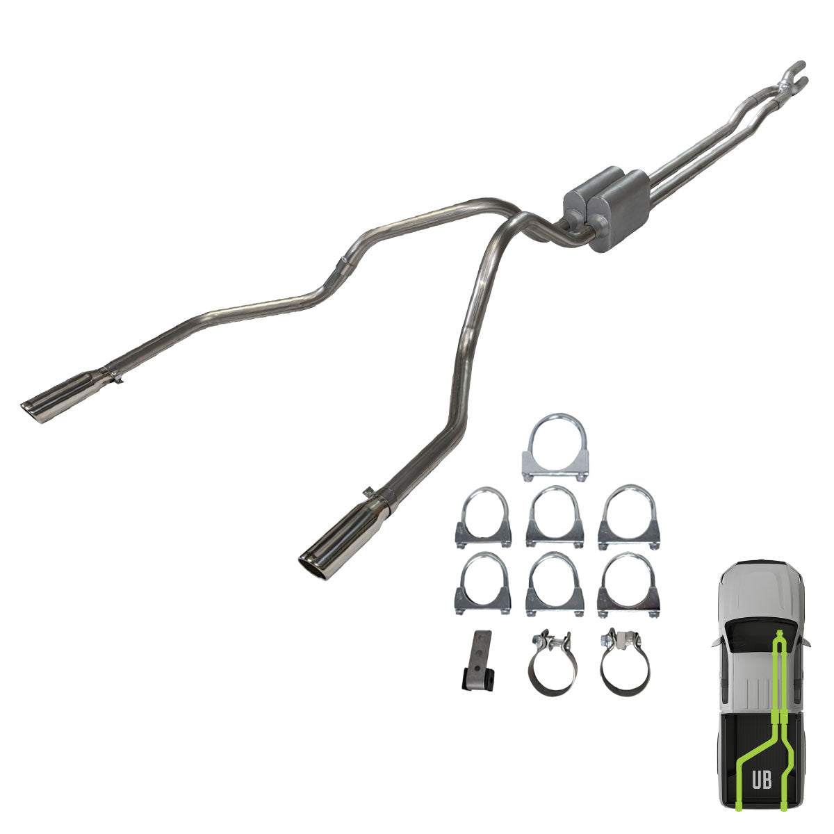 This kit fits all Wheelbase vehicles listed below. You will unbolt your factory system at the 2-1 Resonator inlet. After that point, the MPI kit Supplies all the parts, pieces, and fasteners that bolt together with zero welding needed; Printed instructions are included. You will reuse all the factory mounts on the right, and a new mount will be provided on the LR hanger. (Kit Update: This system bolts directly to the factory flange and Clamp)