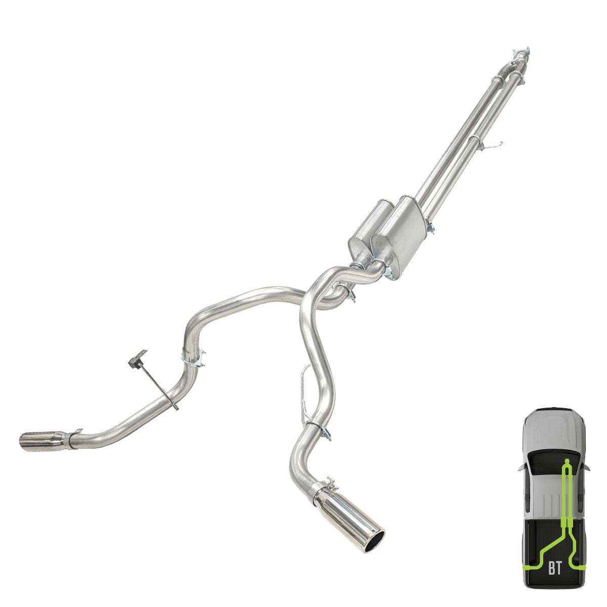 This kit fits all Wheelbase vehicles listed below. You will unbolt your factory system at the 2-bolt flange in front of the Resonator inlet. After that point, the MPI kit Supplies all the parts, pieces, and fasteners that bolt together with zero welding needed; Printed instructions are included. You will reuse all the factory mounts on the right, and a new mount will be provided on the LR hanger. (Kit Update: This system bolts directly to the factory flange)