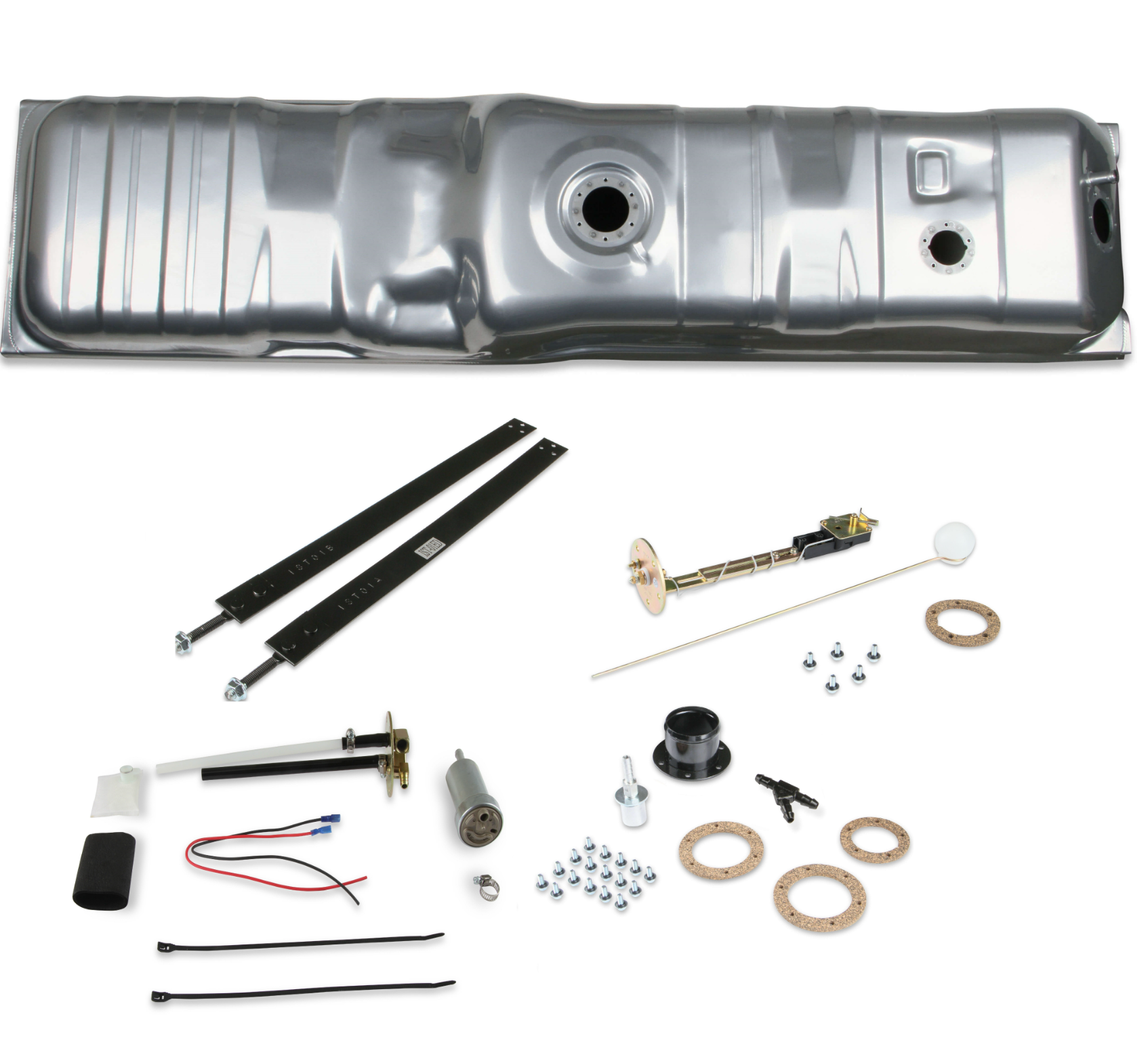 Holley and Sniper will help you to complete your EFI swap with our new EFI Conversion Fuel Tanks. Each tank is a direct fit for your application-no modifications necessary. The kit includes the tank, a 400 lph fuel pump, internal baffling, and a fuel level sender. The tank is powder coated for corrosion resistance and great looks. These tank kits are a complete solution for your EFI project! Supports up to 750 EFI (@ 60 PSI at 13.5 Volts / 10.4 AMP Draw) •Size is: 56" x 14-1/8" x 11" ***New Straps included ***Using the GM design, these tanks will fit on either side of the truck. For a better seal use Permatex Indian Head Gasket Shellac Compound or Aviation Form-A-Gasket sealant on the gasket and screws.