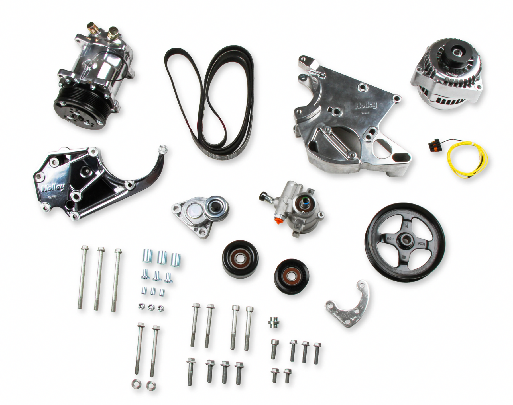 Now available from Holley are complete kits in polished finish that have everything needed for the application including the belt. Included are accessories, pulleys, tensioner, and belt that are manufactured by OE part suppliers many of which are on production cars today. Replacement hardware kit is 97-171