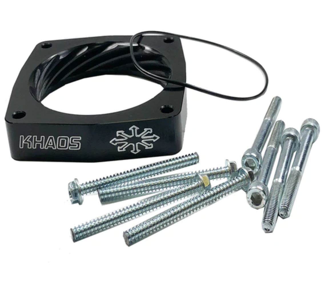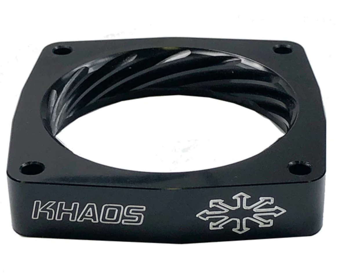 Treat your vehicle right with a Throttle Body Spacer from Khaos Motorsports. Developed to enhance off-idle torque, our helix bore design spins the incoming air charge as it passes through the throttle body spacer. This spinning action boosts the velocity of the incoming air and contributes to better atomization of the air/fuel mixture as the air charge enters the combustion chamber. The end result is more part-throttle torque, improved mid-range power, and overall combustion efficiency for better fuel economy.