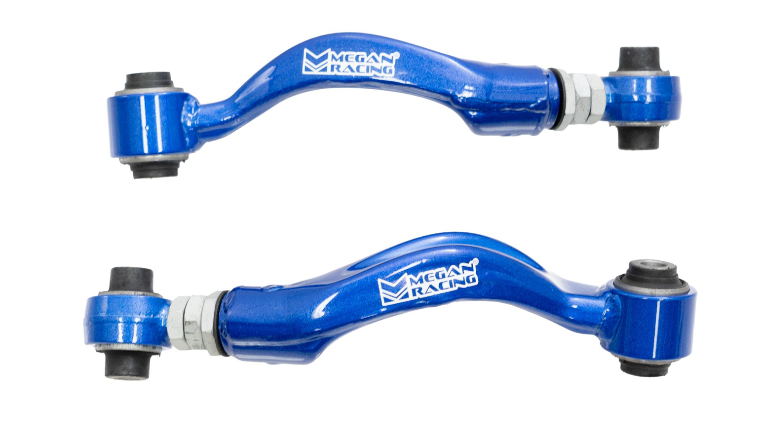 Megan Racing control arms are constructed of a Lightweight Steel-Alloy which is able to withstand the stresses of extreme competition these arms are powder coated with a 3-Stage process to ensure durability and protection against the elements. Incorporated turnbuckle style adjustability allows for fine tuning of the vehicle's rear camber angles while hardened rubber bushings help eliminate suspension slop over the soft (and tired) factory bushings increasing vehicle dynamic response while still insulating the majority of absorbed road noises. All hardware is treated to help prevent corrosion during the harshest weather conditions and are protected with a 1-year warranty against manufacturer defects.