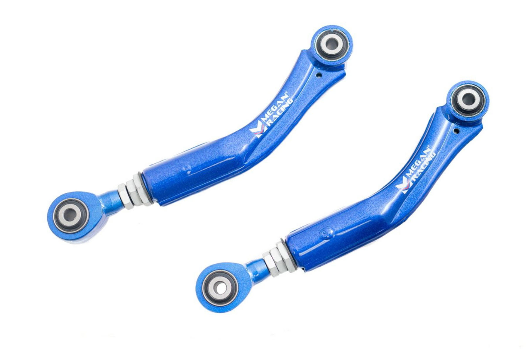 Megan Racing control arms are constructed of a Lightweight Steel-Alloy which is able to withstand the stresses of extreme competition these arms are powder coated with a 3-Stage process to ensure durability and protection against the elements. Hardened rubber bushings improve response over the old and softer OE rubber bushings while still adequately absorbing noises from received road forces. Alignment angles are easily adjusted by accessing the hex screws fastening the balljoint and simply pulling in or out. All hardware is treated to help prevent corrosion during the harshest weather conditions and are protected with a 1-year warranty against manufacturer defects.