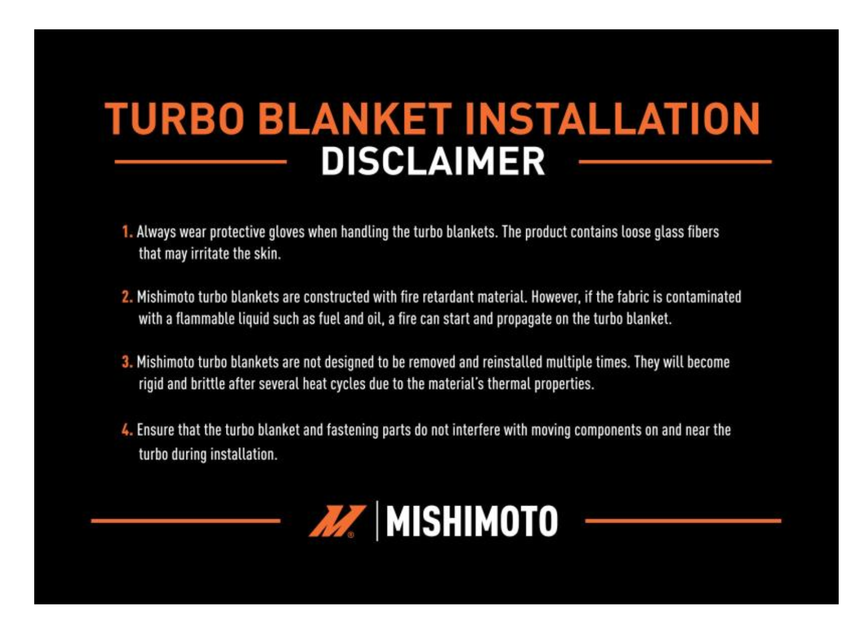 2. Mishimoto turbo blankets are constructed with fire retardant material. However, if the fabric is contaminated with a flammable liquid such as fuel and oil, a fire can start and propagate on the turbo blanket.
