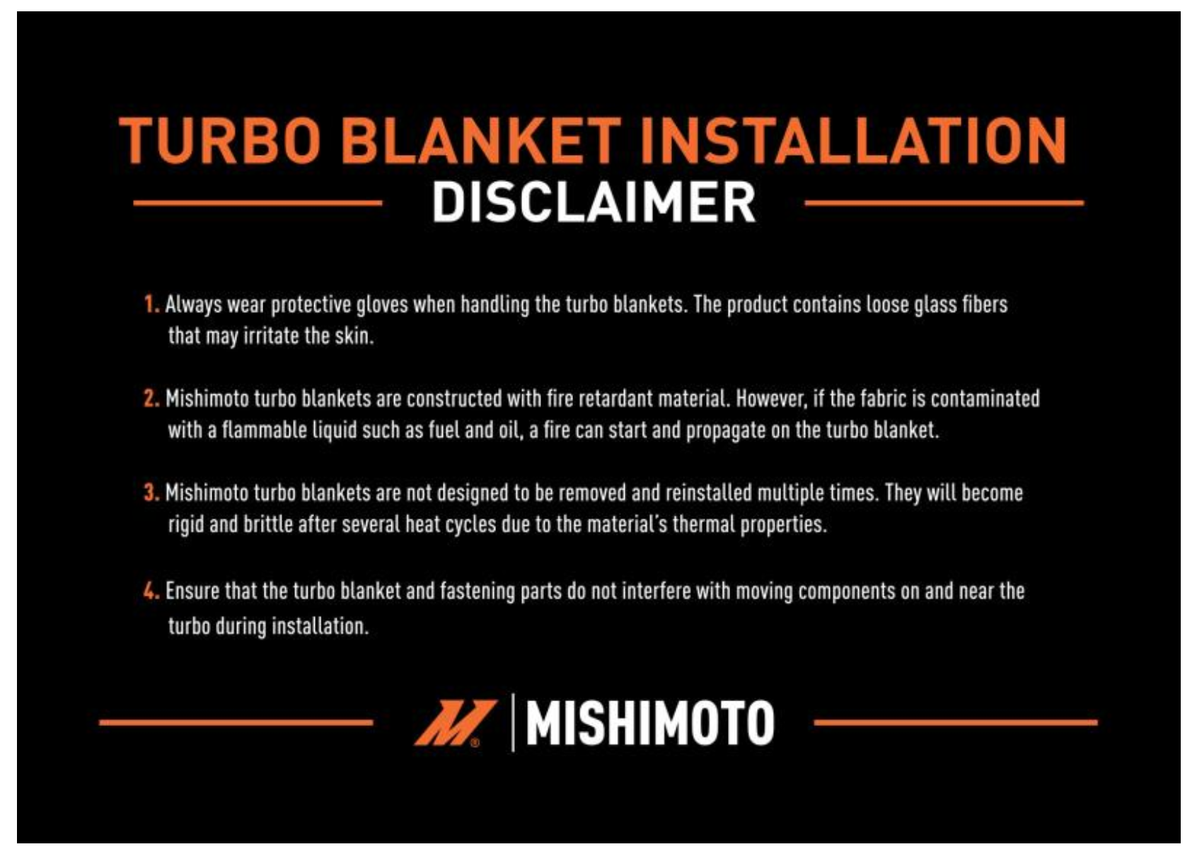 2. Mishimoto turbo blankets are constructed with fire retardant material. However, if the fabric is contaminated with a flammable liquid such as fuel and oil, a fire can start and propagate on the turbo blanket.