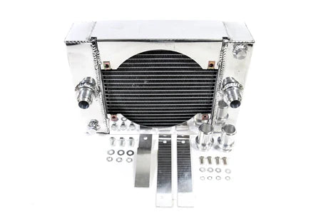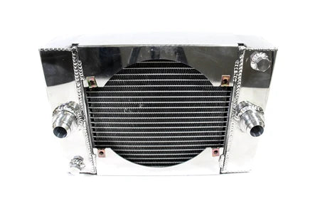 The PLM Compact Aluminum Radiator with Slip Fittings & -16AN Connections is a versatile and universal racing radiator designed for various builds, whether it's for compact cars, drag race applications, or any project requiring a small yet efficient radiator. It features slip fittings for factory-style hoses and -16AN connections for custom braided hoses, providing flexibility for different setups. An optional SPAL fan can also be added for enhanced cooling performance.