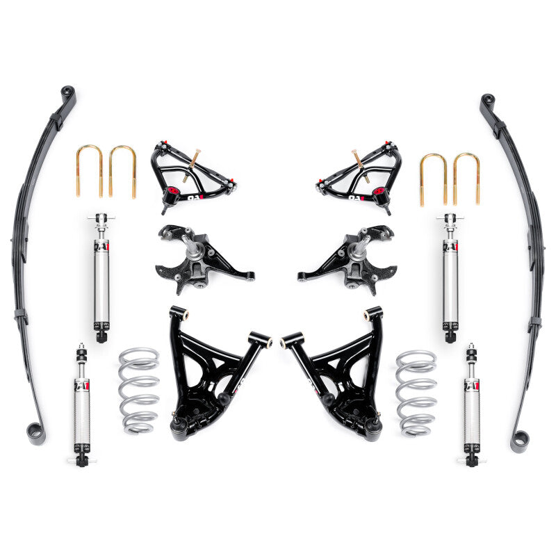 The QA1 Level 2 Handling Kit for 1982-2003 Chevy S10 pickups delivers a balanced, full-vehicle suspension upgrade engineered to work together from front to rear. Designed for street performance enthusiasts, this kit improves handling response, steering feel, and ride quality while achieving a clean, lowered stance. QA1 assembled this system as a complete solution. Every component was hand selected to complement the others, giving you predictable performance, proper geometry, and an easier path to a well-sorted truck. PERFORMANCE & STANCE YOU CAN FEEL Capable of a 2-4” drop up front and up to a 3” drop in the rear, this Level 2 kit delivers a clean, lowered stance. Up front, 18-way double adjustable QA1 coil-over shocks allow you to fine-tune ride quality while maintaining confident control through corners. Tubular upper and lower control arms improve suspension geometry and strength, helping the truck feel more planted and responsive on the street. Forged drop spindles correct steering geometry at lowered ride heights, reducing bump steer and maintaining proper alignment throughout suspension travel. A QA1 fat front sway bar further improves handling control, delivering flatter cornering and improved stability during spirited driving. Out back, lowering rear leaf springs were chosen for the right spring rate and unique reverse spring eye design. The front spring mount is optimized for improved anti-squat characteristics, giving you more control over how the truck plants power to the ground, especially when launching or cornering. BOLT-IN CONVENIENCE, NO GUESSWORK This QA1 Handling Kit is designed as a direct-fit, bolt-on solution for 1982–2003 S10 pickups. Components are selected and validated to work together, eliminating the trial-and-error.