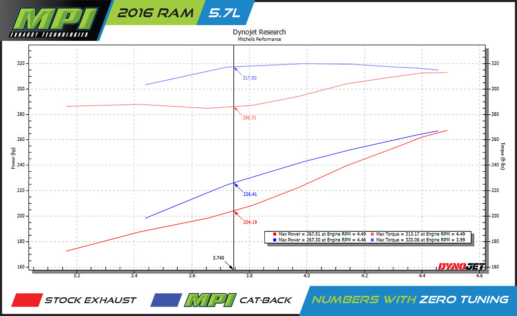 The MPI Exhaust Kit is a Cat-back Exhaust system specifically engineered for trucks equipped with the Ram 5.7L Hemi Engine, aimed at enhancing overall vehicle performance. This kit provides notable improvements in horsepower, torque, and fuel efficiency, verified through extensive dyno testing. Designed for easy installation, it leverages 35 years of exhaust experience and includes all necessary hardware for a hassle-free setup. Additionally, it is 50-state Emission Compliant and does not void any vehicle warranties.