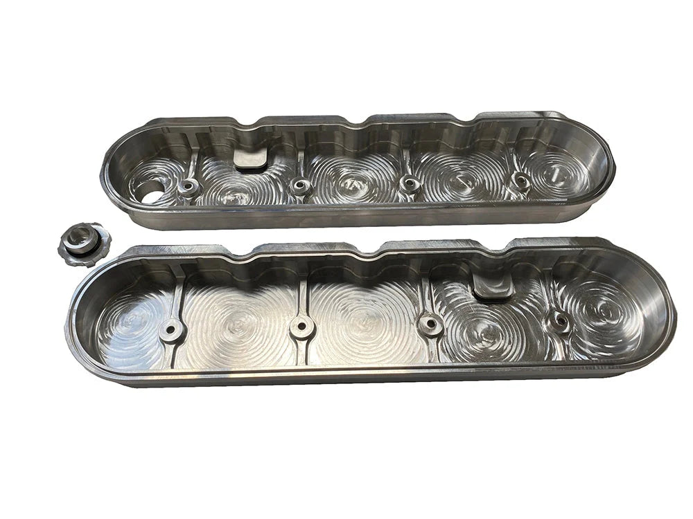 Speed Engineering LS billet valve covers. Our valve covers keep the factory coil location, with an added 10AN breather on each side. Available in either raw billet, or textured black. Proudly made in the USA.