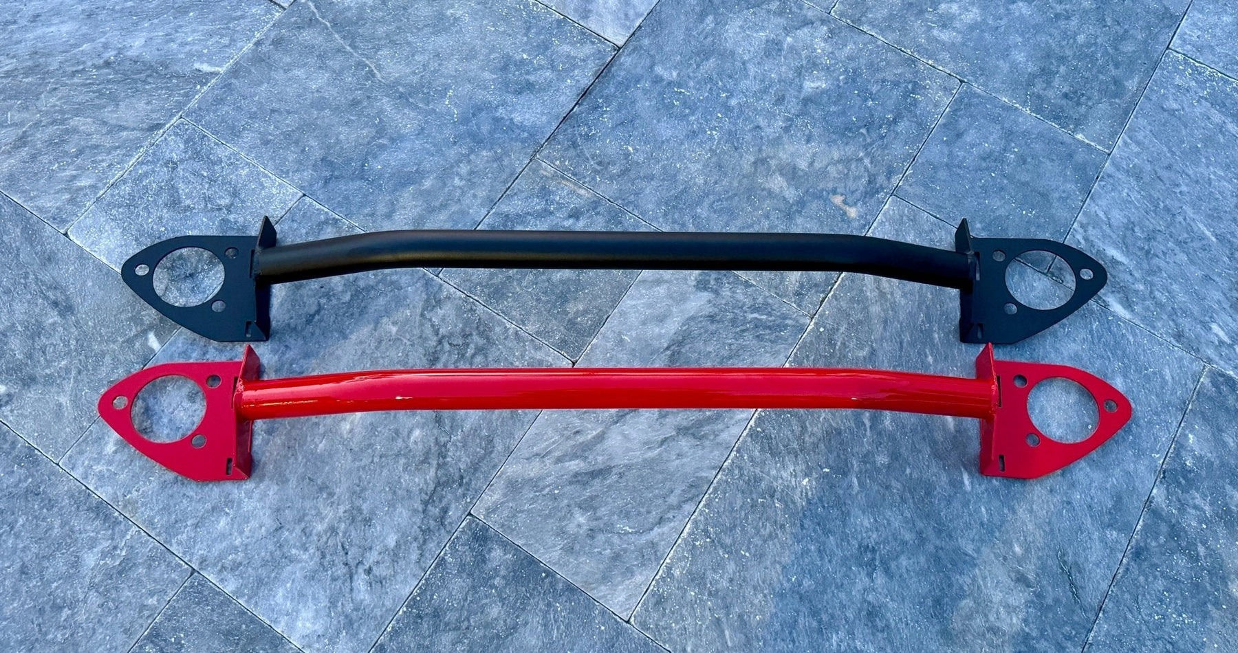 Our 2-point front strut tower brace is made in-house in the USA from aluminum tube welded to precise laser-cut aluminum mounting plates. Installation is a breeze, as you simply remove the 6 strut tower nuts, drop our brace into place, and re-install the nuts. Fits 5.7L, 392 engines with no engine cover.