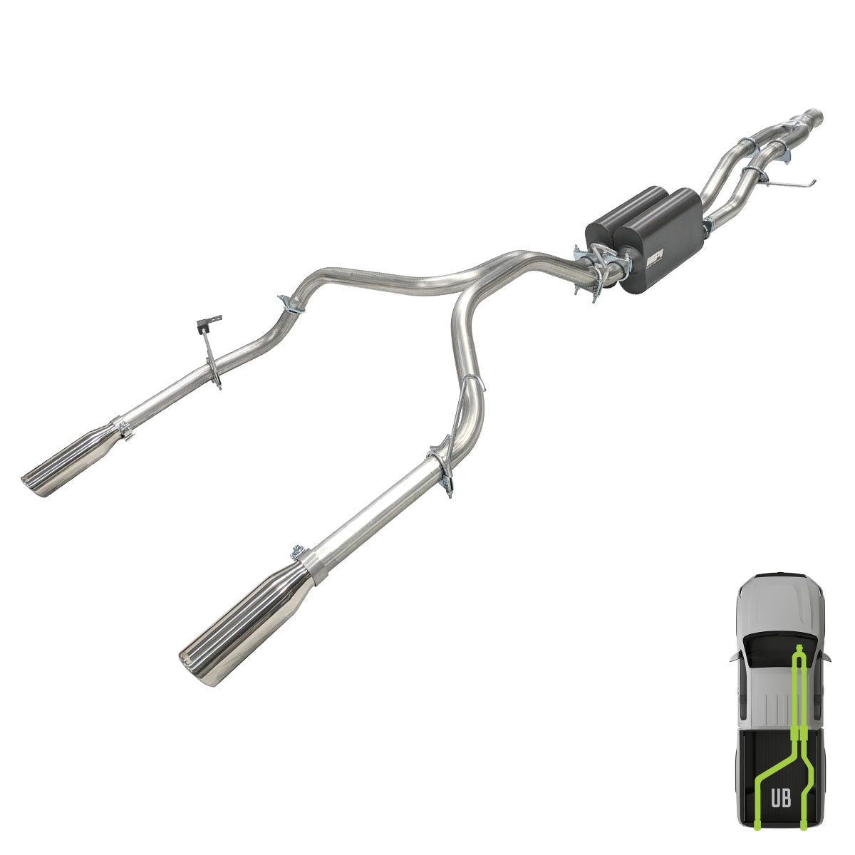 These kits are made of thick 14 Ga. aluminized tubing paired with a tough, bright finish that protects from the elements. Source materials have proven their durability and reliability for over 20 years. Finished with our 3.5" x 12" single-wall tips to enhance a good balance of sound and looks, 4" Quad tips are available under the bumper. MPI kits are proudly manufactured in Montana.
