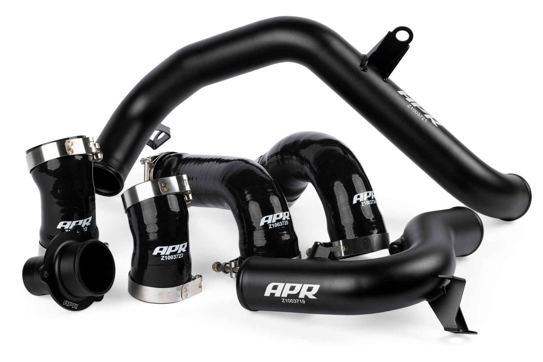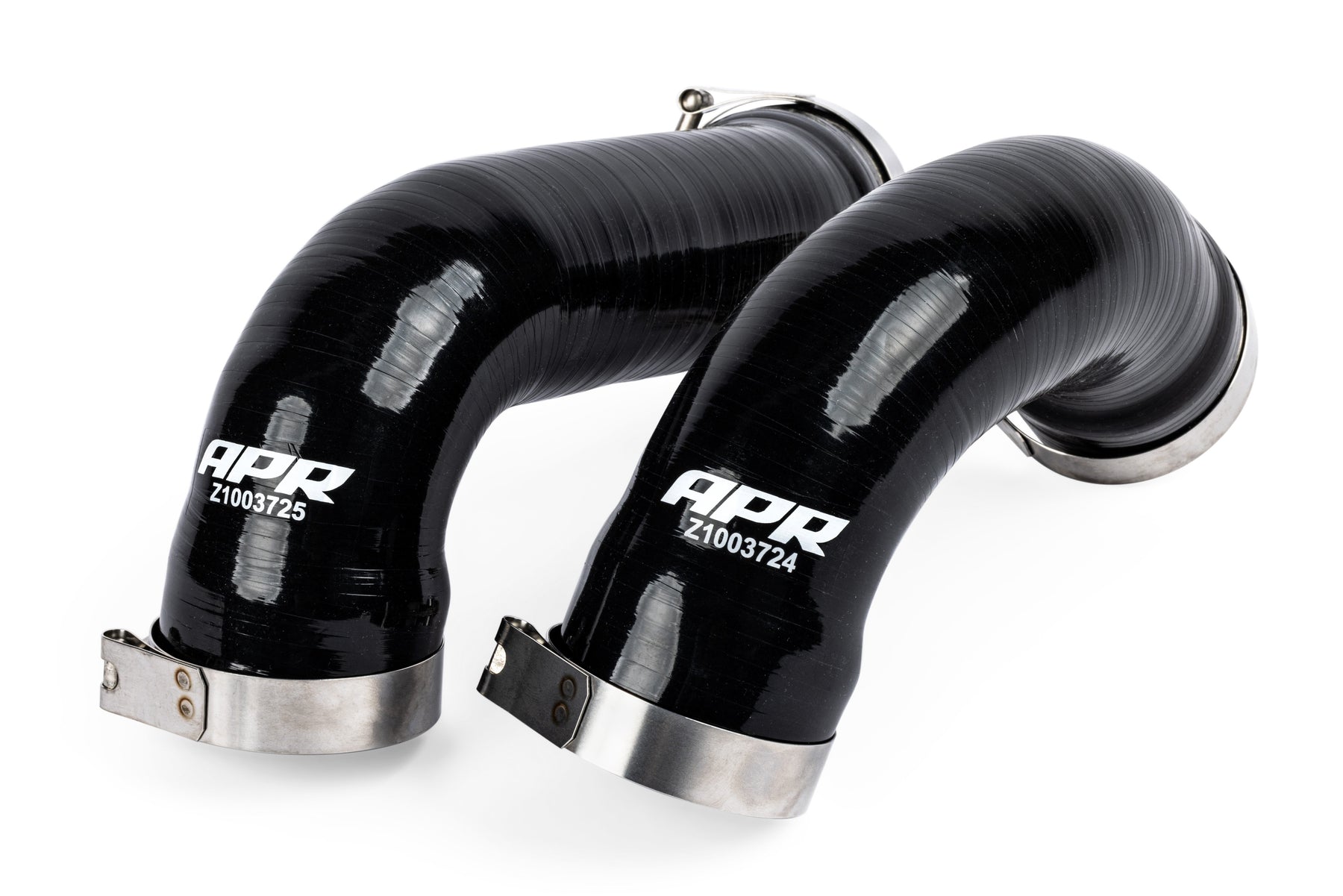 APR Intercooler Hoses replaces the factory rubber hoses and worm-gear clamps with a high quality multi-ply silicone hoses and strong Clampco T-bolt clamps. The interior of the hoses are smooth and lined with a fluorosilicone material designed to resist oil degradation and extend component life. EZ-Flow stepped lips within the hoses allow for a smooth connection from hose to pipe for uninterrupted airflow. We pay close attention to the airflow path and provide as few bends and tight radius turns as possible. Furthermore the hose material adheres to its mating surface under high temperature to help create a stronger leak and slip free connection. This all results in a more reliable setup and increased performance through a smooth and strong uninterrupted airflow path. These hoses are compatible with both OEM and upgraded APR charge pipes and intercoolers.