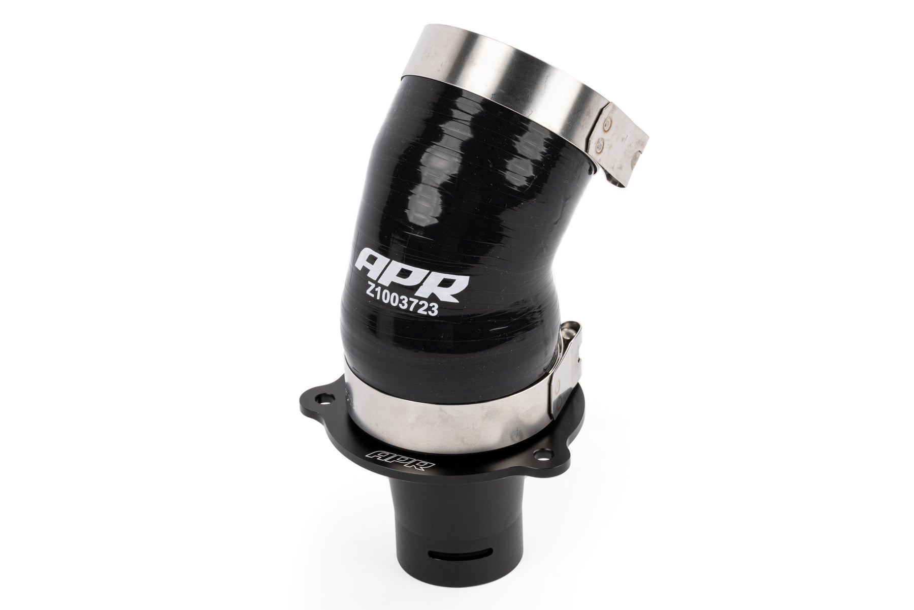 The APR Throttle Body Pipe replaces the factory plastic pipe with a high quality aluminum pipe that’s a constant diameter within. We pay close attention to the airflow path and provide as few bends and tight radius turns as possible to maximize performance. Unlike the factory plastic pipes, ours won’t melt and crack under extreme conditions, and ours don’t contain a failure-prone and resistive internal piece like the factory pipe. The pipe features an additional port which can be used for an additional sensor, water/methanol injection, or however you see fit, and includes an NPT tap to block it off when not in use. The pipe features bead rolled connection points to help resist hose slippage, and all mounting brackets and billet sensor ports are tig-welded to the pipe for a strong connection. Finally, the pipe is finished in an attractive satin-black finish. This all results in a more reliable setup and increased performance through a smooth and strong uninterrupted airflow path. This pipe is compatible with both OEM and upgraded APR charge hoses.