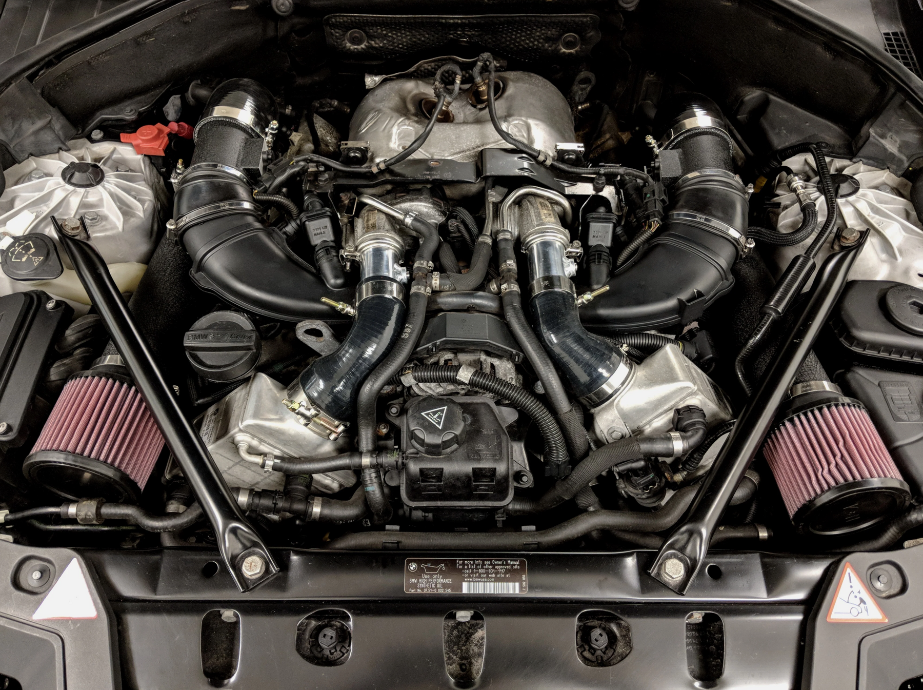 The ARM N63 Intake is designed to keep the filters as far away from the heat of the turbos as possible. The filters are positioned at the front of the engine bay, where it can take advantage of the fresh air that is directed into the engine compartment from the OEM air ducts just below where they live. This position helps to keep the filters away from the heat generated by the turbos, which can cause the filters to become saturated and reduce its effectiveness. If you're looking to get your N63 the coolest possible air, consider the ARM Front Facing Upgrade.