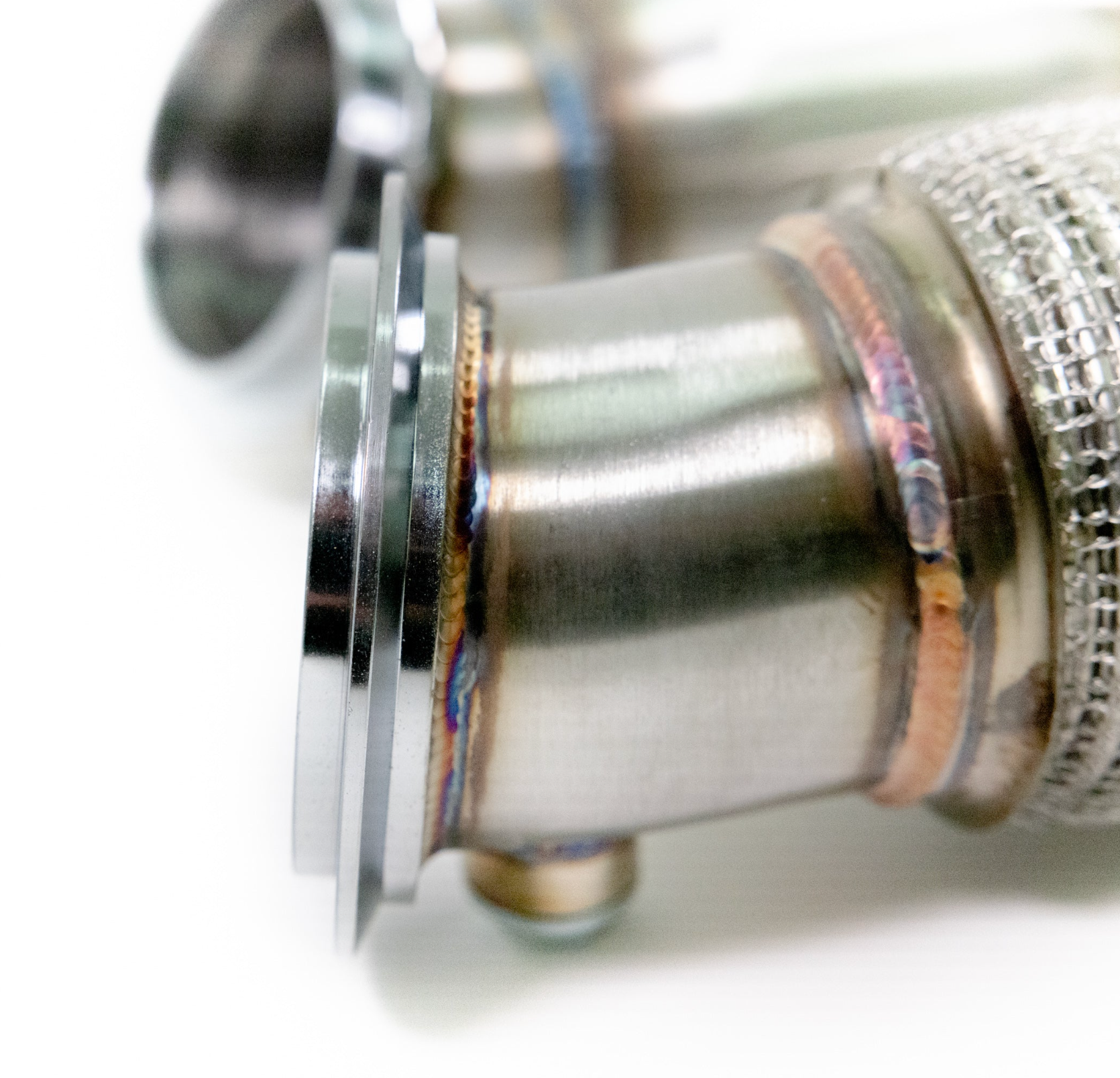 Precision CNC machined v-band flanges offer a smooth transition of exhaust gasses from the the turbochargers to the ARM S55 Downpipes. The body of the 3" ARM F80 M3 Downpipes are constructed of SS304 Stainless-Steel and are threaded smoothly and perfectly though the space given by BMW towards the mid-pipe section.