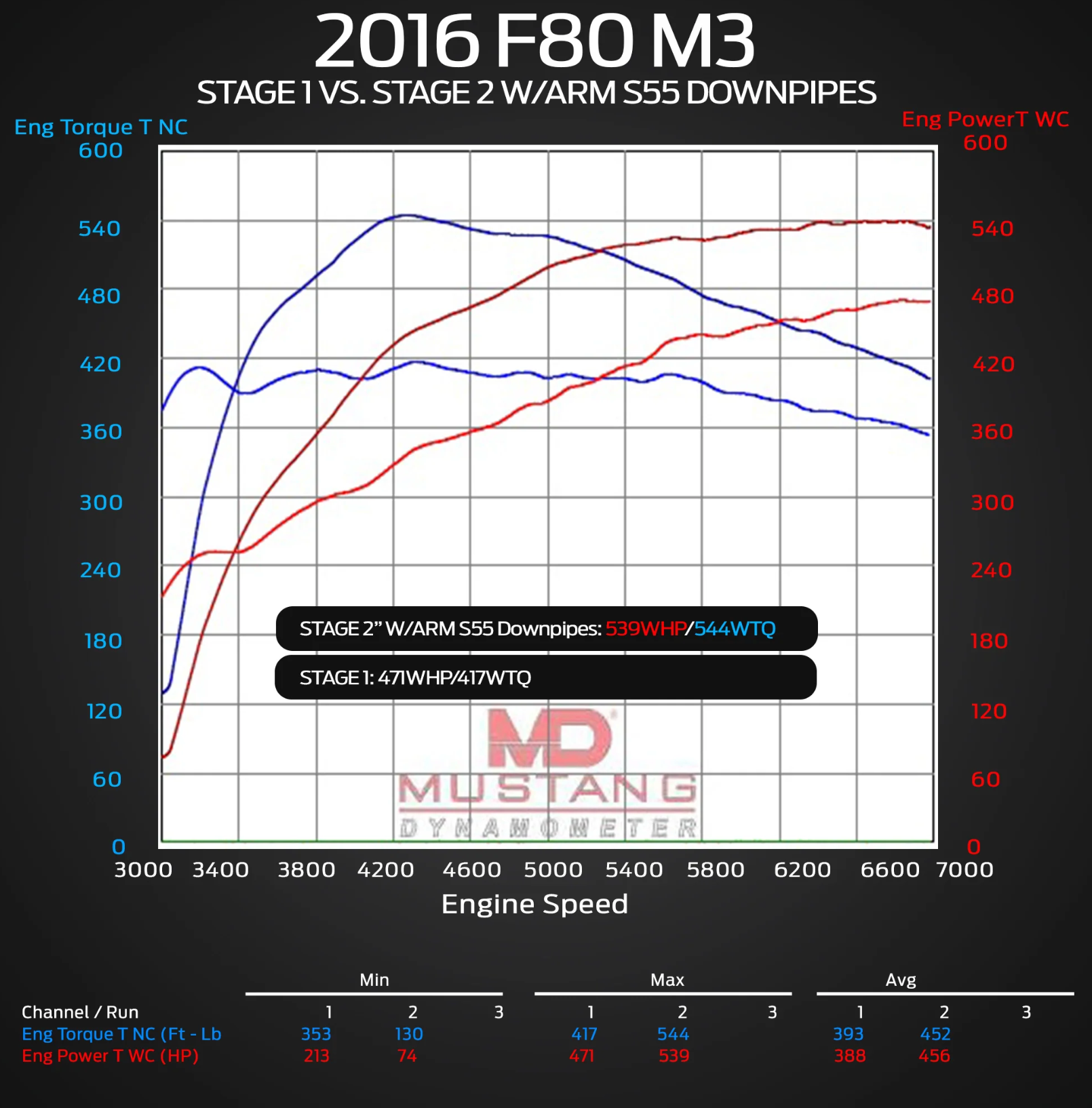 The ARM F80 M3 Downpipes relieve the stressful back-pressure caused by high-boost tunes, allowing the exhaust to flow freely, increasing power and torque, all while extending the longevity of your S55's turbochargers. On our test car, after installing our F80 downpipes and switching to a Stage 2 flash we made 543whp and 547wtq, this is 73whp and 126wtq gain over the stock results!