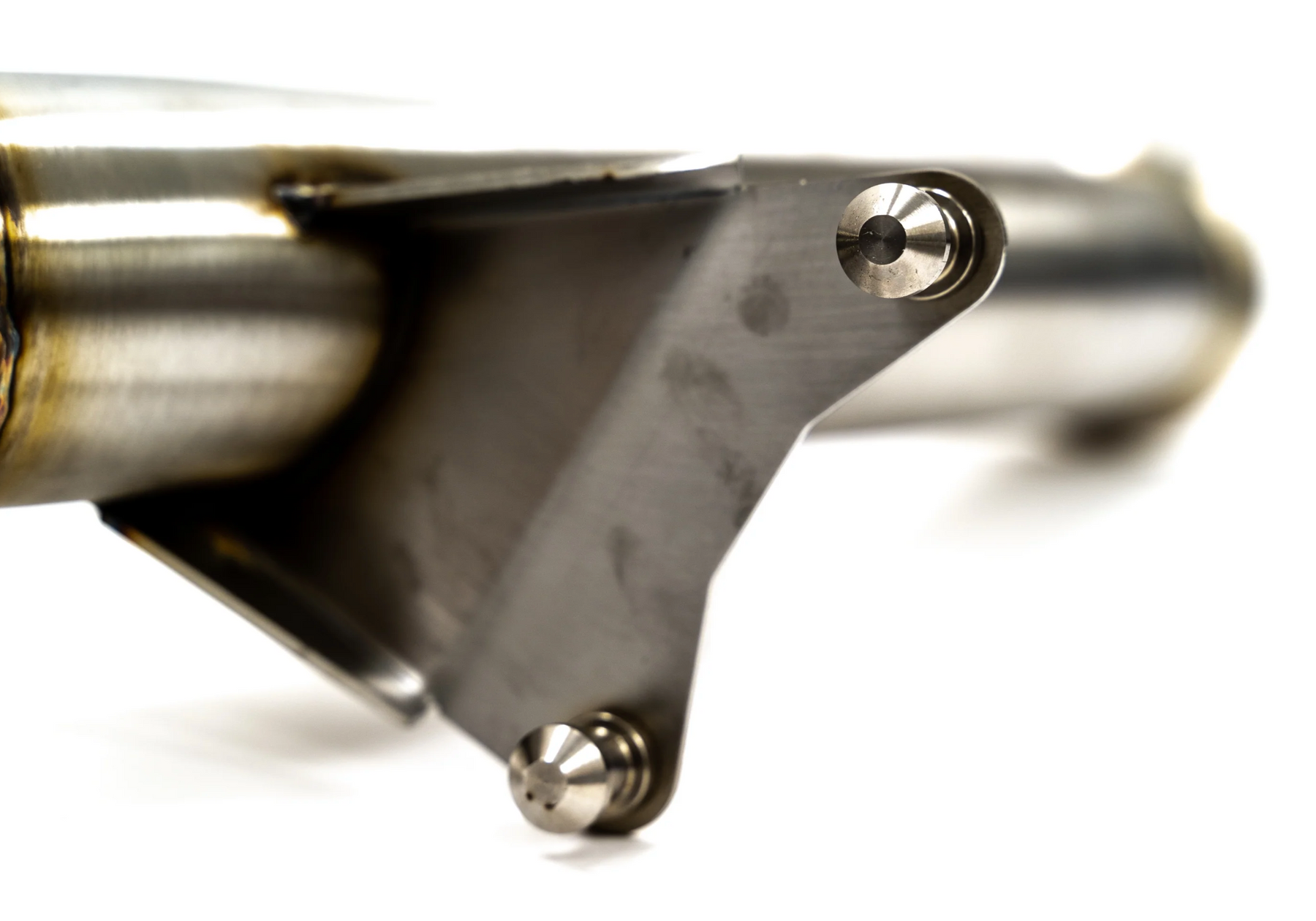 The laser-cut mounting bracket and CNC machined mounting prongs make for a precise fitment to your stock downpipe mounting points.