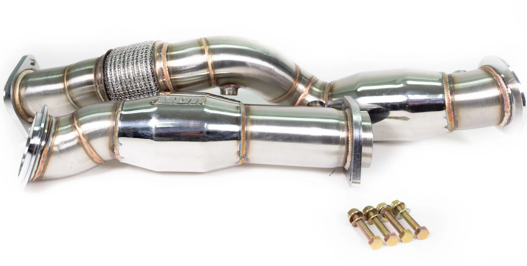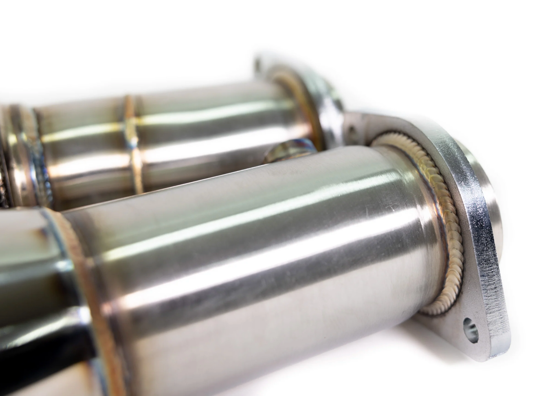 Each downpipe utilizes either a Catless Resonator, or a 200-Cell High-Flow Catalyst. The standard version is the Catless Resonated option. If you select the Catless Resonated S58 Downpipes, your downpipes will have our resonators installed to help tune the tone of your S58 for a strong and aggressive sound while maximizing exhaust flow. The resonators are completely hollow on the inside, there is no obstruction whatsoever.