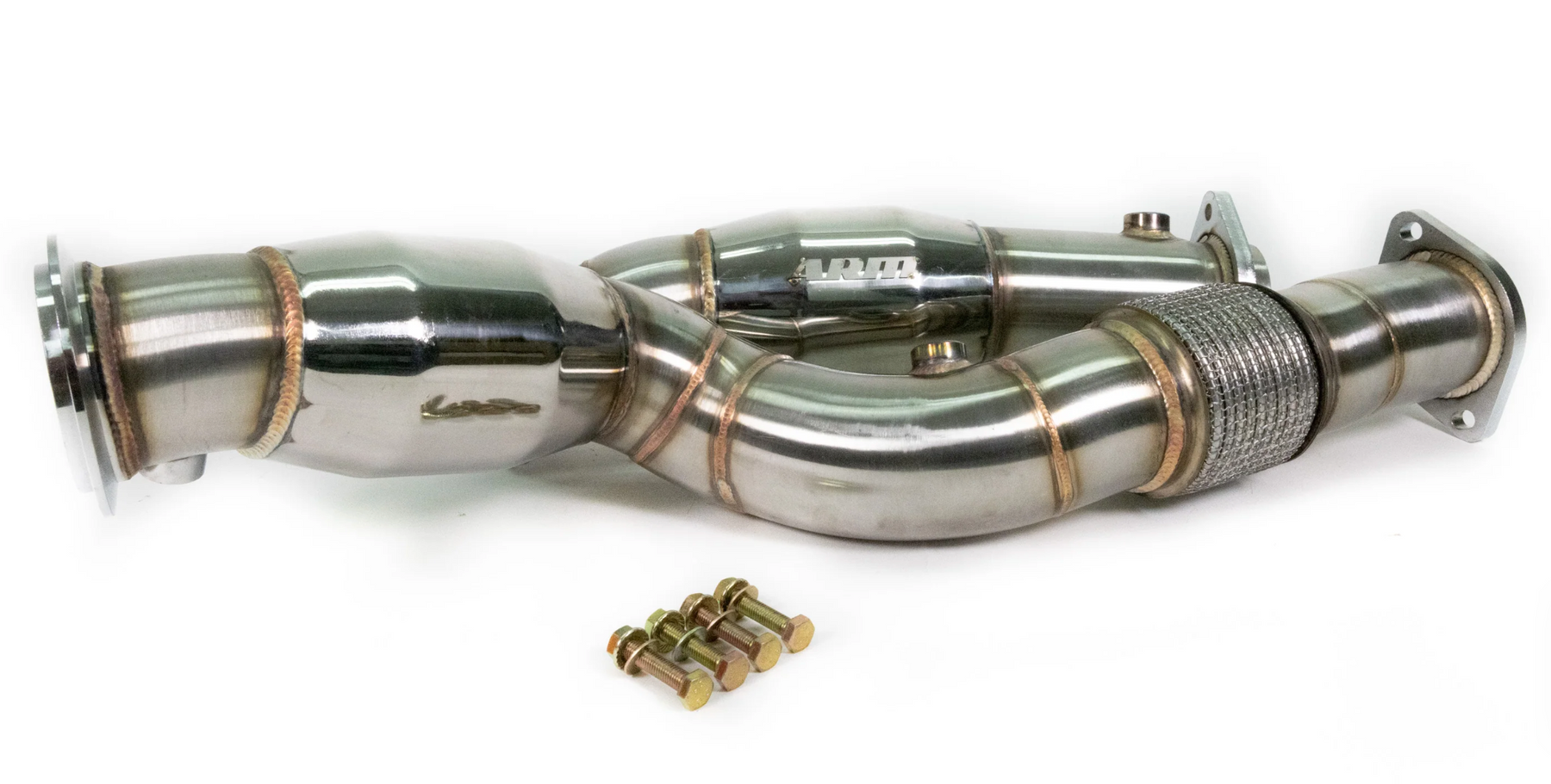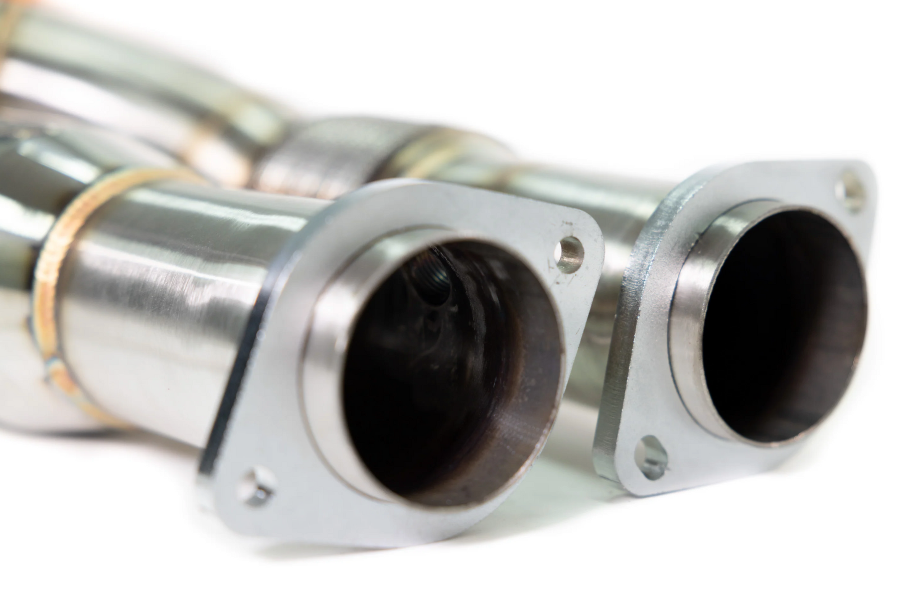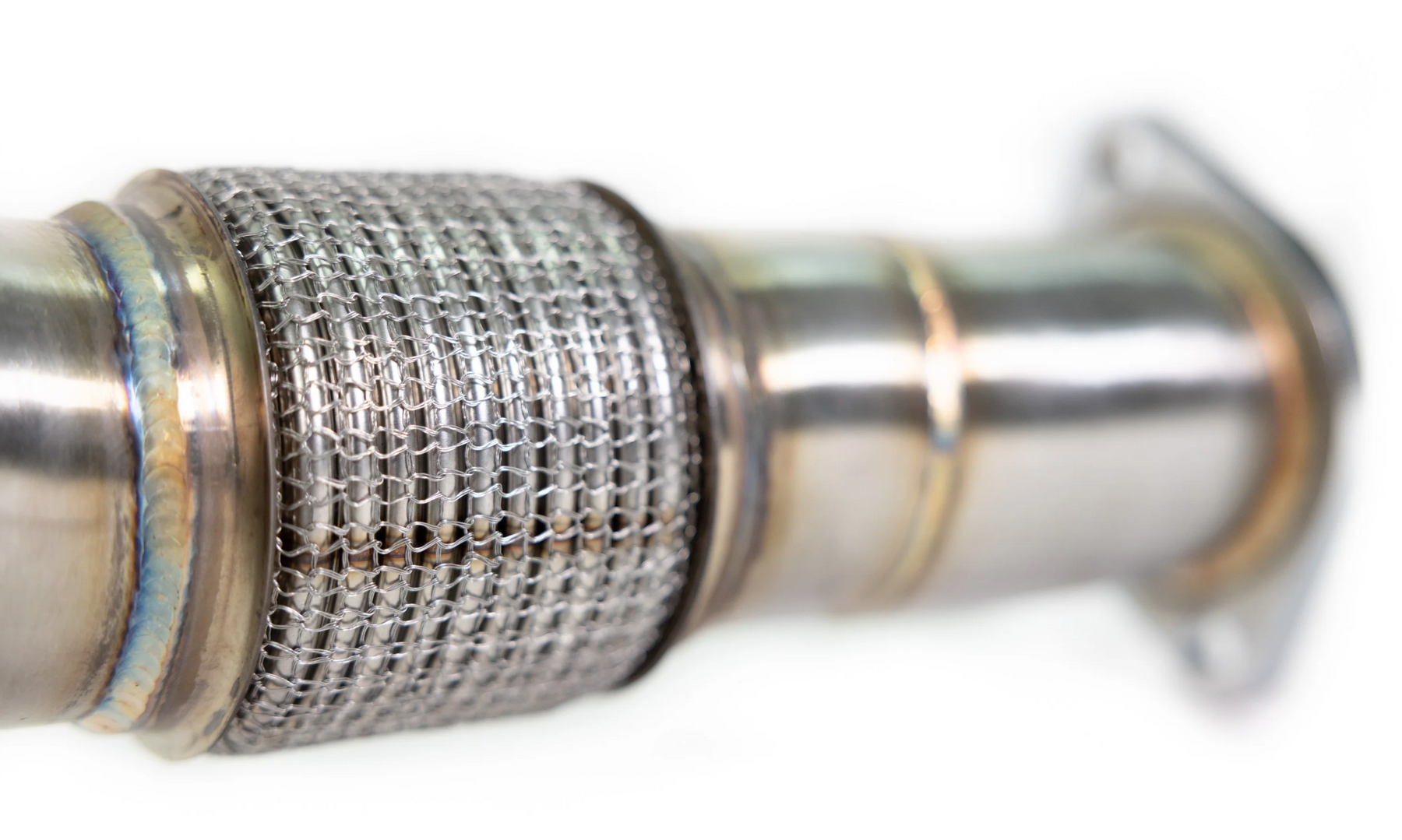 The longer downpipe (front downpipe) in the set utilizes a reinforced flex section. The flex section is incorporated into the long downpipe to relieve stress on the turbo during aggressive driving.