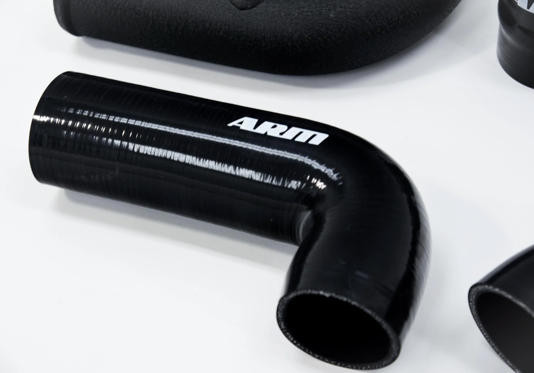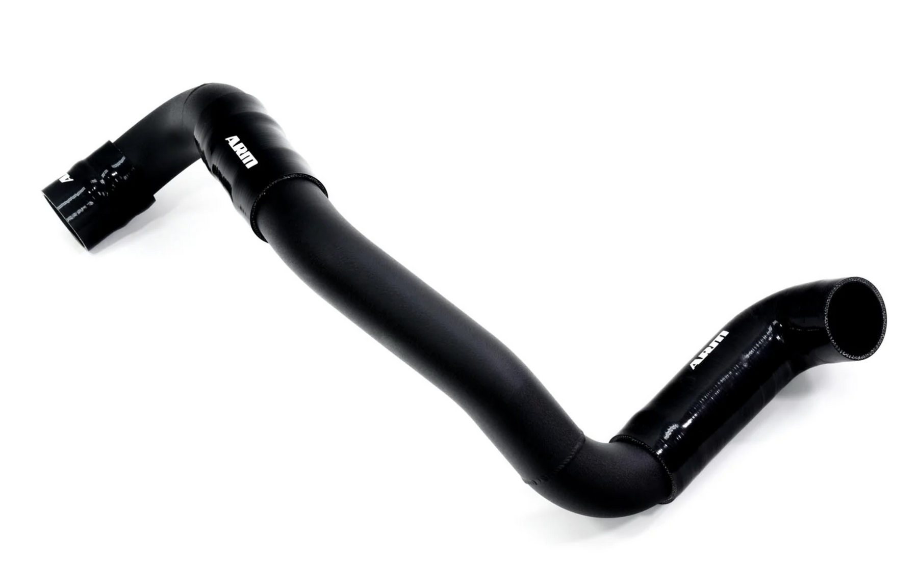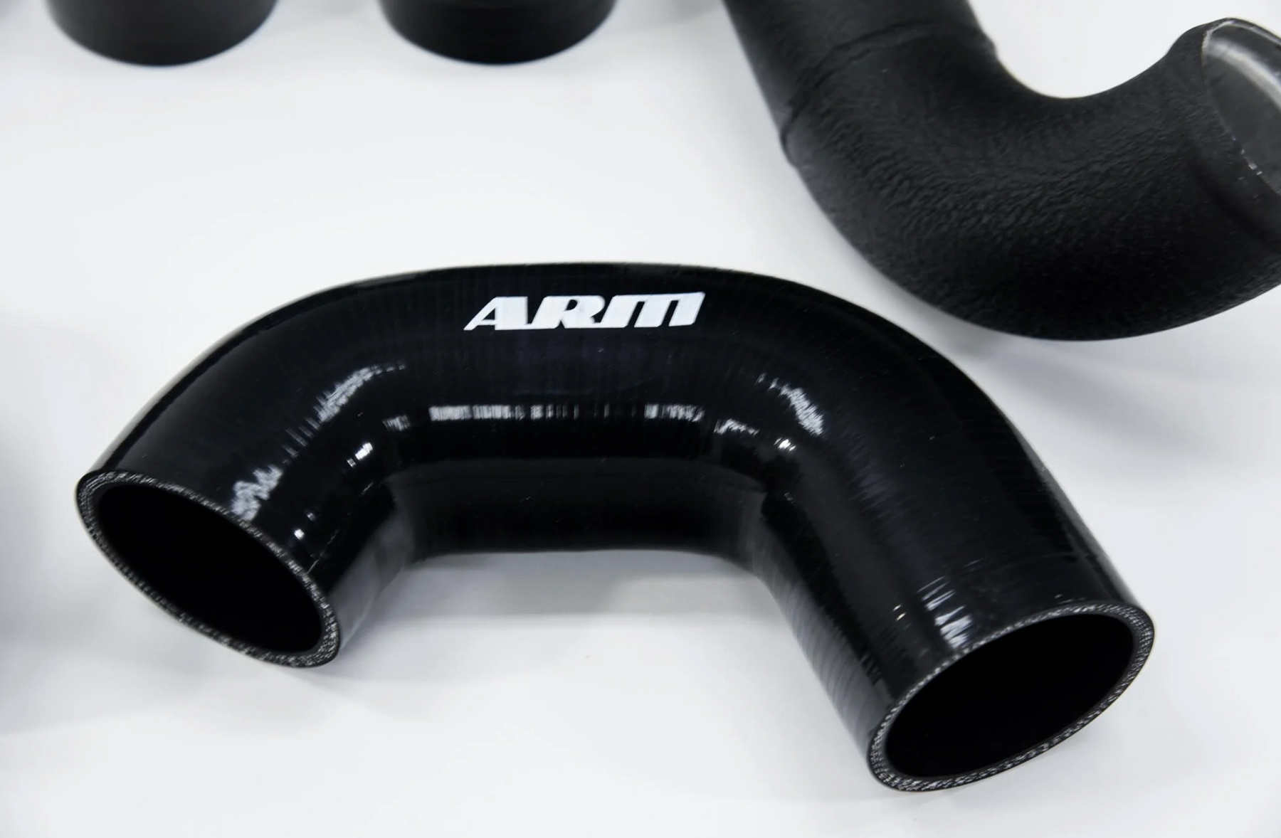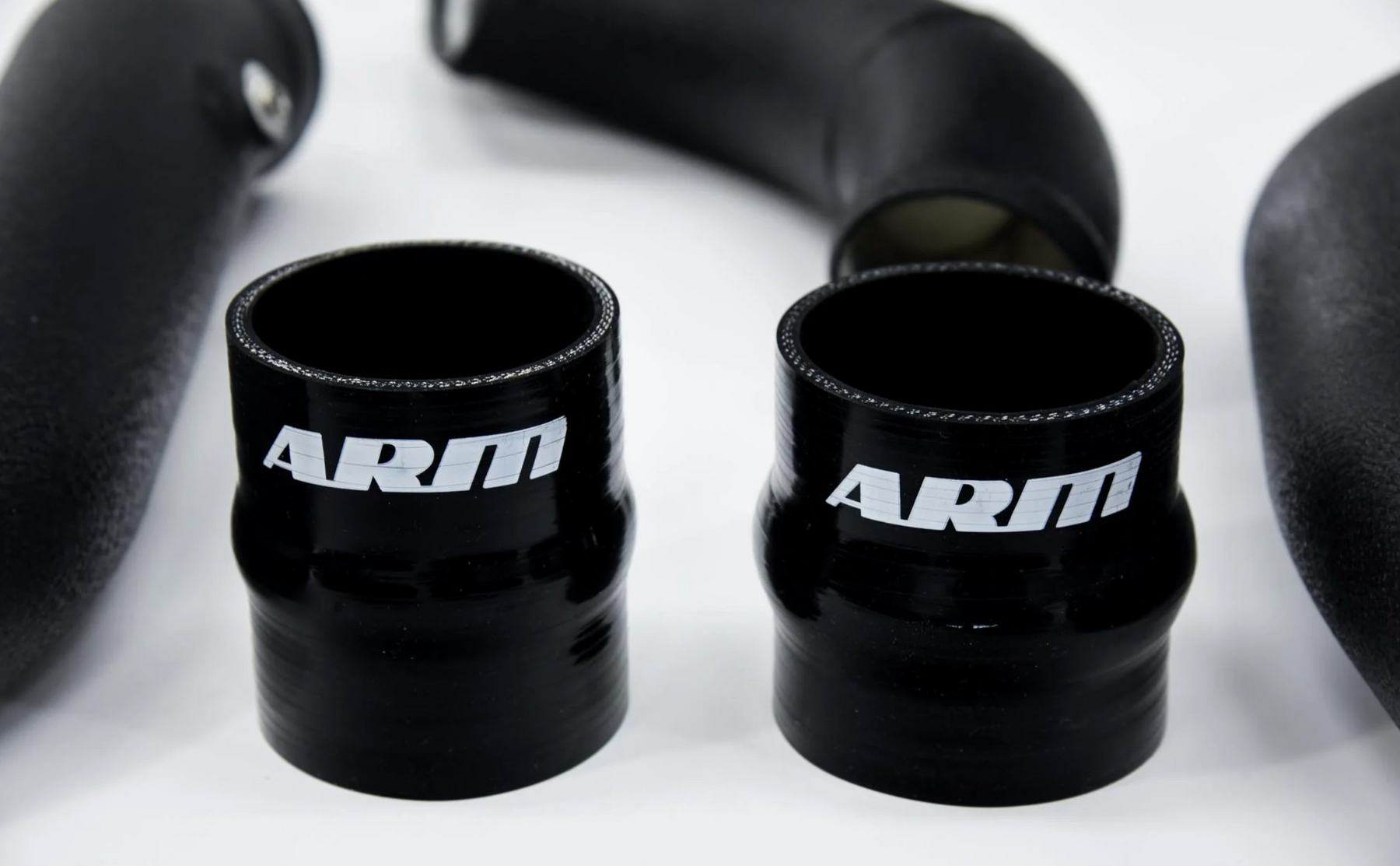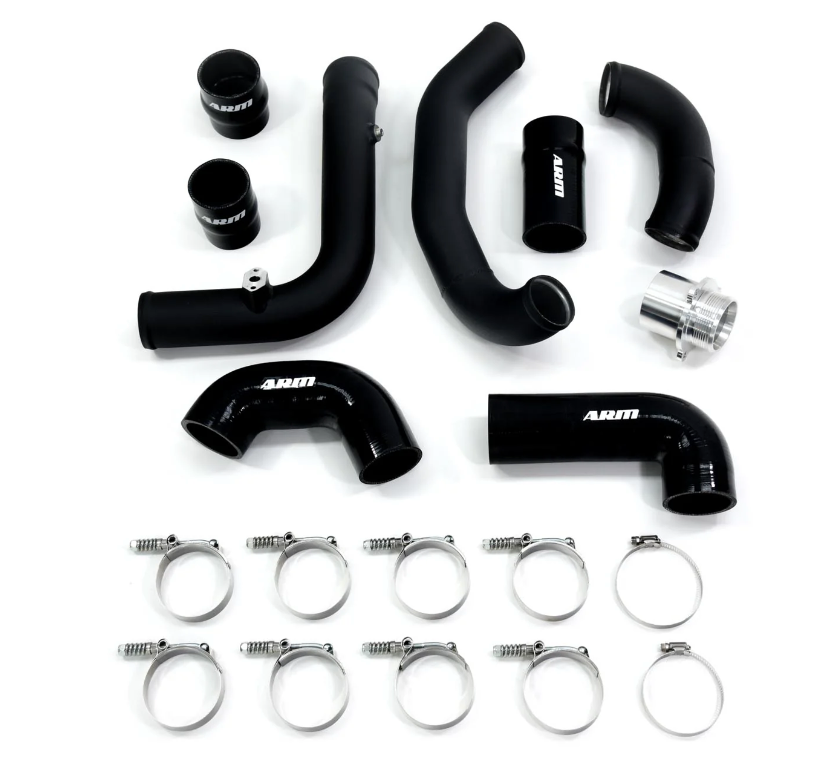The ARM Upgraded Charge Piping Kit for the MQB platform improves airflow by completely replacing the restrictive 1.5" factory plastic piping to and from your intercooler with full 2.5" T6061 aluminum piping coated in a durable wrinkle black finish.