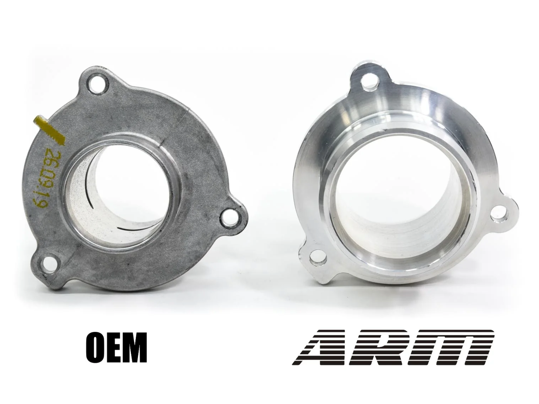 The ARM MQB Charge Piping Upgrade comes complete with the ARM precision CNC machined Turbo Muffler Delete.   While using the stock turbo muffler delete with its 1.8" size would have to expand to meet the ARM Charge Piping size of 2.5".  The ARM Turbo Muffler Delete offers a smooth transition from the IS20 or IS38 turbo to the first section of charge piping by maintaining the 2.5" diameter