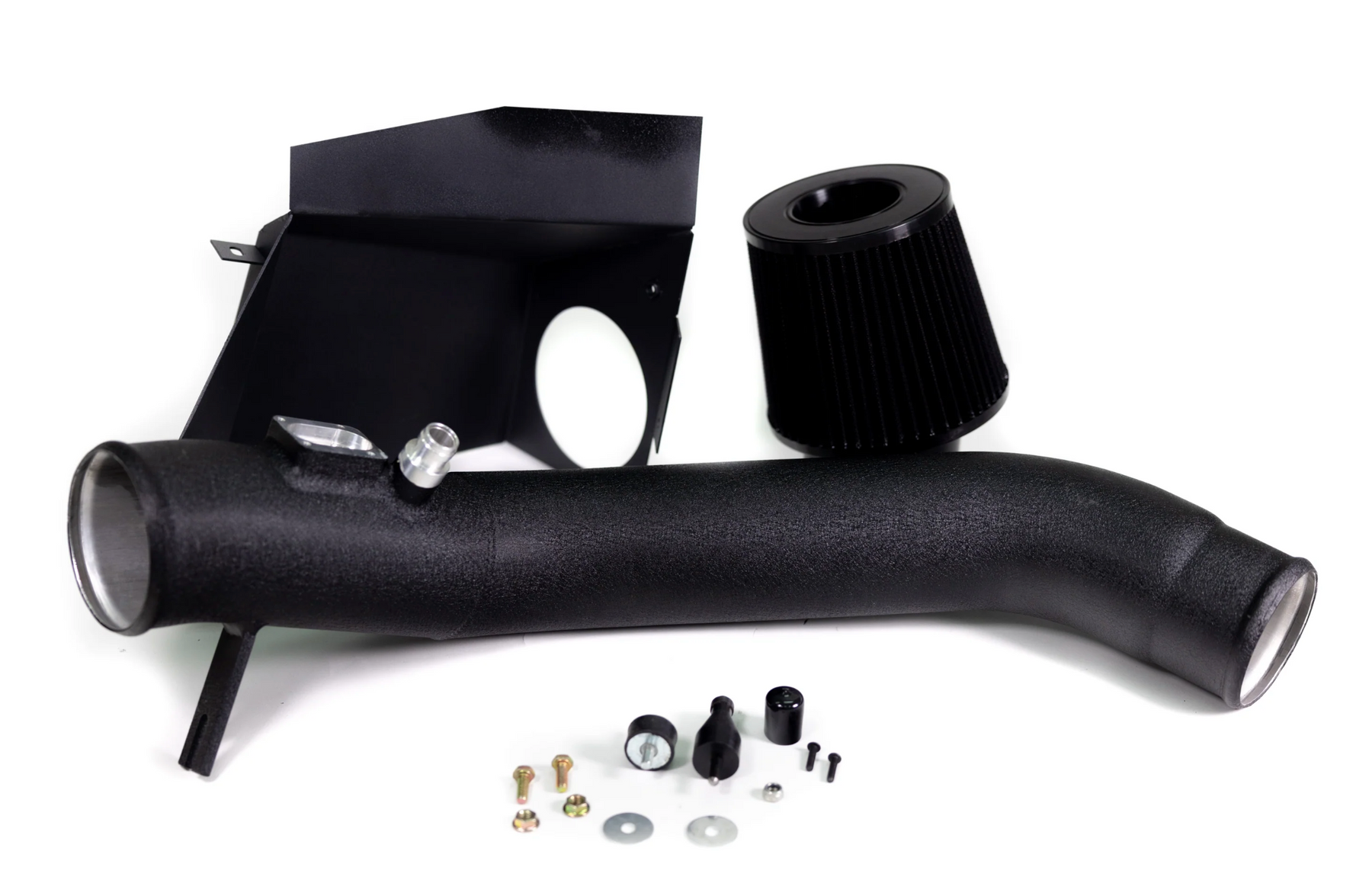 The ARM N55 Intake runner tube measures an oversized 3.5" at the air filter which then reduces down slightly to 3.3" to connect to the OEM N55 turbo inlet, or any aftermarket turbo inlet. The intake runner tube also incorporates a mounting bracket which is secured with the included mount to reduce vibrations commonly found with non-secured N55 intake kits.