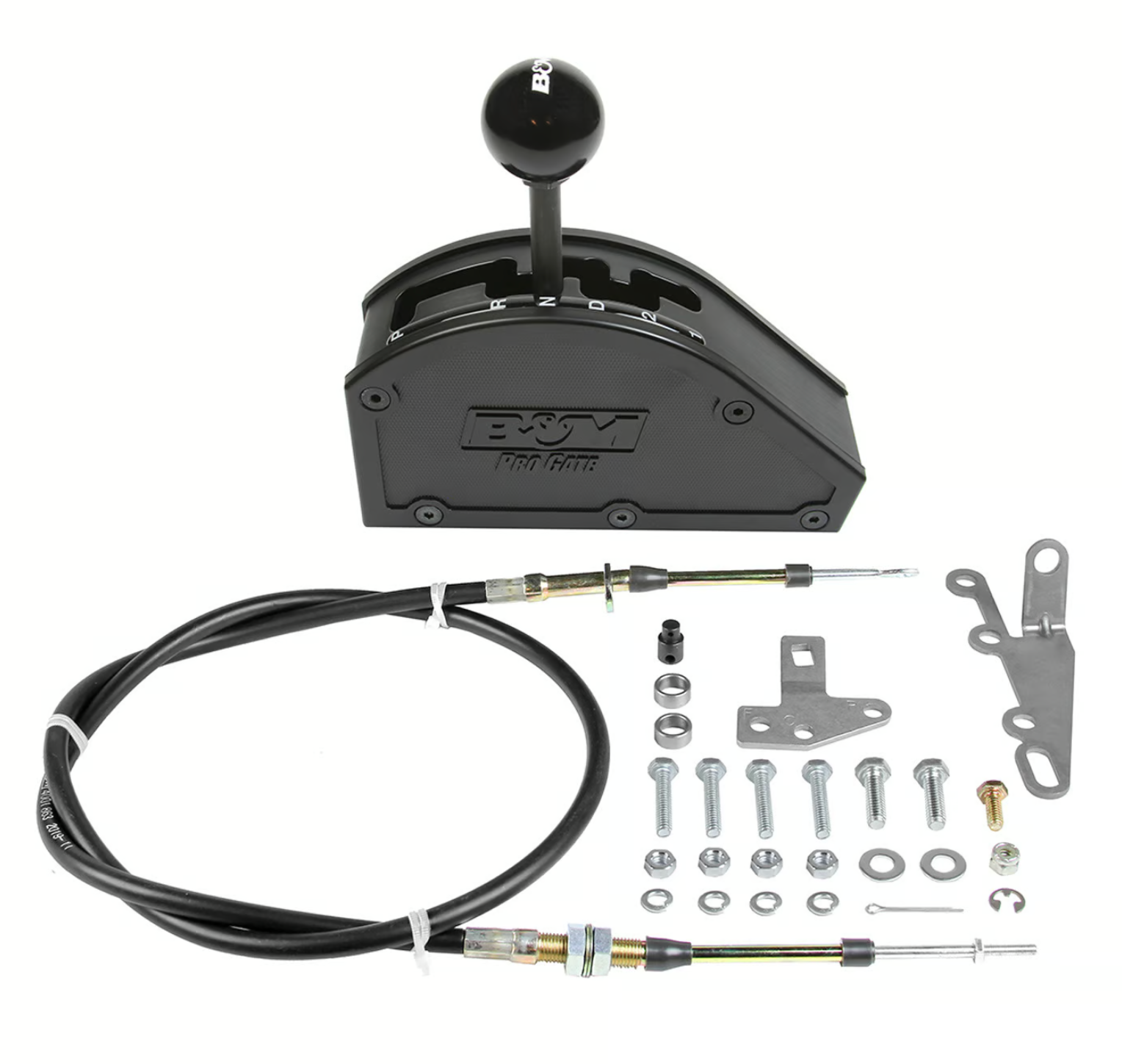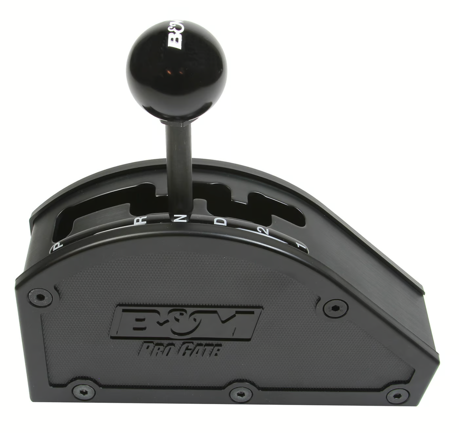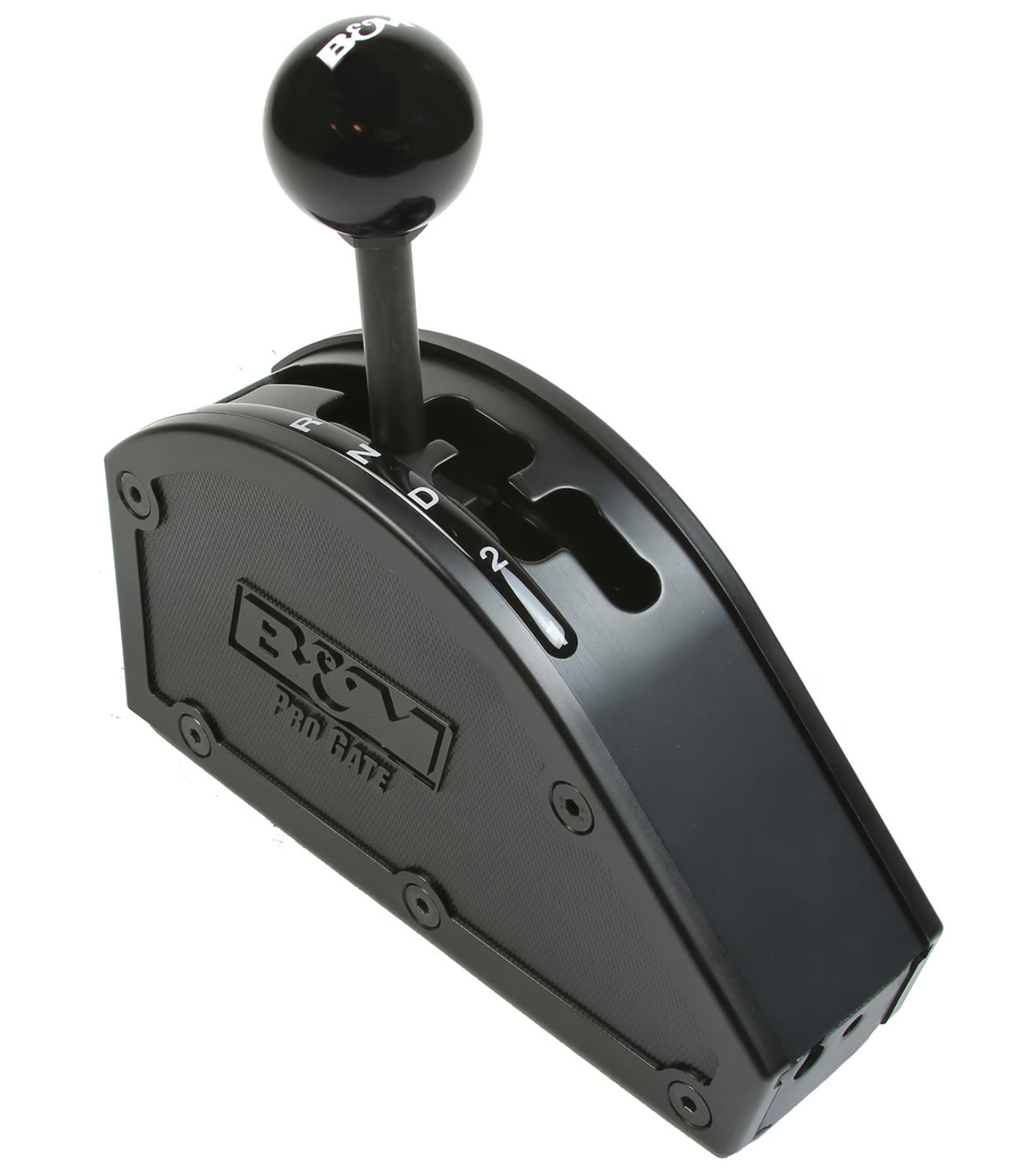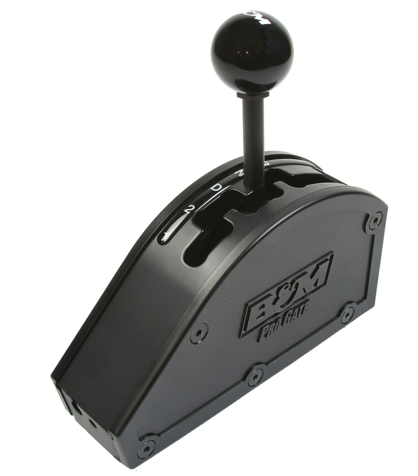 The B&M Pro Gate shifter is an externally gated race shifter for GM 3-speed automatic transmissions. The compact and lightweight design features a 10-gauge black oxide coated 304 stainless steel base with a heavy-duty 303 stainless steel shift pin for longevity and bullet-proof performance. The 1016 steel shift stick includes a black B&M logo shift knob for shifting duties while the external gate plate is constructed from black oxide coated 11-gauge 304 stainless steel for durability. The 3-speed gated forward shift pattern features a staggered shift pattern with positive stops between each gear for easy and precise shifts. Other features include thick injection-molded nylon side covers featuring a knurled texture with the B&M Pro Gate logo on both sides. The covers are removable for access to the virtually maintenance-free shifter sub-assembly and will not gum up with dirt affecting shift performance, which is ideal for Off-Road racing. The rear exit cable design includes a black 5-ft Super Duty race shifter cable along with a cable bracket, shift lever, and all necessary hardware for a straightforward installation. Includes Lifetime Limited Warranty. Overall Dimensions - 9.1L x 2.6W x 9.5H