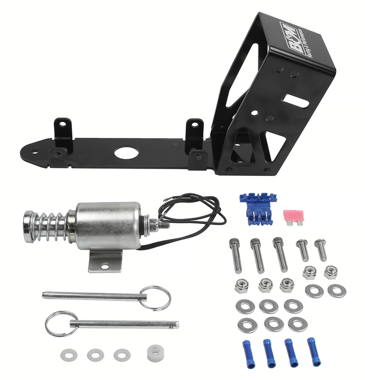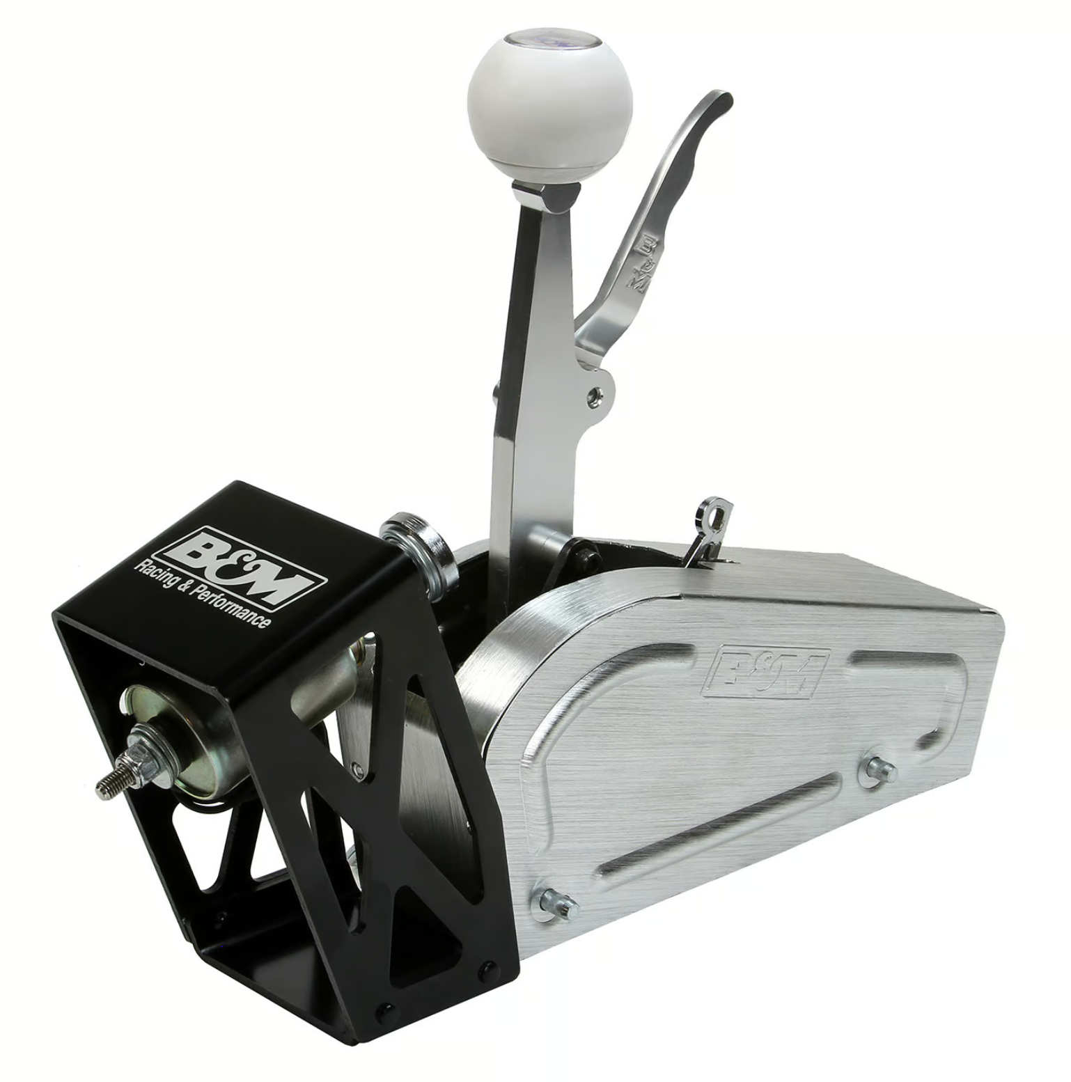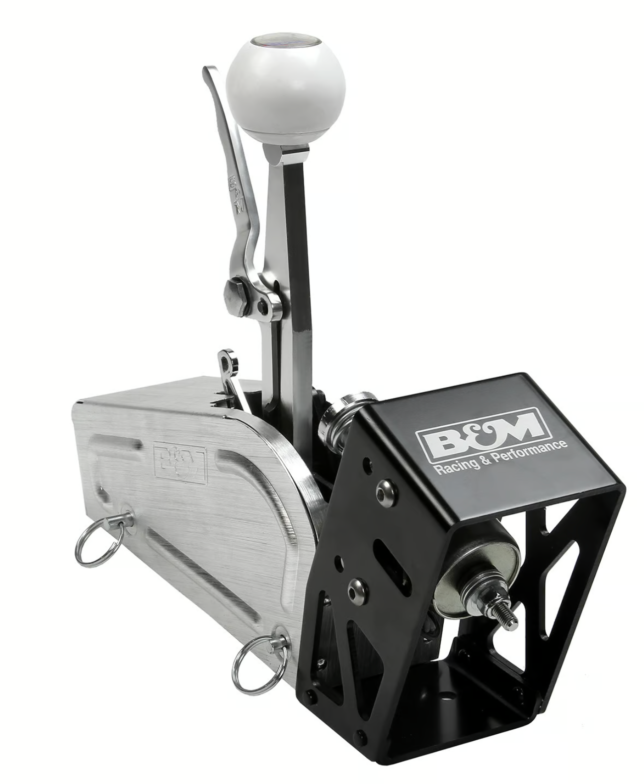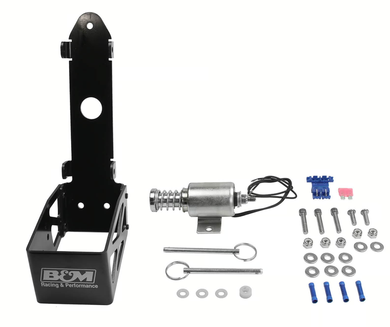 This B&M electric shift solenoid fits Pro Stick shifters. Built with 5052 aluminum brackets and heavy duty solenoids to provide positive and consistent 1-2 shifts. The brackets are mil-spec (military specification) black anodized with laser engraving for a clean, stealthy appearance and the low amperage draw will cause no charging concerns when the rounds get faster.