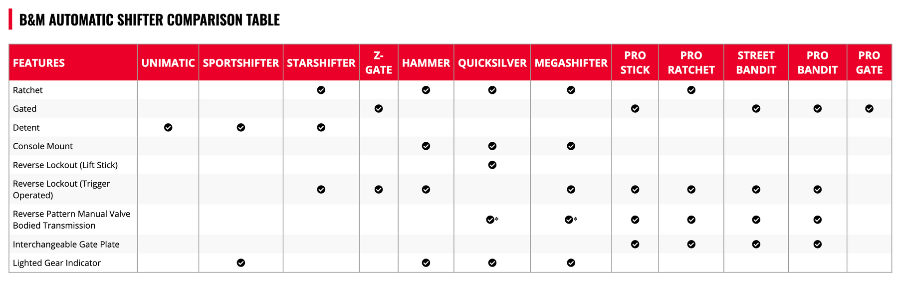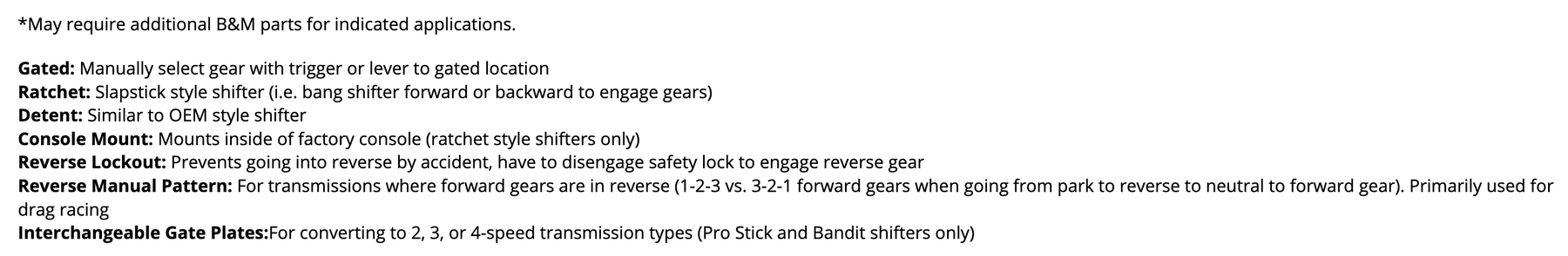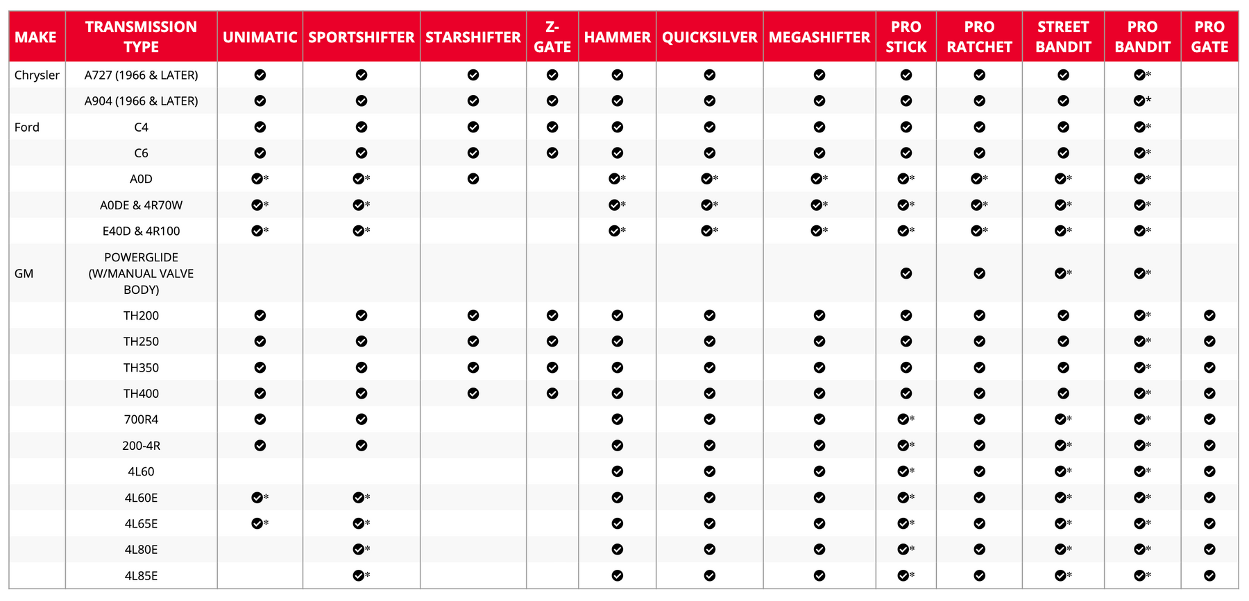 Fits GM TH400, 350, 250, 200, 700R4/4L60, 4L60E, 4L65E, 4L80E automatic transmissions (for 4L60E, 4L65E, 4L80E with PRNDL switch, use optional bracket kit #70499. Ford C4, C5, C6 and AOD (AOD will require optional kit#40496) AODE, 4R70W #40504 and E40D & 4R100 will require optional kit #40505. Fits Chrysler 1966 and later Torqueflite A727 (36RH/37RH), A518 (46RH/46RE), A618 (47RH/47RE/48RE), A904 (30RH), A999 (32RH), A500 (40RH/42RH/40RE/42RE/44RE) automatic transmissions.
