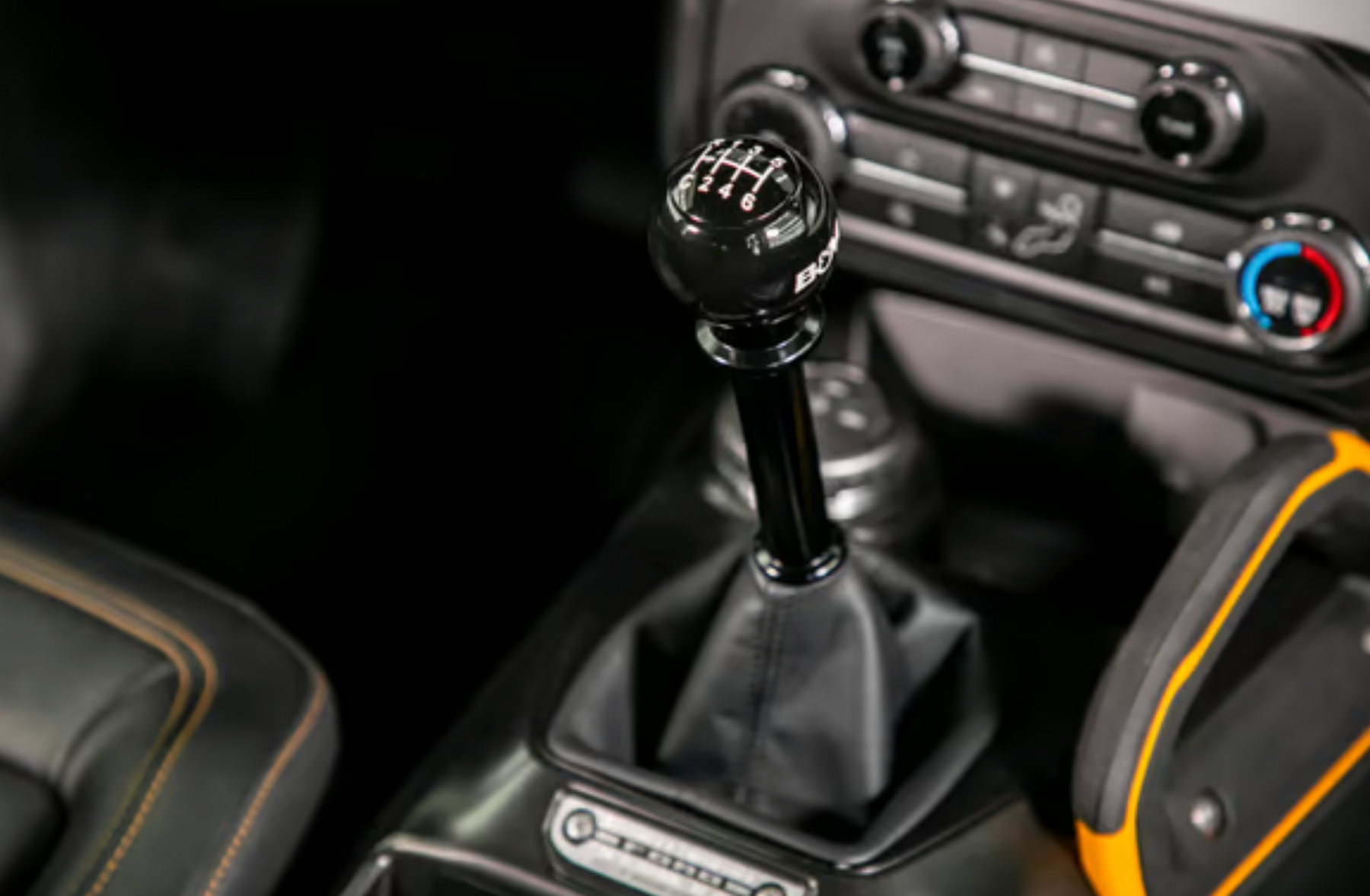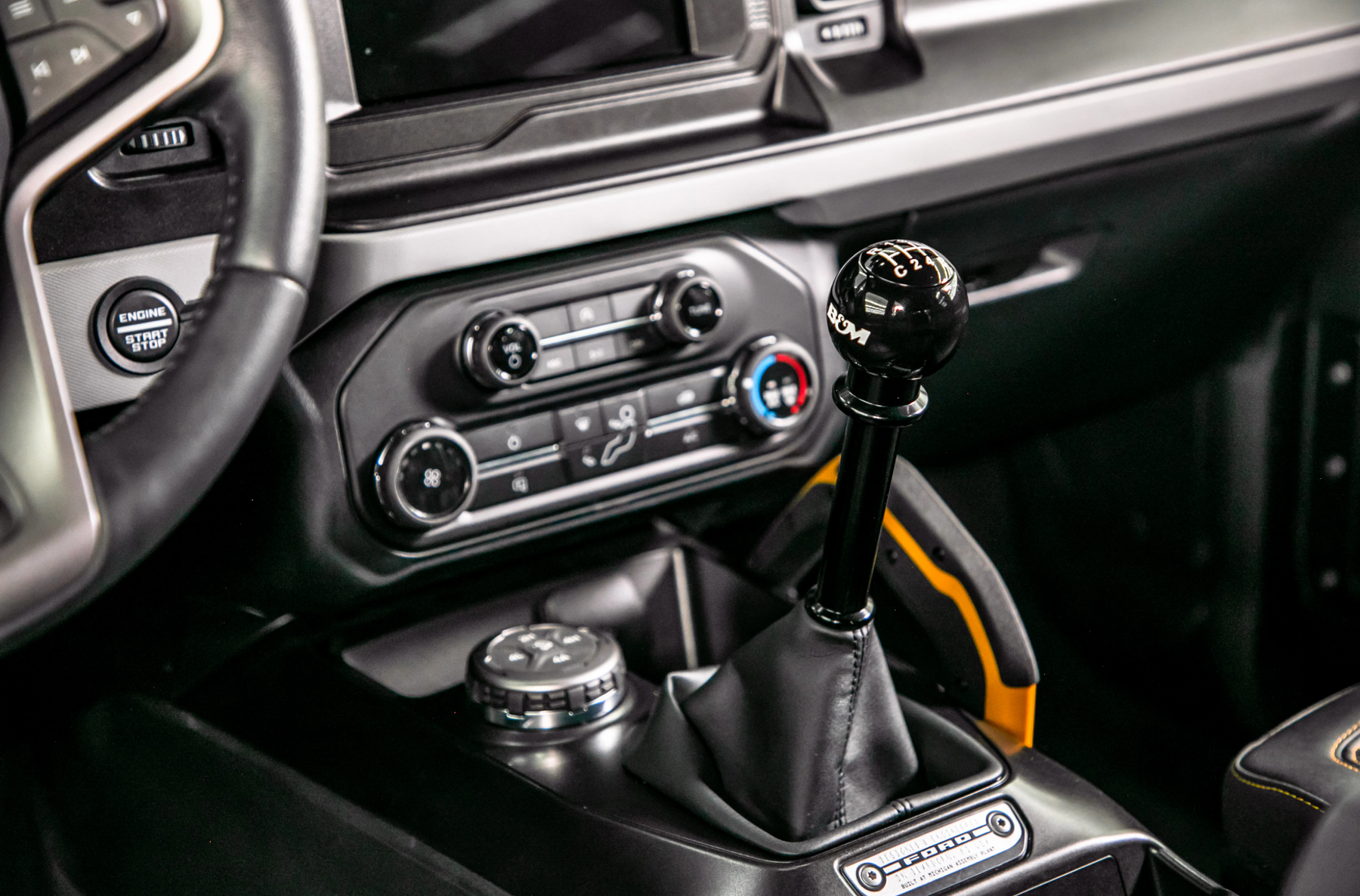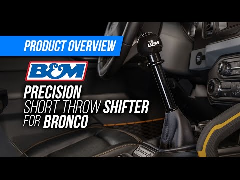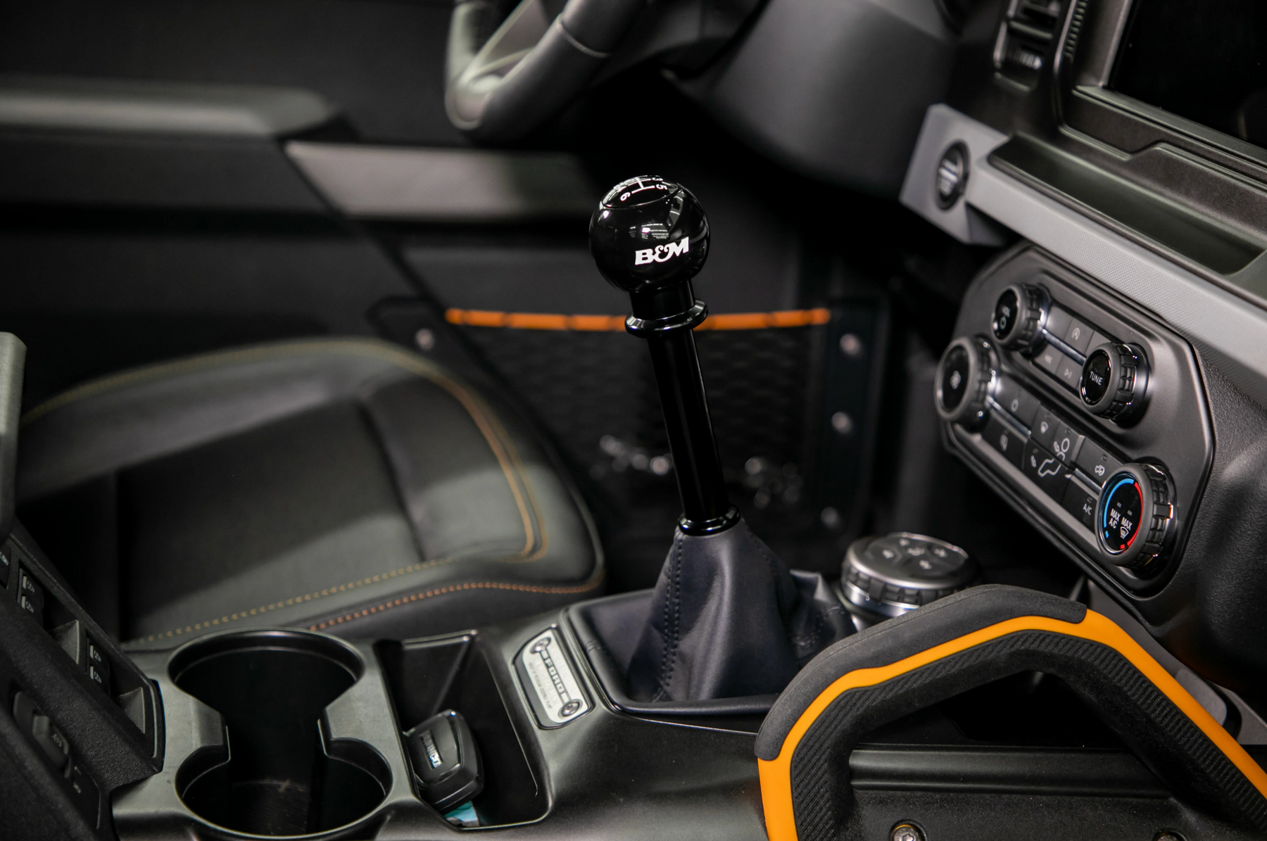 This B&M Precision SportShifter for the modern Bronco platform with the 2.3-liter Engine and 7-Speed manual transmission includes a 303 stainless steel stick with an anodized aluminum pivot. Our design reduces the throw by a massive 40% over the factory shifter and provides a shorter more positive feel when shifting gears. To help accomplish this, we increased the stick height by almost 3 inches to create a much more ergonomic shifter position. The factory shifter sits lower than the center console, but ours sits in line with it so you can rest your arm on the console and shift more comfortably. The factory leather shift boot is also retained and attaches to the new black anodized aluminum lockout slider to smoothly and easily actuate reverse. The included black round shift knob shows the shift pattern on top and B&M logos on the sides, both filled in white to tastefully compliment the interior of the Bronco. Also, this shifter has 100% compatibility with the factory knob, so if you want to retain your leather-wrapped knob instead of the B&M knob, you can do so. Finally, the SportShifter attaches directly to the OEM shift cable and includes installation instructions and all hardware necessary for an easy at-home installation.
