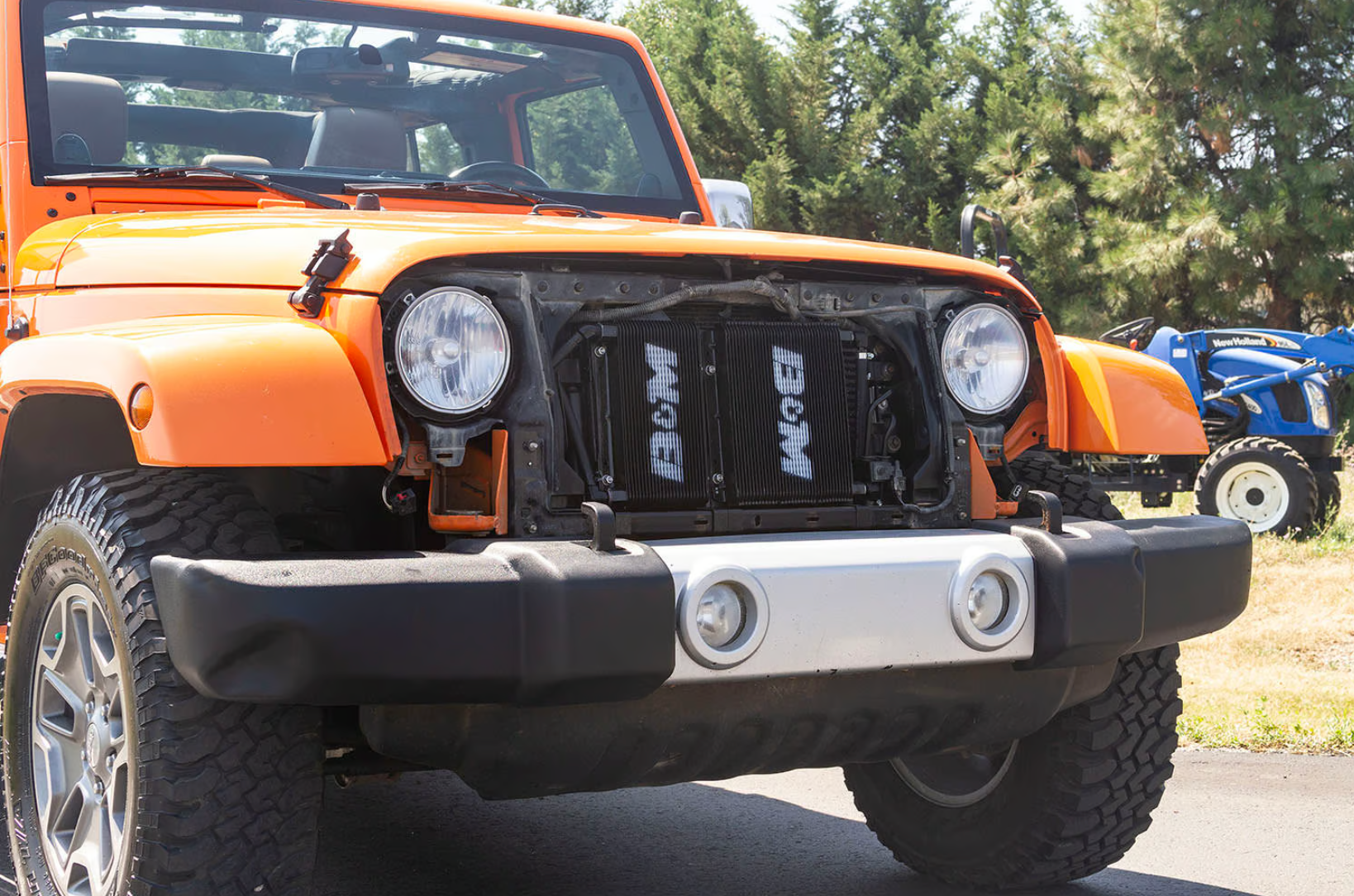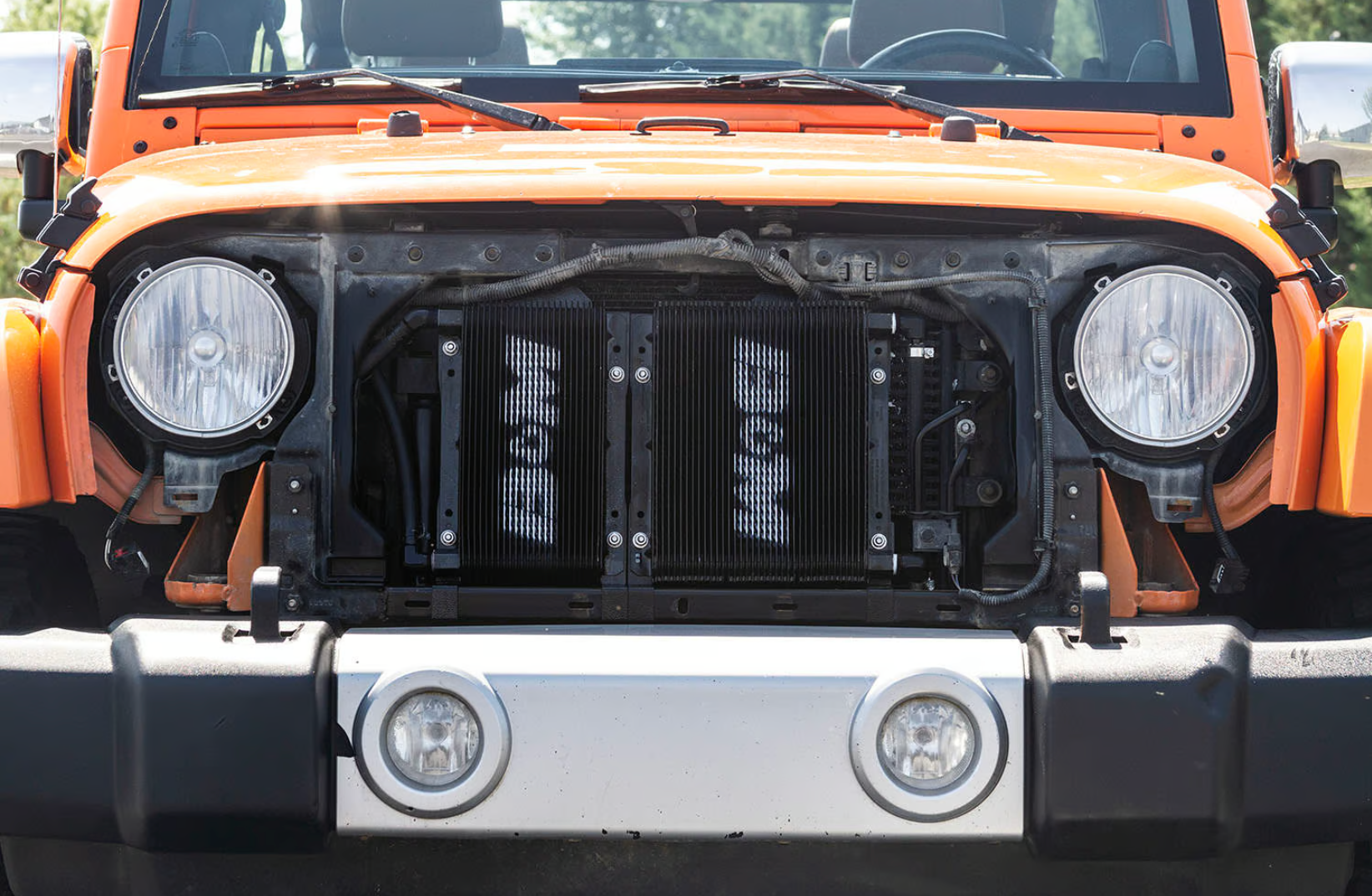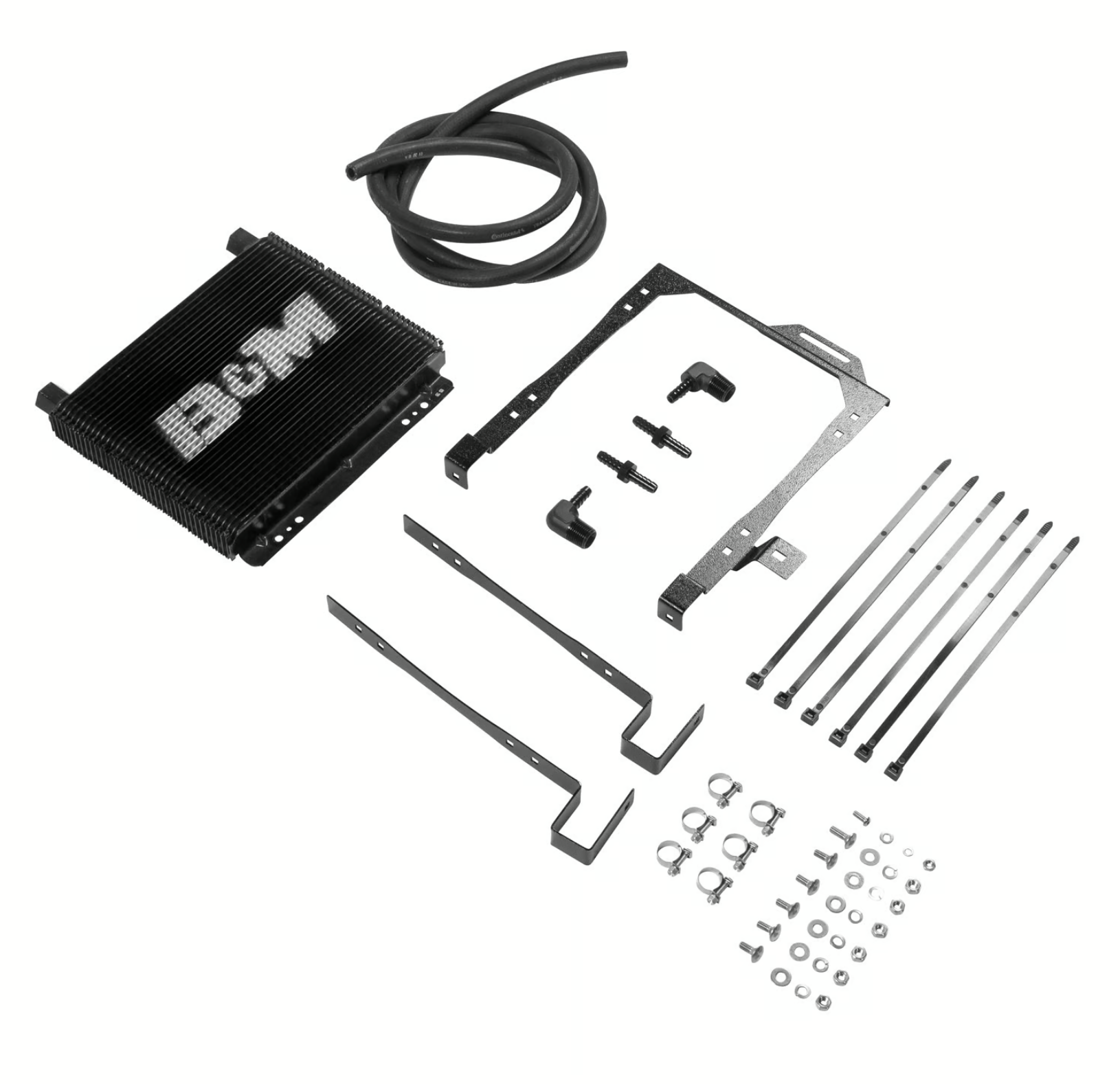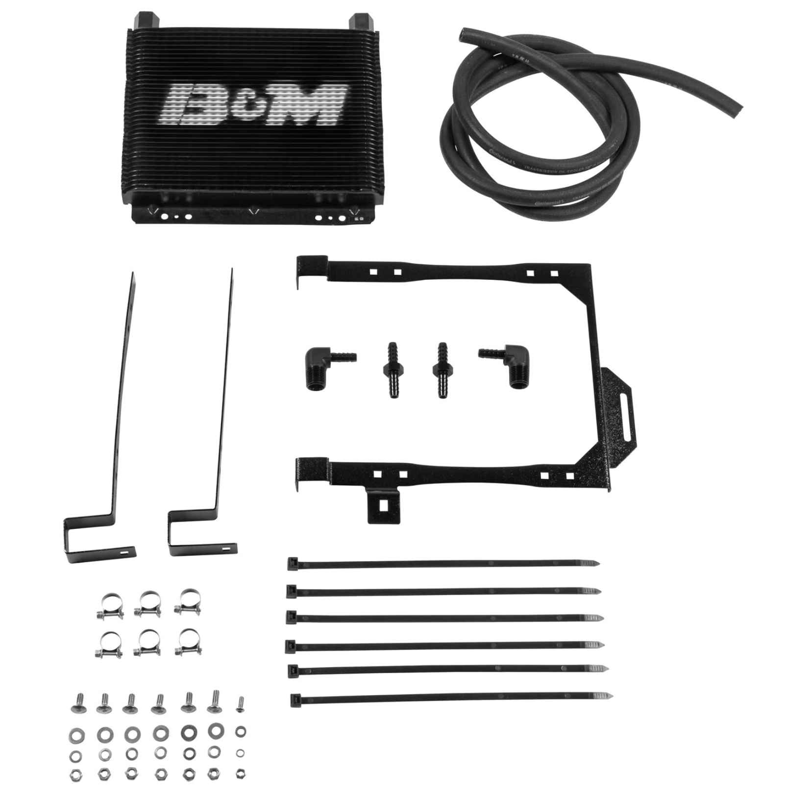This B&M direct fit automatic transmission cooler for Jeep Wrangler JK models is a great way to drop transmission temperature whether you are on-the-trail or stuck in bumper-to-bumper traffic. Cooler transmission fluid can lead to longer transmission life. This kit includes a stacked plate style B&M SuperCooler (20,500 BTU), black powder coated direct-fit brackets, anodized aluminum fittings, high quality rubber hose, and stainless steel hardware. The cooler features the B&M logo stenciled onto the face. Perfect for vehicles with larger wheel/tire combinations. This cooler can also be used alongside the B&M power steering cooler kit 70301.