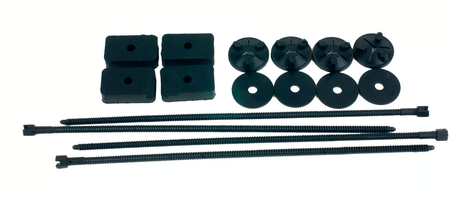 This B&M Hi-Tek mounting kit is an easy mounting system for B&M SuperCoolers is available separately for remounts or additional cooler support. Includes 4 nylon mounting rods, 4 nylon slip-on locking nuts, and 4 sponge rubber pads.