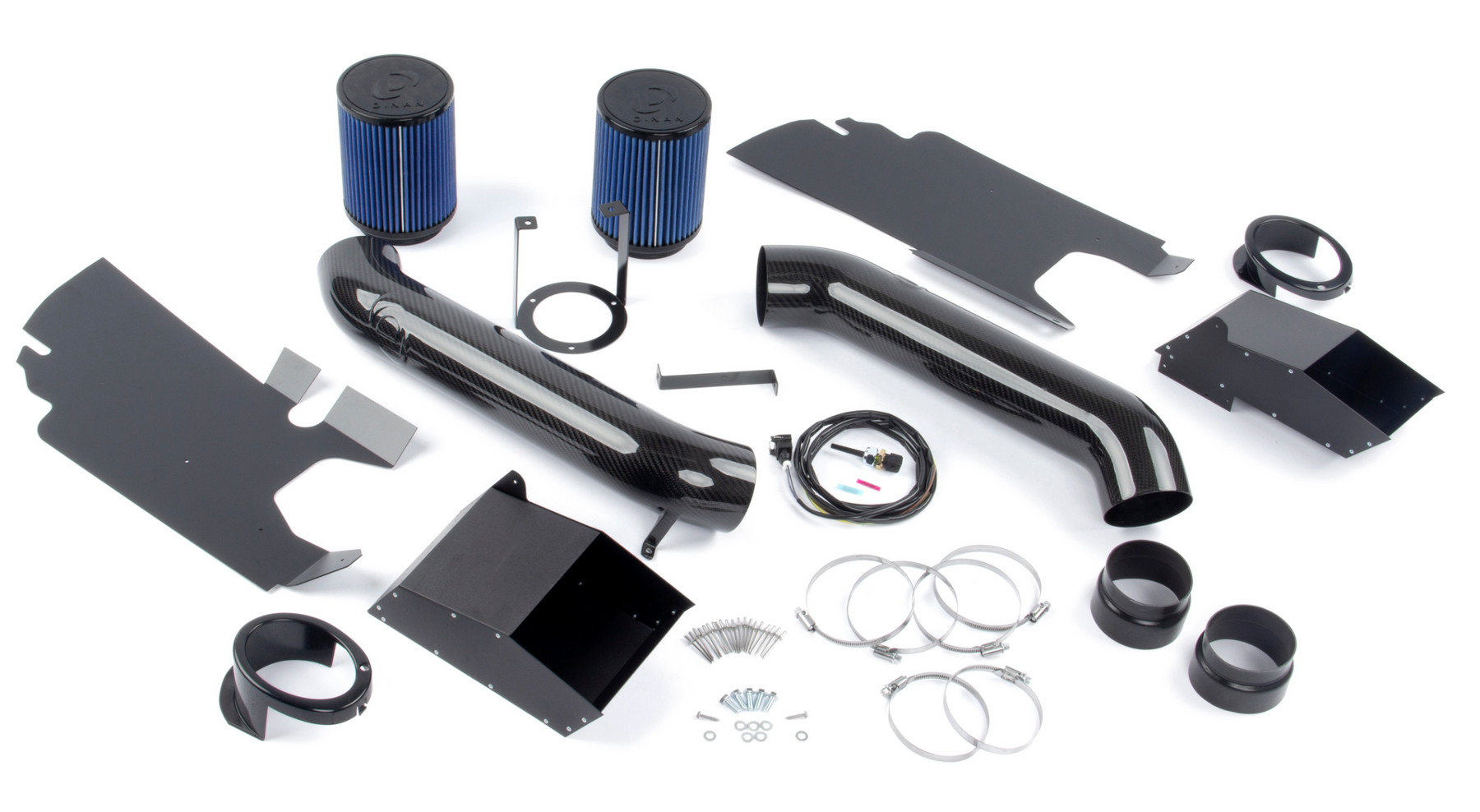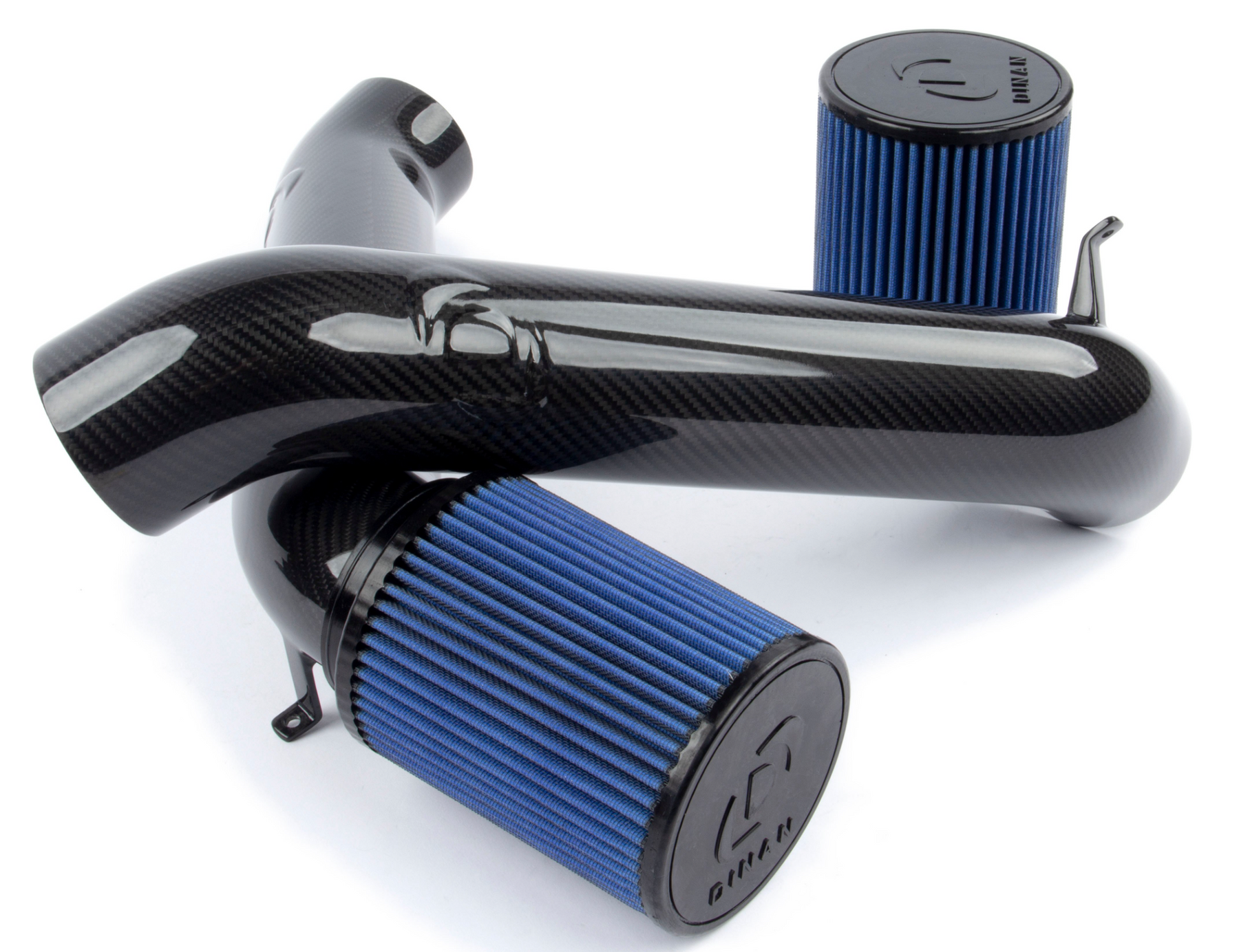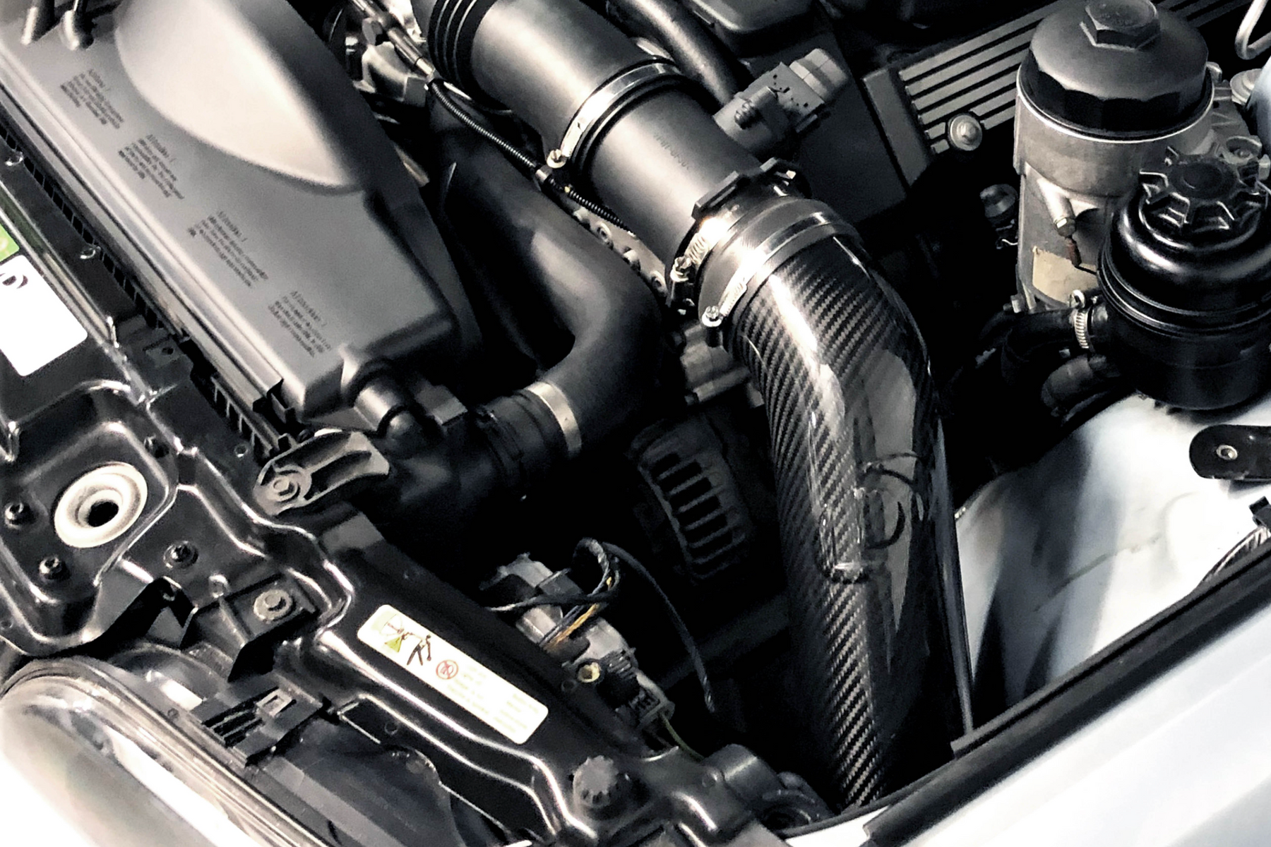 The design goal for the M5 High Flow Cold Air Intake System was very specific: ensure that the powerful M5 engine is breathing plenty of cool oxygen-rich air for maximum performance under varying driving conditions. The system replaces the factory air-boxes with proprietary twin high flow air filters feeding large diameter intake plumbing, carefully designed to minimize air turbulence for maximum intake airflow. The filters are relocated outside of the engine compartment behind the front bumper and below the headlights insulating the intake from under-hood heat. Additional heat shields are incorporated in order to block the flow of power-robbing hot air passing over the radiator. The system also includes modified fog light trim rings for a ram air effect at speed. Ongoing development of the intake system revealed an interesting and significant discovery. Based upon exhaustive testing, it was determined that the stock location of the air temperature sensor within the Air Mass Meter was providing the engine management system with an artificially high reading, resulting in reduced power output. The culprit was determined to be ''heat soaking'' of the Air Mass Meter when an adequate flow of air was not passing over it, such as in daily stop and go traffic, producing a reading substantially higher than the actual temperature of the air entering the intake system. BMW's sophisticated engine management system would then automatically back off timing as a result, reducing available power until such time as the airflow cools the Air Mass Meter down. Therefore, the Dinan intake system includes an air temperature sensor relocation kit as part of the system, providing the engine management system with a more accurate reading and consistent performance. The newest iteration of the system goes back to its carbon fiber roots for a more showroom worthy appearance complete with an embossed Dinan logos instead of the inset Mylar decals that was prone to marring after decades of use.