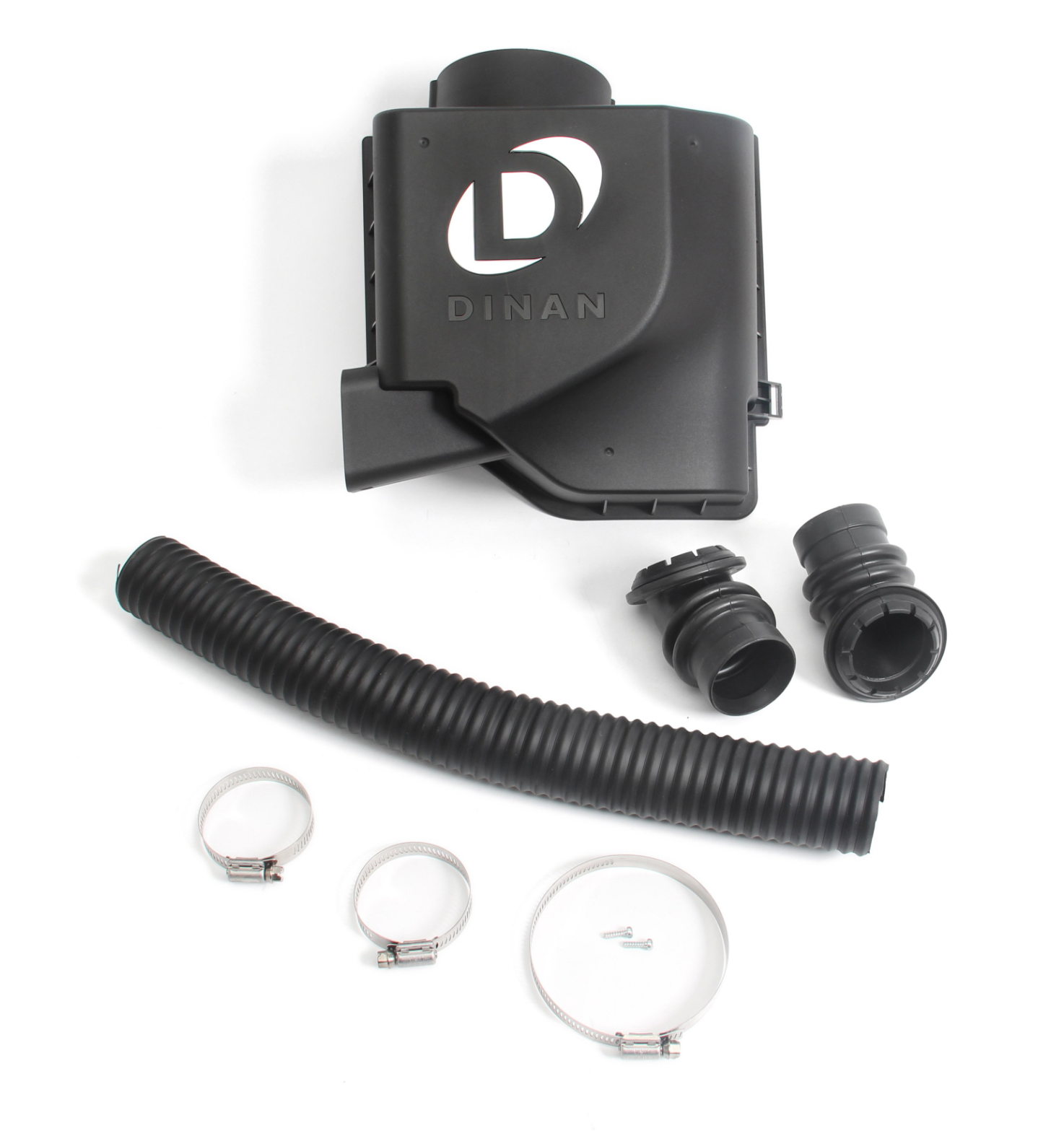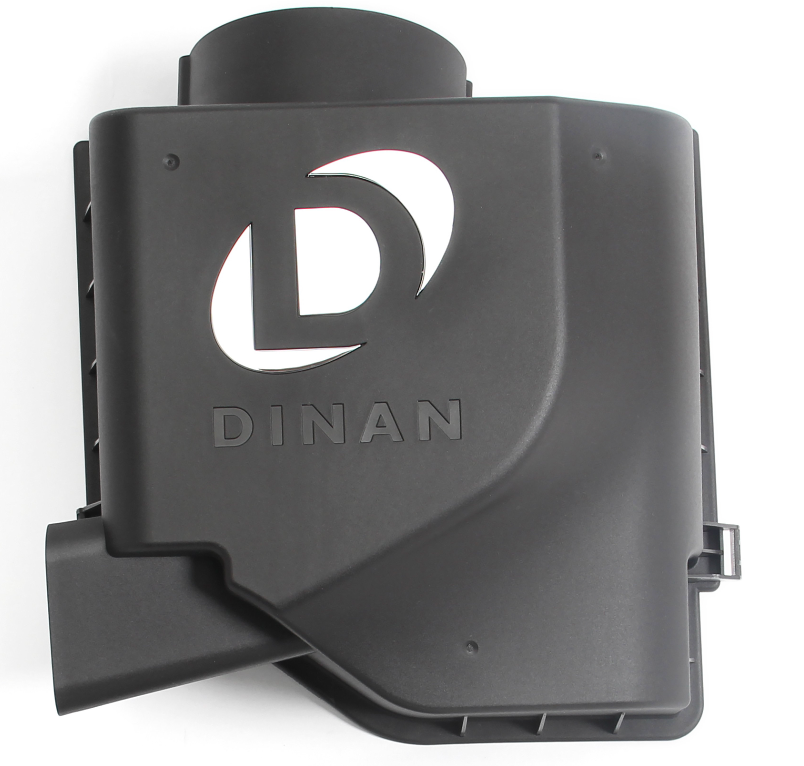 Dinan's High Flow Intake System consists of an injection-molded replacement lid for the stock airbox designed to increase overall volume and accommodate a high flow filter element for optimum intake air-flow. The lid is manufactured using a special composite material, chosen specifically for its ability to resist power robbing under-hood heat. The lid also incorporates an O-ring, completely sealing the air box for maximum pressurization and further insulation against heat-soaking, optimizing performance under varying driving conditions. The System also includes a secondary intake duct that scoops up additional cool, oxygen-rich air via the factory brake cooling duct, further improving performance as road speed increases.