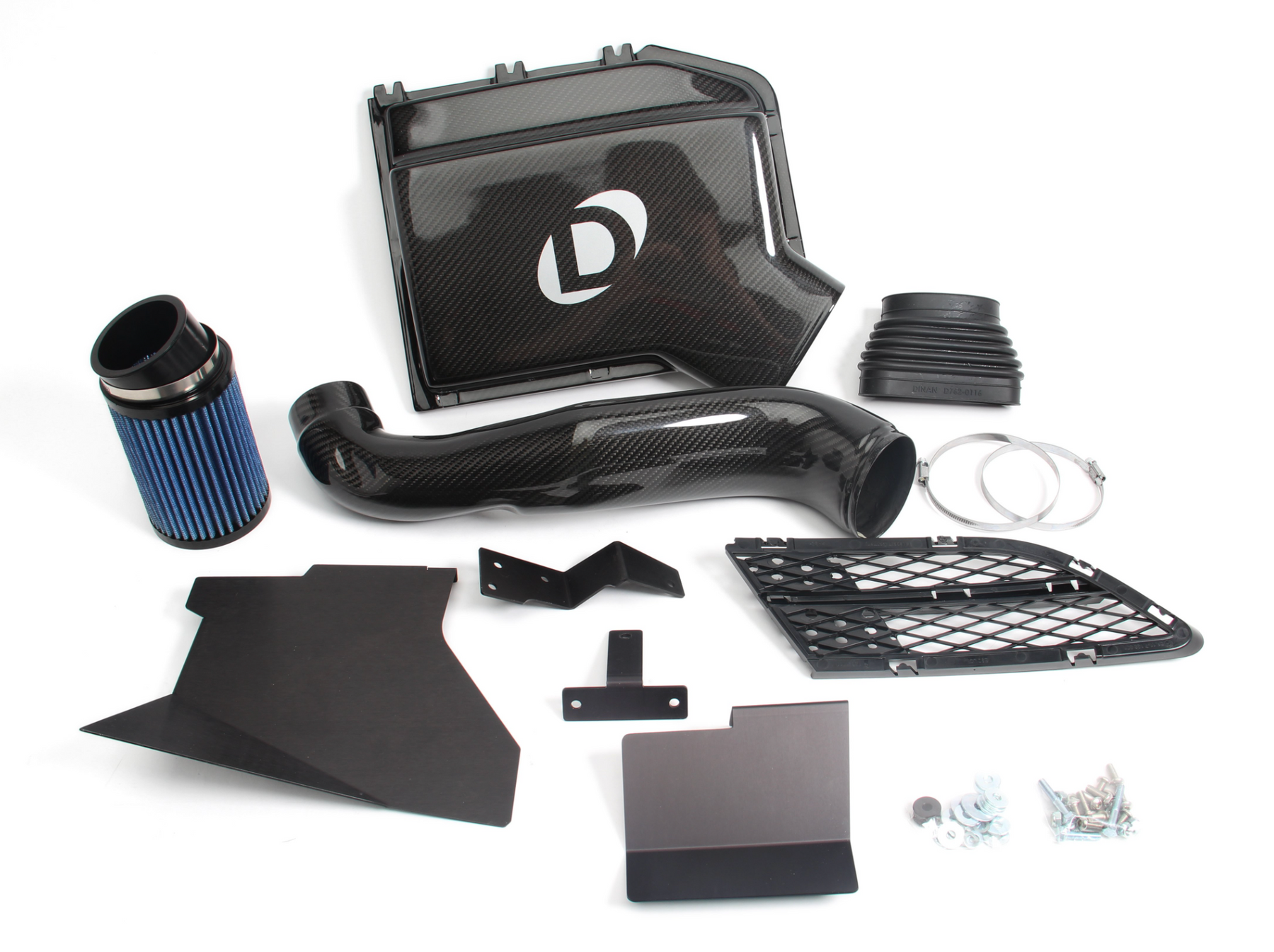 As boost is increased through the use of performance software, the single factory intake becomes restrictive and the engine is lacking the air it needs to make maximum power. Our cold air intake force feeds the 3-liter turbocharged inline 6 with greater volumes of cool, oxygen-rich air for substantial power gains by utilizing our secondary carbon fiber intake. The system is so effective that the carbon fiber inlet air temperature is a full 40 degrees Fahrenheit cooler than the incoming air from the stock inlet. Due to the increased airflow from our intake, the power-curve is extended into the higher RPMs for a noticeable change. The system is a direct replacement for the factory air box lid, employing a hand-crafted carbon fiber unit that also includes a secondary carbon fiber intake tube that captures cool air from the lower grill and includes the shielding for the conical filter to insulate it from power-robbing engine compartment heat.