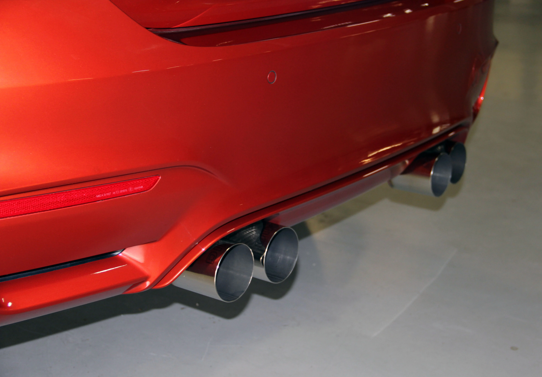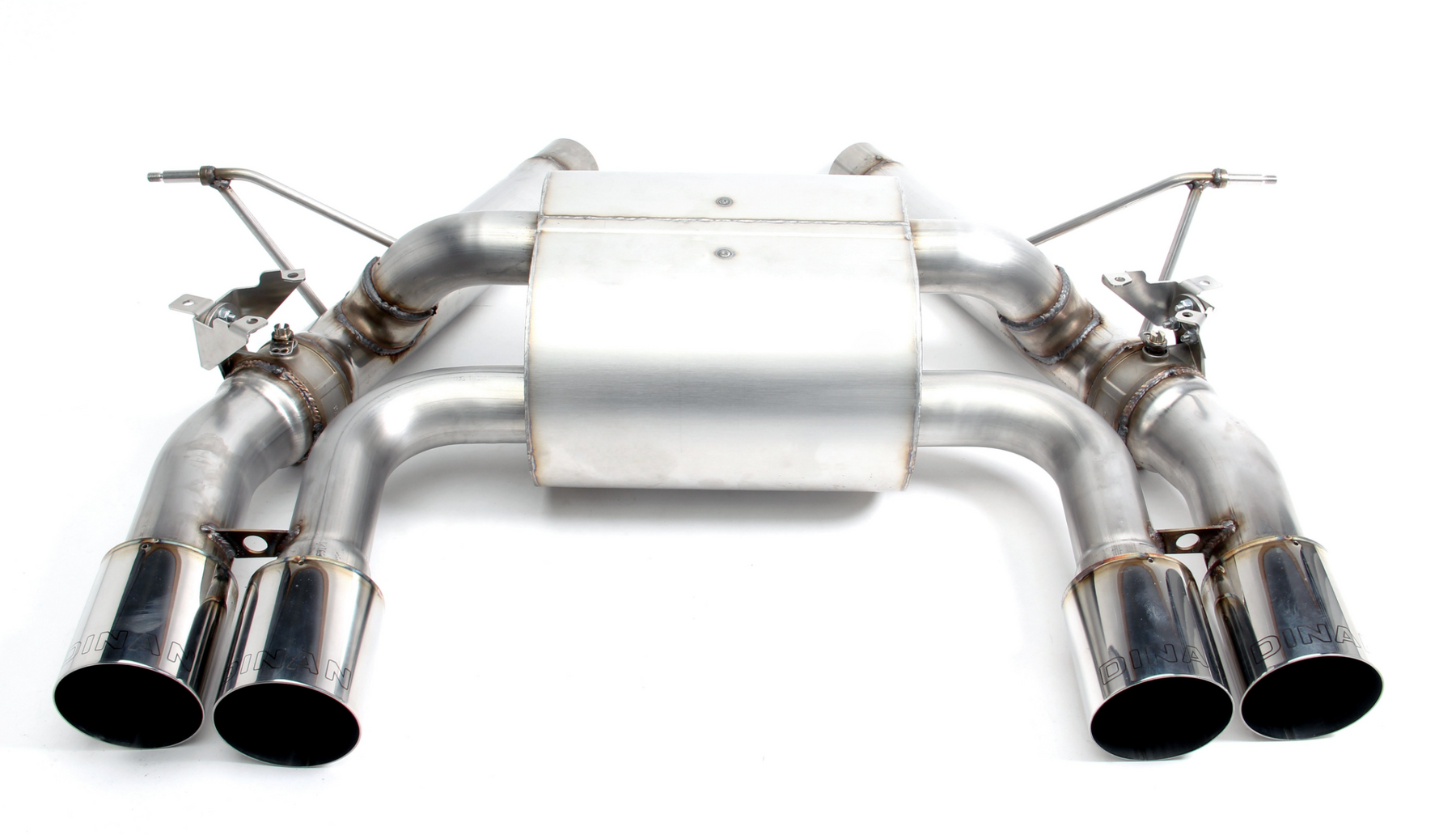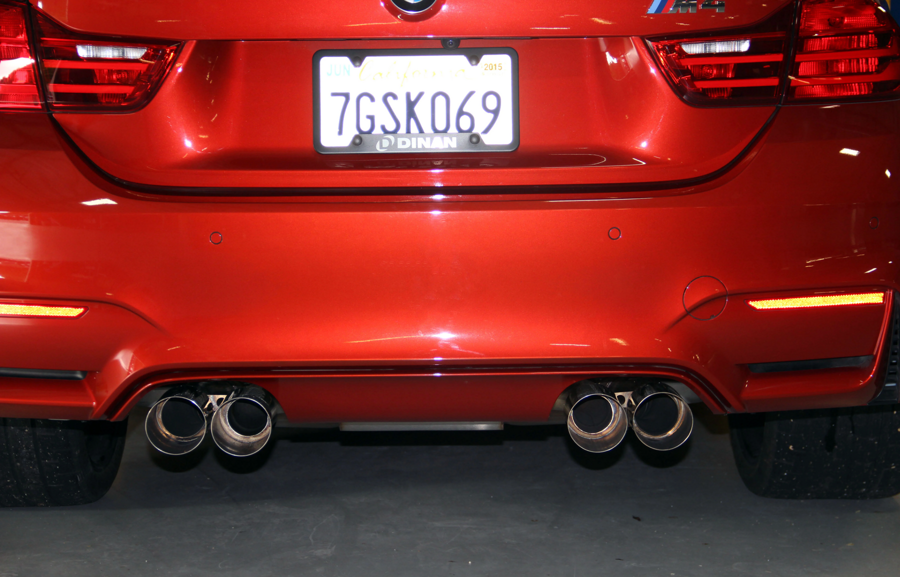 The F8x M3/M4's are an audible treat right off the showroom. Coupled with a Dinan exhaust however they become a symphony of aural delight that even the most discerning ear will find pleasing. Dinan's Free Flow axle-back exhaust system features 100% stainless steel construction measured to exact specifications to ensure proper fit via factory hangers and mounting points. Dyno tuned for maximum exhaust flow with minimum backpressure, this system is designed to provide a more aggressive sound under acceleration, while reducing drone inside the vehicle, thanks to computer-controlled valves that limit noise during low-speed driving and open fully during high-load conditions to allow free flow. The exhaust gasses exit through larger laser engraved polished, or ceramic black, quad tips. Every Dinan product comes with our industry-exclusive factory matching new car bumper to bumper warranty and is designed and tested in Morgan Hill, California and can be purchased and installed at any Dinan Approved BMW dealership nationwide.