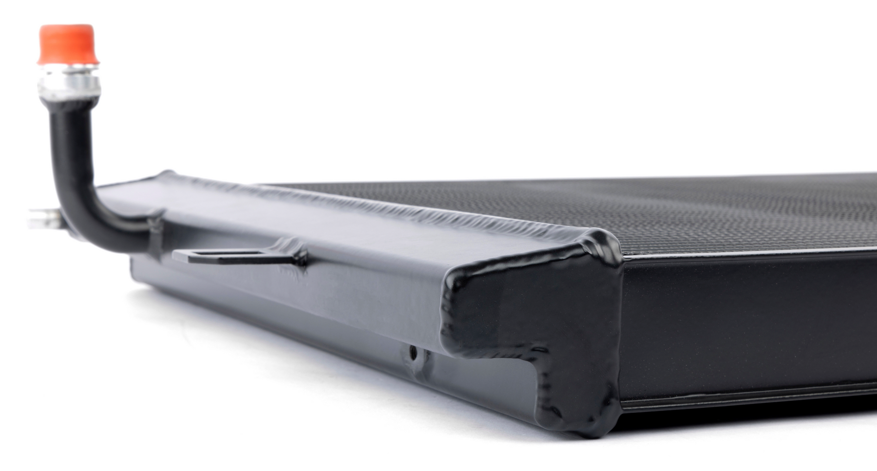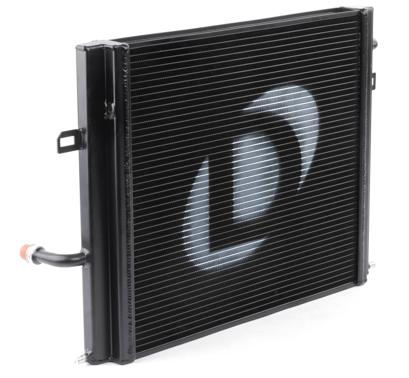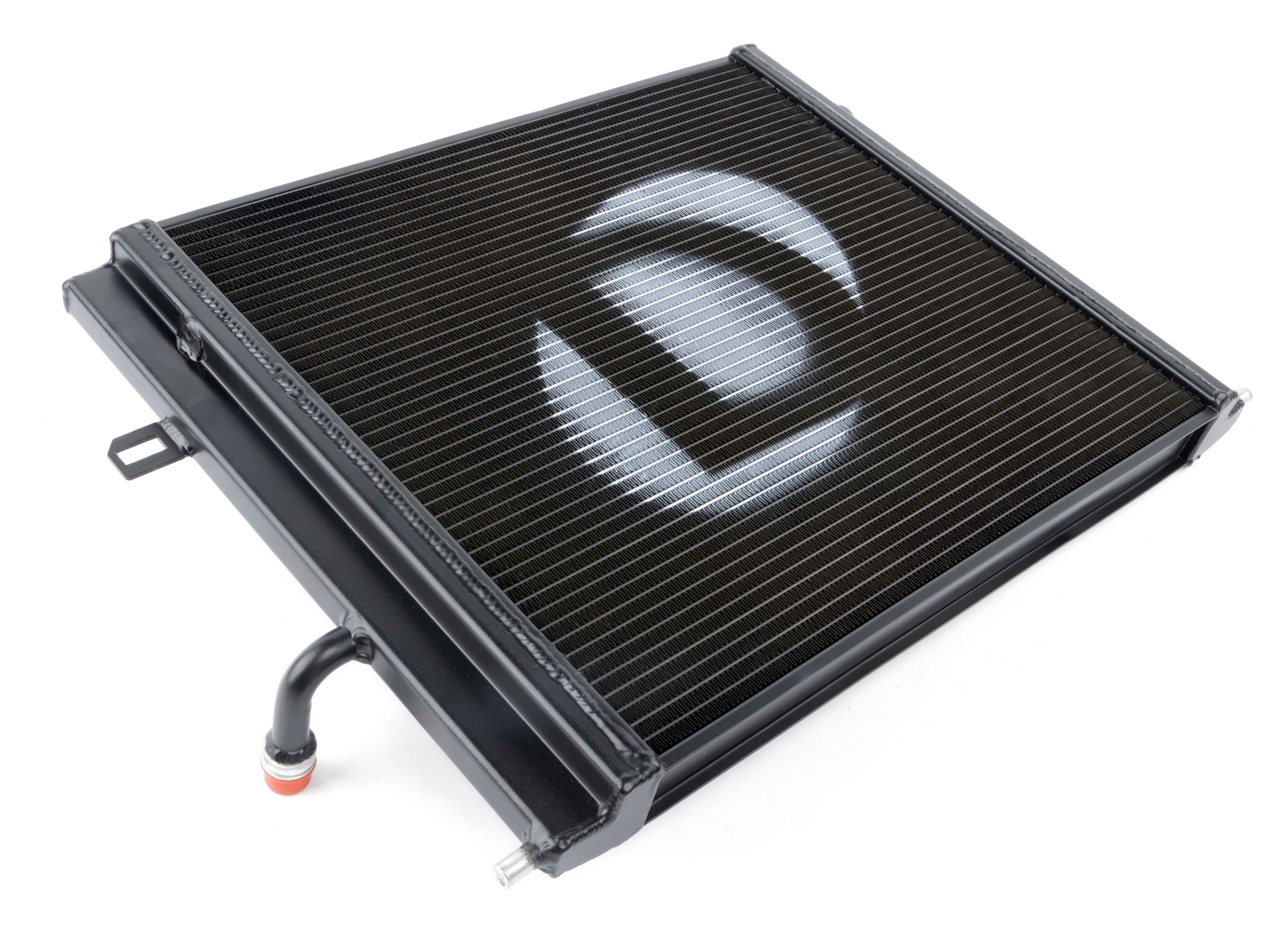 The factory B4x/B58 heat exchanger is not built to cater to the rigorous demands often associated with a modified build. The thin core is easily overwhelmed with IAT's rising dramatically once pushed beyond a few successive WOT pulls or even a few minutes at the track. This elevation in temperature gives way to the factory ECU fail safes pulling timing and reducing overall power in order to keep the system from overheating to the point of permanent damage. On an application where enjoyment is directly attributed to pushing the platform to its limits this constraint to cooling presents a challenge for the automotive enthusiast. The Dinan B4x/B58 heat exchanger for the F2x/F3x chassis assists in mitigating these issues with a more robust core (48mm thick Dinan core vs. 27mm thick OEM core) that wields 78% more heat transfer surface area for improved cooling capacity. The significant increase in core thickness requires unique "L" shaped end tanks to be incorporated as well, which also contributes to the overall thermal mass (ability to absorb, store, and release heat) improvement beyond the OEM setup. With up to a 15° IAT delta recorded over stock the Dinan heat exchanger is ready, and able, to assist in extending your vehicles ability to deliver maximum performance time and time again for your driving enjoyment!