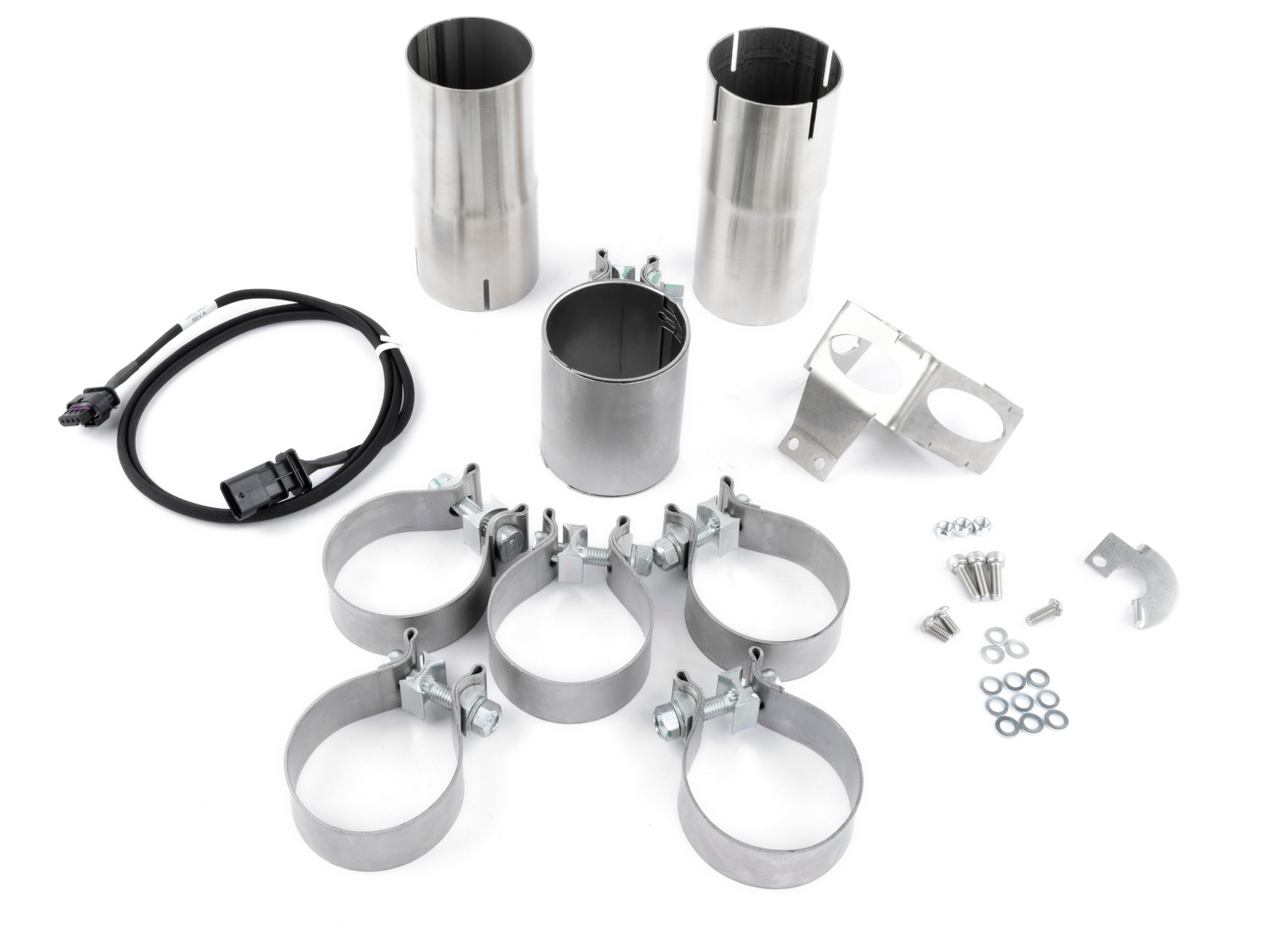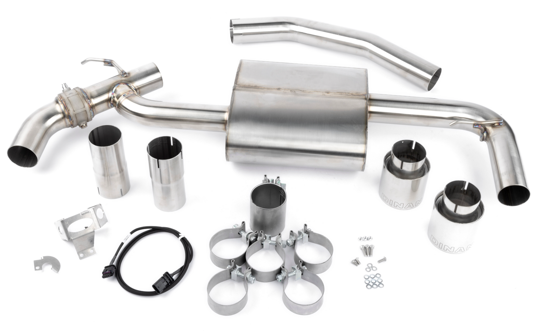 Dual 4" (102mm) double-walled, polished clamp-on tips with laser engraved Dinan logo