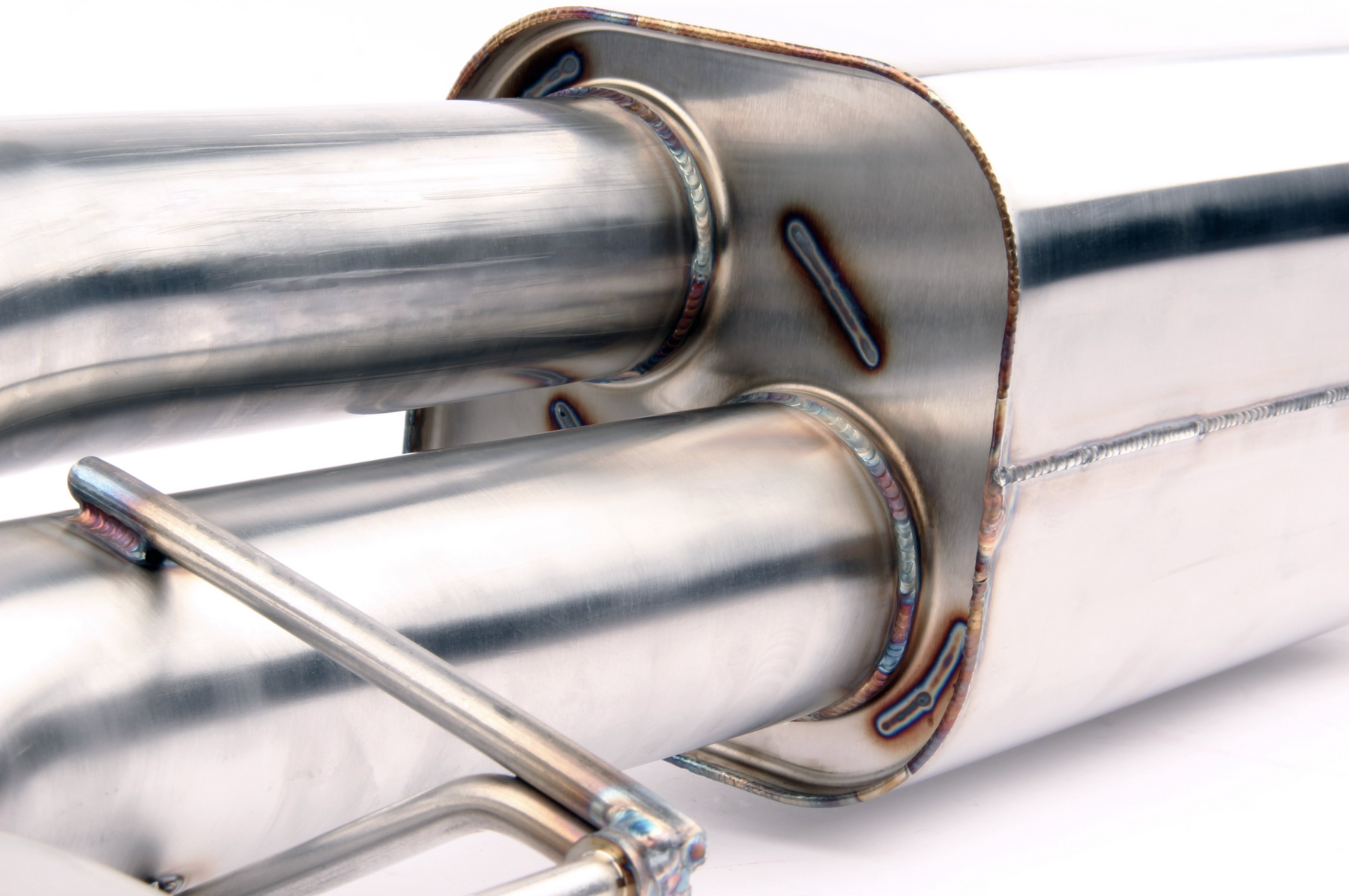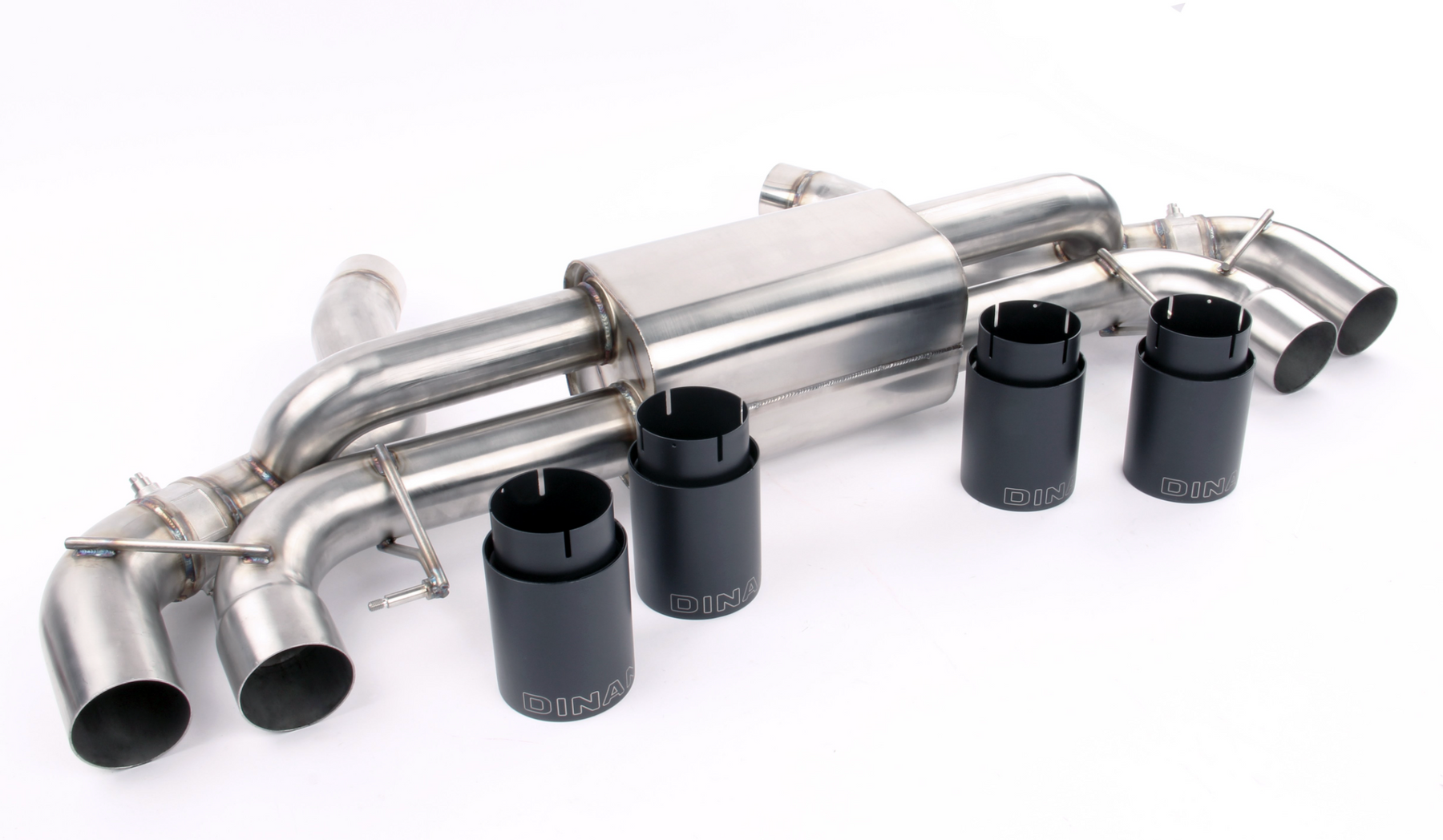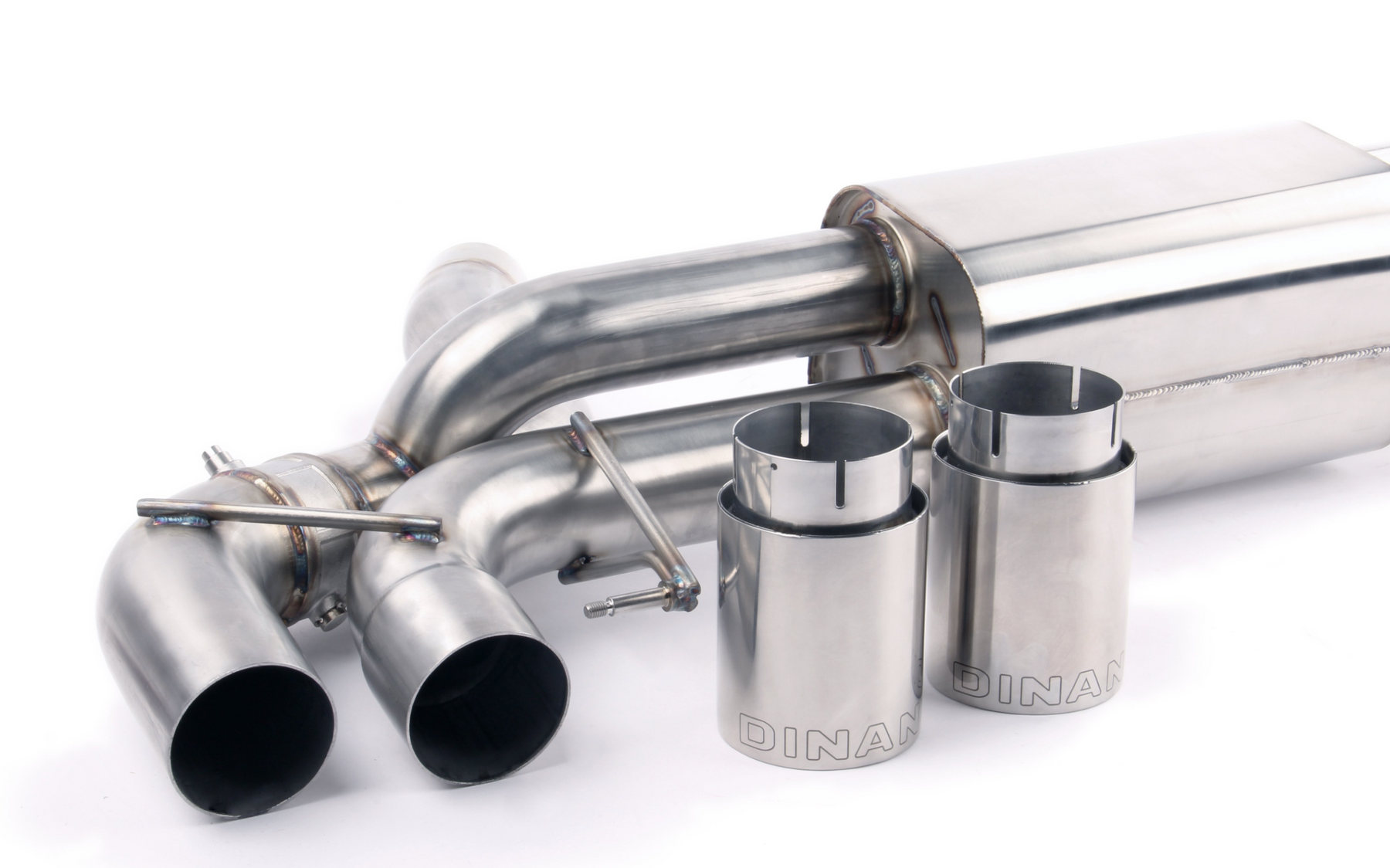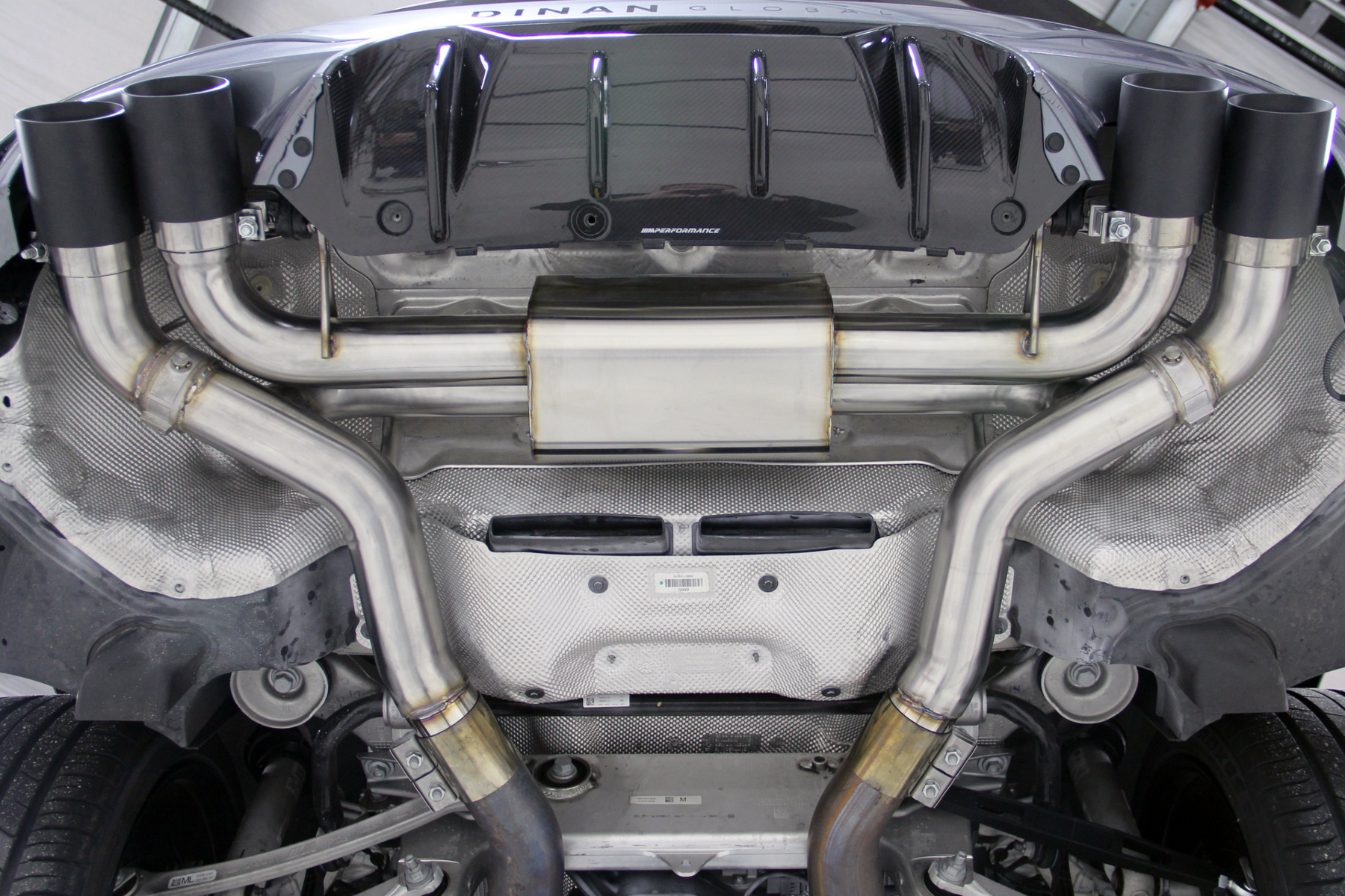 The F90 M5 has impressed users and critics alike with its awe-inspiring power, effortless delivery, and general embodiment of what BMW has always been about - refined performance. Form and function reign supreme from the factory in true German form. On the other hand, other aspects may not be as carefully cultivated. The stock exhaust note on the F90 M5 as an example, while no slouch, is probably best described as having a subdued aggressive note. Dinan believes for such a powerful and impressive car however that the vehicle deserves to be able to bellow a bit louder and more aggressively. The F90 M5 is the alpha on the public roads after all. Dinan's goal is to let the machine sound the part in addition to performing it. With Dinan, there is no reason to sacrifice anything in the process to meet that goal either. Whether that be in the form of drone, civility, appearance or any other aspect. In order to achieve desired sound volume and tone, Dinan felt becoming of the F90 M5 the tubing was enlarged to 83mm (vs 80mm stock) to allow freer flow throughout the entirety of the system. The larger tubing is fed into a muffler that is typical of all Dinan exhaust design and utilizes absorption and reactive technologies designed to improve exhaust flow and reduce backpressure. The combination results in increased power output and a great sporty sound that is civilized when you want it to be, and pleasantly aggressive under hard acceleration. This is partly courtesy of the retained computer-controlled exhaust valves that limit noise during low-speed driving and open fully during high-load conditions to allow free flow and greater sound as the bulk of the gases are bypassing the muffler. Like all Dinan exhausts, our M5 free flow exhaust is engineered to reduce low-RPM drone so the cabin of the vehicle is still intimate and not drowned in an excessively loud tone. With the Dinan exhaust equipped on the M5 you get the best of both worlds; aggressive tone/sound and civility. A combination that we have termed internally as "refined aggression." Sound isn't the only aspect of the exhaust that has been modified. The Dinan F90 M5 exhaust has been skillfully crafted entirely out of T304 stainless steel and TIG welded for the best visual appearance and color. The entire system is then brush finished to further guarantee an immaculate looking system out of the box. The attention to detail is not limited to parts of the system you can't see once the exhaust is installed but is also extended to the exhaust tips themselves. The Dinan exhaust sports enormous, quad 4" (102mm) clamp-on, double-walled, polished and laser engraved exhaust tips. Dinan has retained its signature straight-cut tip design, safeguarding its unique and elegant styling position amongst a crowded marketplace full of angle cuts. The tips masterfully fill up and accentuate upon the factory cut-outs showcasing an extremely aggressive, yet refined, styling that will turn heads even before it is heard.
