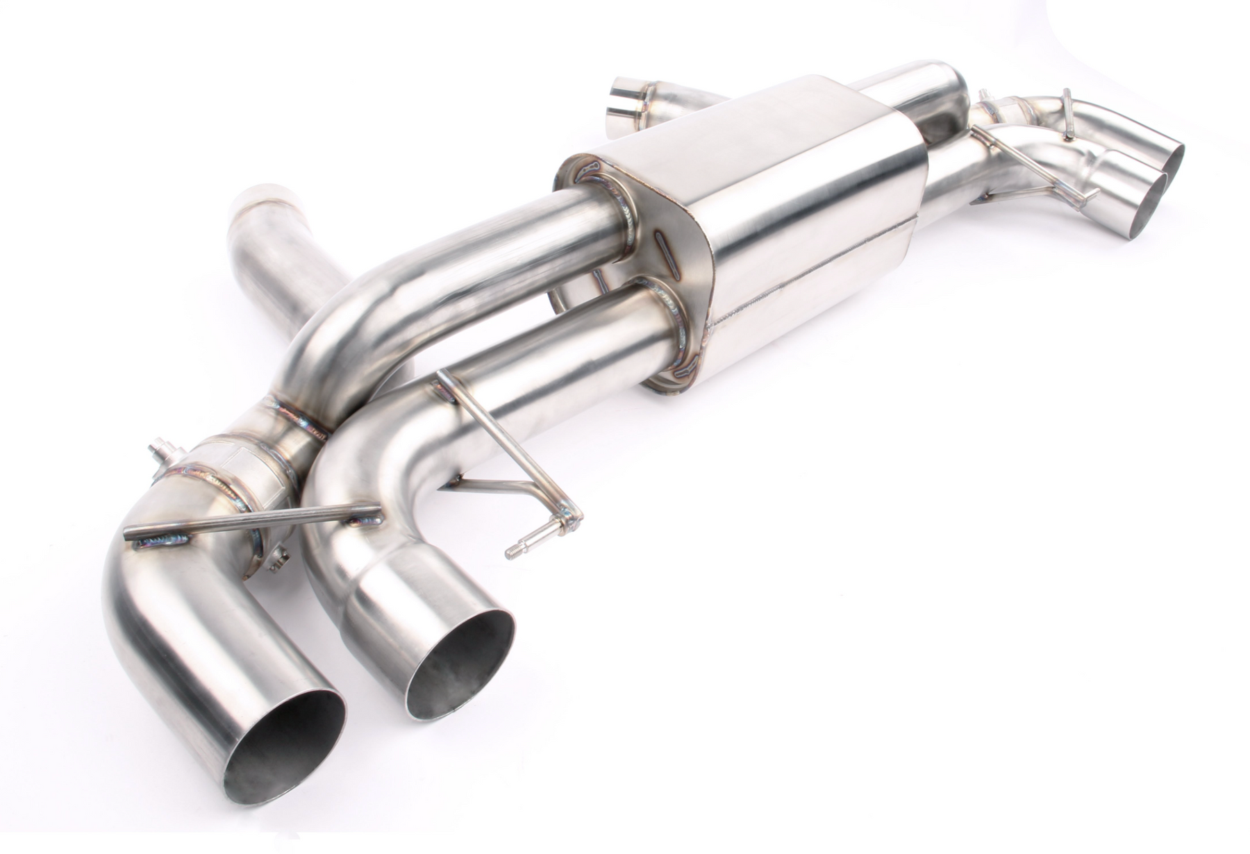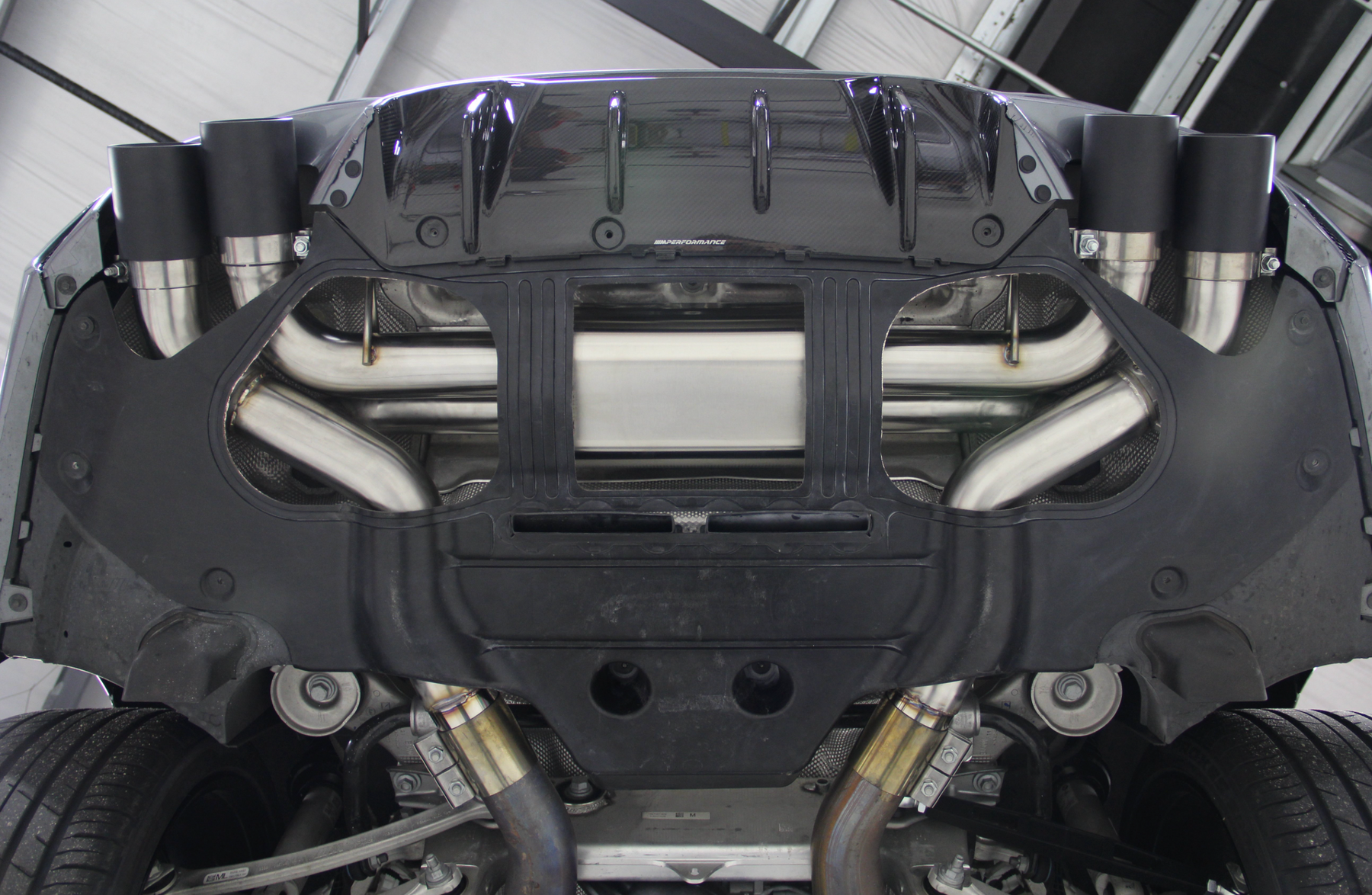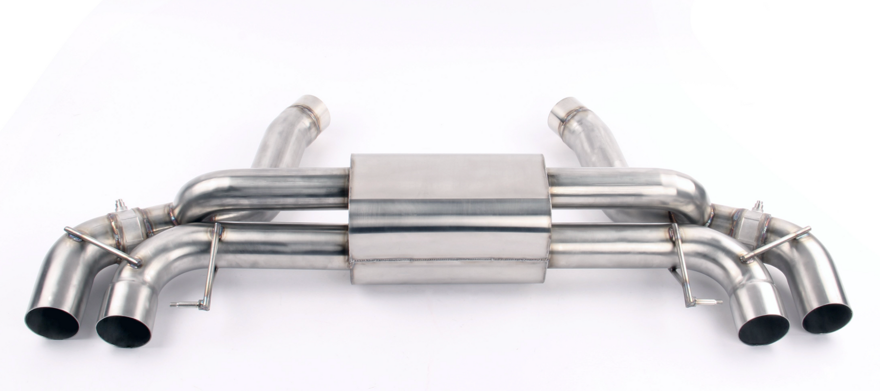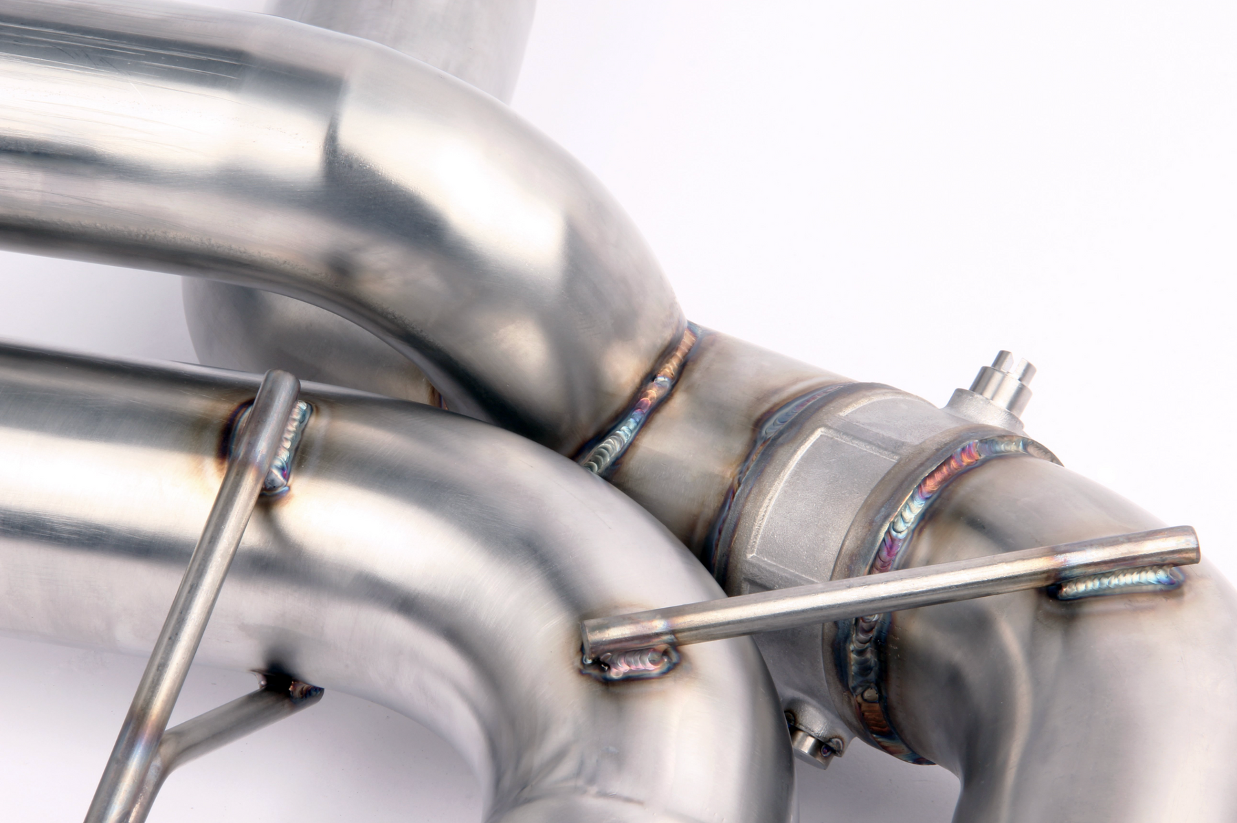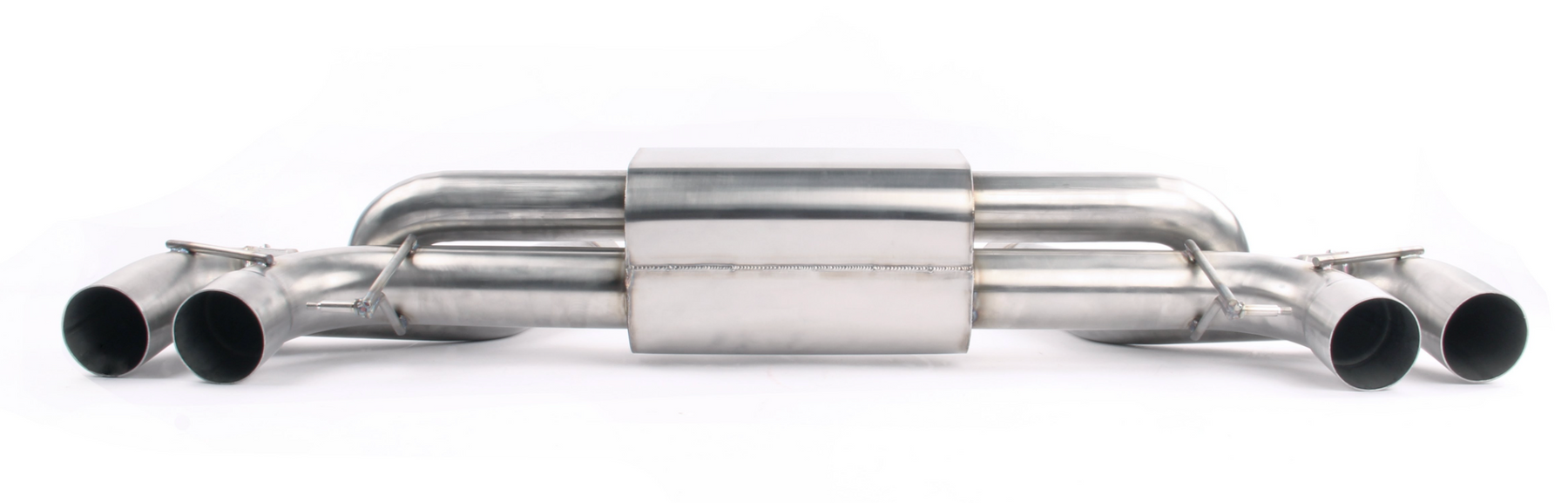 The F90 M5 has impressed users and critics alike with its awe-inspiring power, effortless delivery, and general embodiment of what BMW has always been about - refined performance. Form and function reign supreme from the factory in true German form. On the other hand, other aspects may not be as carefully cultivated. The stock exhaust note on the F90 M5 as an example, while no slouch, is probably best described as having a subdued aggressive note. Dinan believes for such a powerful and impressive car however that the vehicle deserves to be able to bellow a bit louder and more aggressively. The F90 M5 is the alpha on the public roads after all. Dinan's goal is to let the machine sound the part in addition to performing it. With Dinan, there is no reason to sacrifice anything in the process to meet that goal either. Whether that be in the form of drone, civility, appearance or any other aspect. In order to achieve desired sound volume and tone, Dinan felt becoming of the F90 M5 the tubing was enlarged to 83mm (vs 80mm stock) to allow freer flow throughout the entirety of the system. The larger tubing is fed into a muffler that is typical of all Dinan exhaust design and utilizes absorption and reactive technologies designed to improve exhaust flow and reduce backpressure. The combination results in increased power output and a great sporty sound that is civilized when you want it to be, and pleasantly aggressive under hard acceleration. This is partly courtesy of the retained computer-controlled exhaust valves that limit noise during low-speed driving and open fully during high-load conditions to allow free flow and greater sound as the bulk of the gases are bypassing the muffler. Like all Dinan exhausts, our M5 free flow exhaust is engineered to reduce low-RPM drone so the cabin of the vehicle is still intimate and not drowned in an excessively loud tone. With the Dinan exhaust equipped on the M5 you get the best of both worlds; aggressive tone/sound and civility. A combination that we have termed internally as "refined aggression." Sound isn't the only aspect of the exhaust that has been modified. The Dinan F90 M5 exhaust has been skillfully crafted entirely out of T304 stainless steel and TIG welded for the best visual appearance and color. The entire system is then brush finished to further guarantee an immaculate looking system out of the box. The attention to detail is not limited to parts of the system you can't see once the exhaust is installed but is also extended to the exhaust tips themselves. The Dinan exhaust sports enormous, quad 4" (102mm) clamp-on, double-walled, polished and laser engraved exhaust tips. Dinan has retained its signature straight-cut tip design, safeguarding its unique and elegant styling position amongst a crowded marketplace full of angle cuts. The tips masterfully fill up and accentuate upon the factory cut-outs showcasing an extremely aggressive, yet refined, styling that will turn heads even before it is heard.