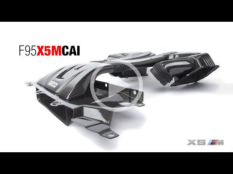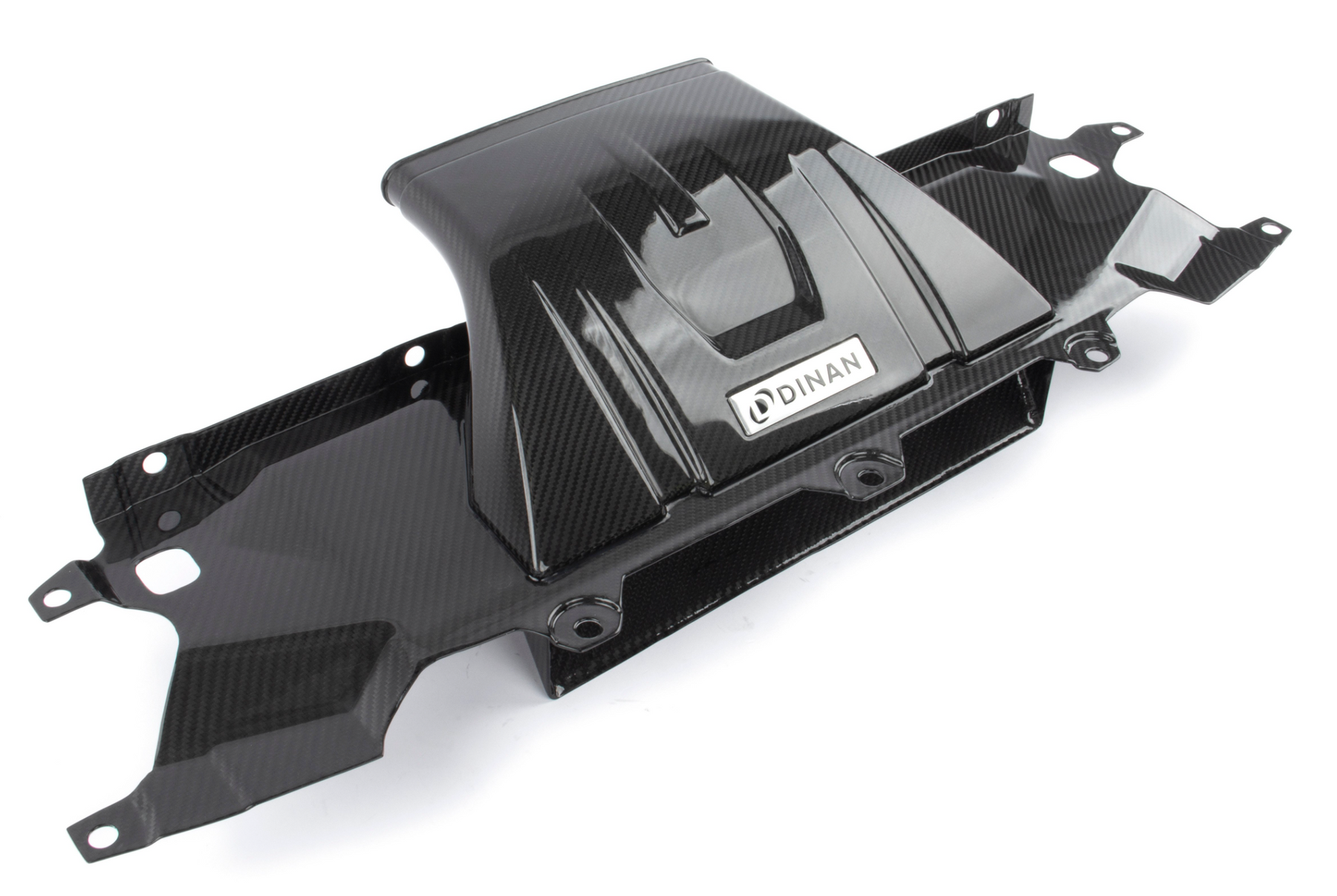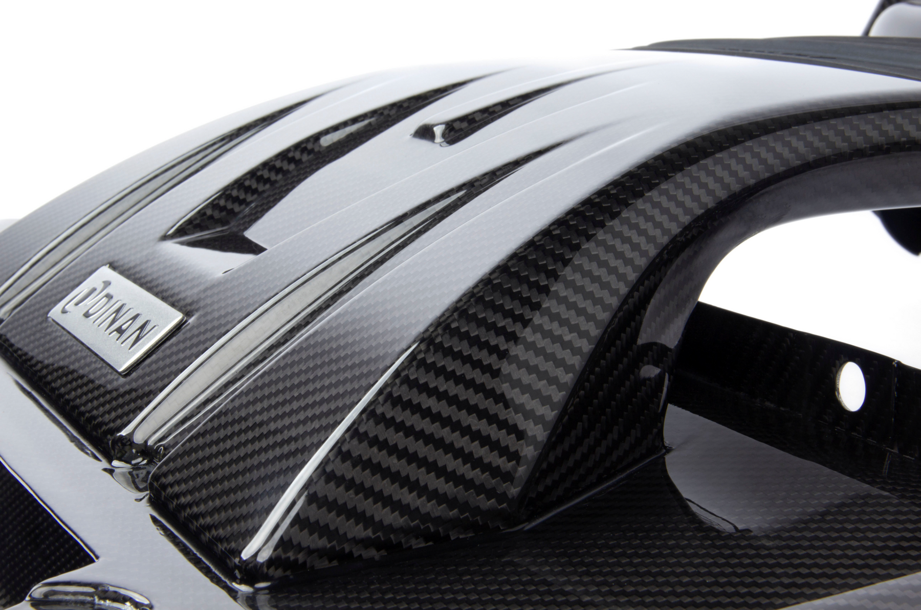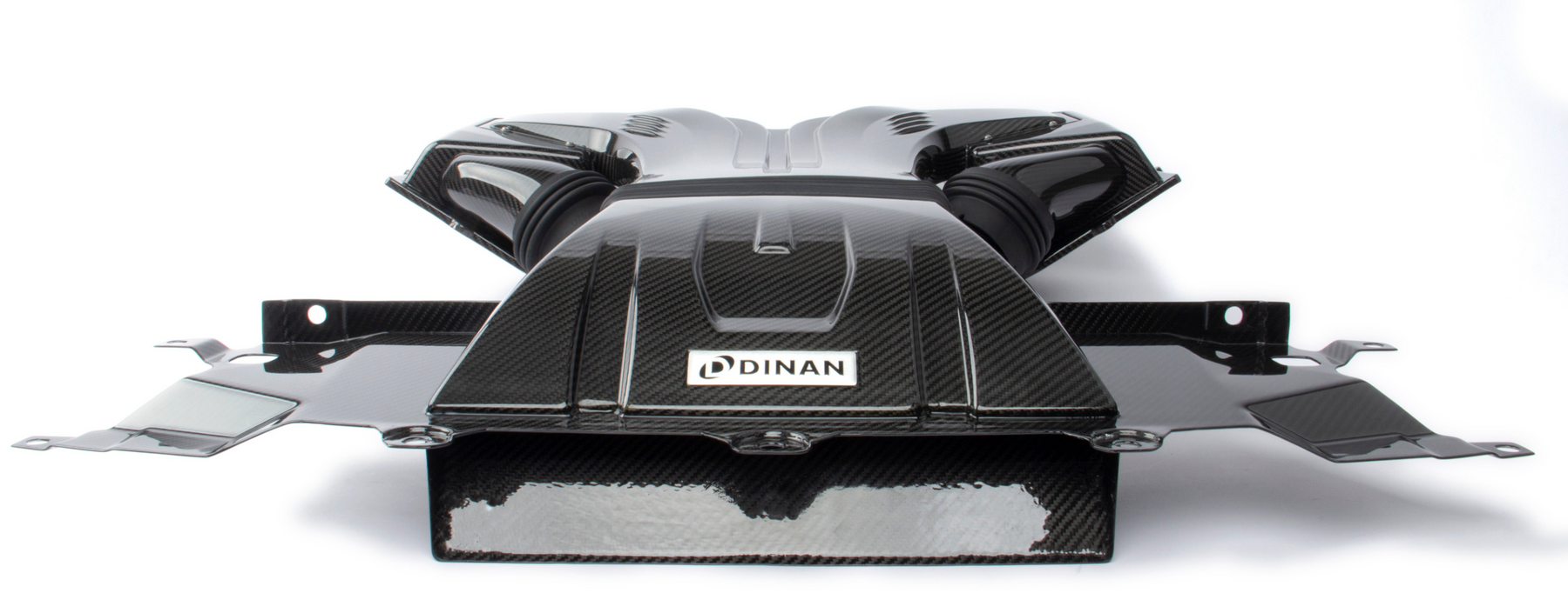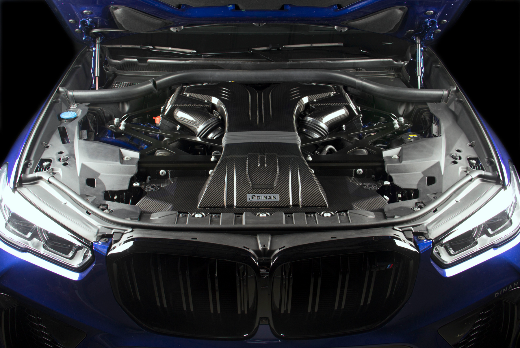 Being the quintessential performance SUV in the marketplace, the X5M is the perfect canvas to showcase a work of art for the entire enthusiast community to see. Creating an indelible mark upon the vehicle, and in particular the engine bay, the Dinan carbon fiber cold air intake is not just a work of art but a piece worthy of bearing the label of "masterpiece." With gloss UV coated carbon fiber stretching from the front of the engine compartment to the rear it's hard not to be impressed by the sheer volume of carbon. The majority of it comprised of a fully functional secondary air inlet which doubles as an ornate engine cover. As such, signature BMW engine cover design elements signifying the cylinder count are integrated into the design for factory like continuity and a nod to a long history. The cosmetic beauty of the system does not solely derive from the presence of carbon however. The immense central passage also purposefully bisects the engine compartment to ensure the factory bracing, which is impressive on its own, is visible. With both OEM and Dinan elements showcased simultaneously the overall engine bay retains symmetrical harmony and commands attention at all corners. Beyond outward appearances and upon closer inspection details emerge which showcase the level of care taken in the intake systems design beyond simply aesthetics. For instance, the secondary air source is deriving its contents from an unobtrusive central hood scoop located behind the front grilles that feeds into the newly formed inlet hump at the front of the engine bay. Through constant CFD analysis, the design of the scoop and secondary inlet continually underwent improvements in order to meet the demand of an even and un-agitated air supply to each air box. In its final form, accents in the carbon both provided a visual embellishment as well as created the outward manifestations of the runners used to direct and smooth the secondary air flow. The additional air flow ultimately supplements the factory inlet locations on both the left and right air boxes with ambient air from outside of the engine compartment. These air boxes have been enlarged and equipped with massive filters to handle this increased volume and together with the rest of the system allow the intake to flow as efficiently as possible. While the stock intake system is adequately suited to support up to stage 1 power levels that does not mean there is no performance benefit when upgrading to the Dinan system. Besides its jaw dropping appearance the biggest advantage of the system, by virtue of additional and optimized flow, is the reduction of the pressure depression in the stock system. This equates to the turbo having to work less in order to achieve targeted power. With the turbo working more efficiently this also means a lower pre-turbine backpressure, lower turbocharger shaft speeds, lower turbocharger compressor discharge temperatures, and for the ability to achieve higher boost pressure levels. Paired with the natural improvement to throttle response, a bump to the acoustics, and an unequalled visual appeal the Dinan F9x X5M/X6M carbon fiber intake system can wear the self-appointed moniker of "masterpiece" without trepidation.