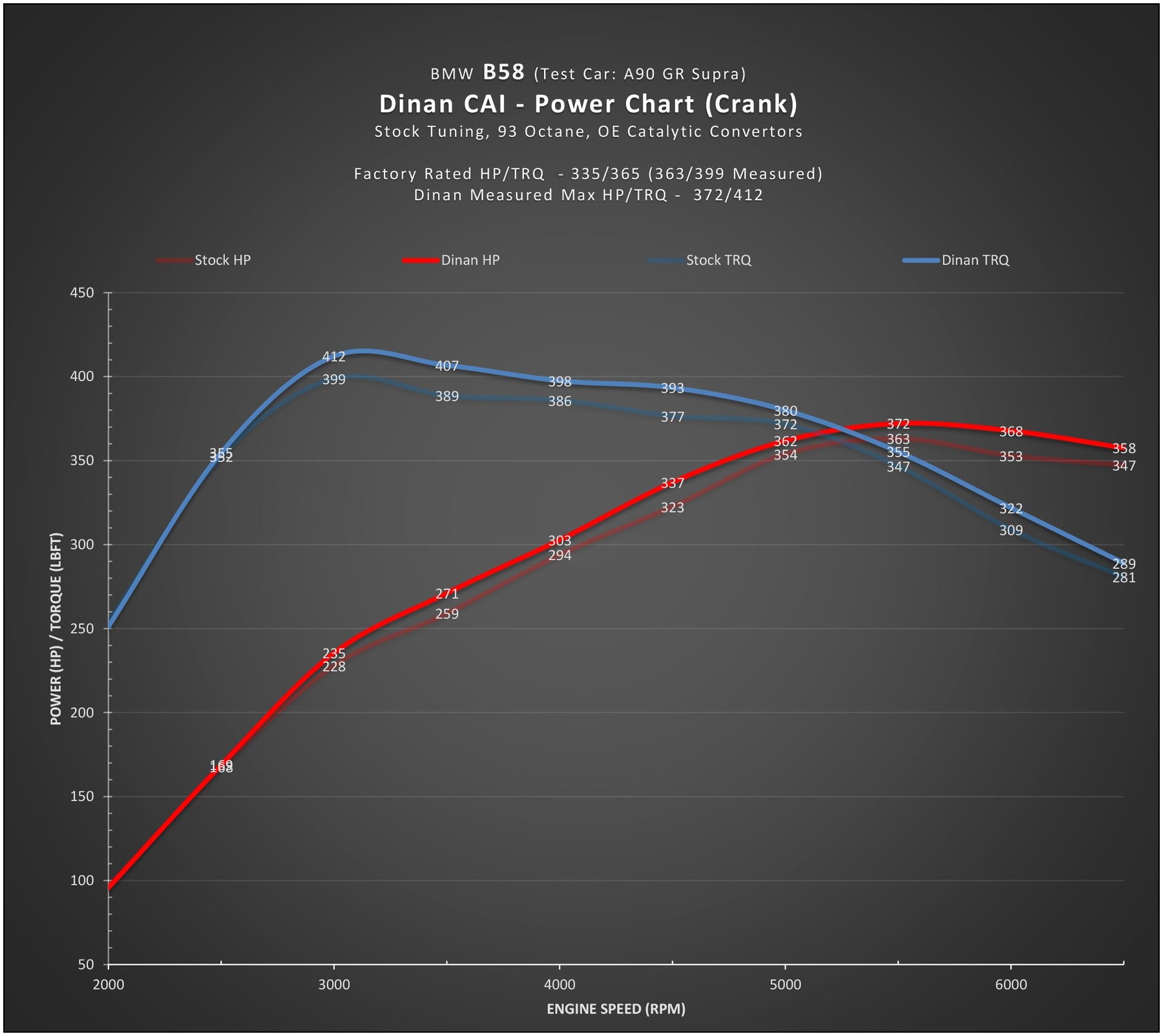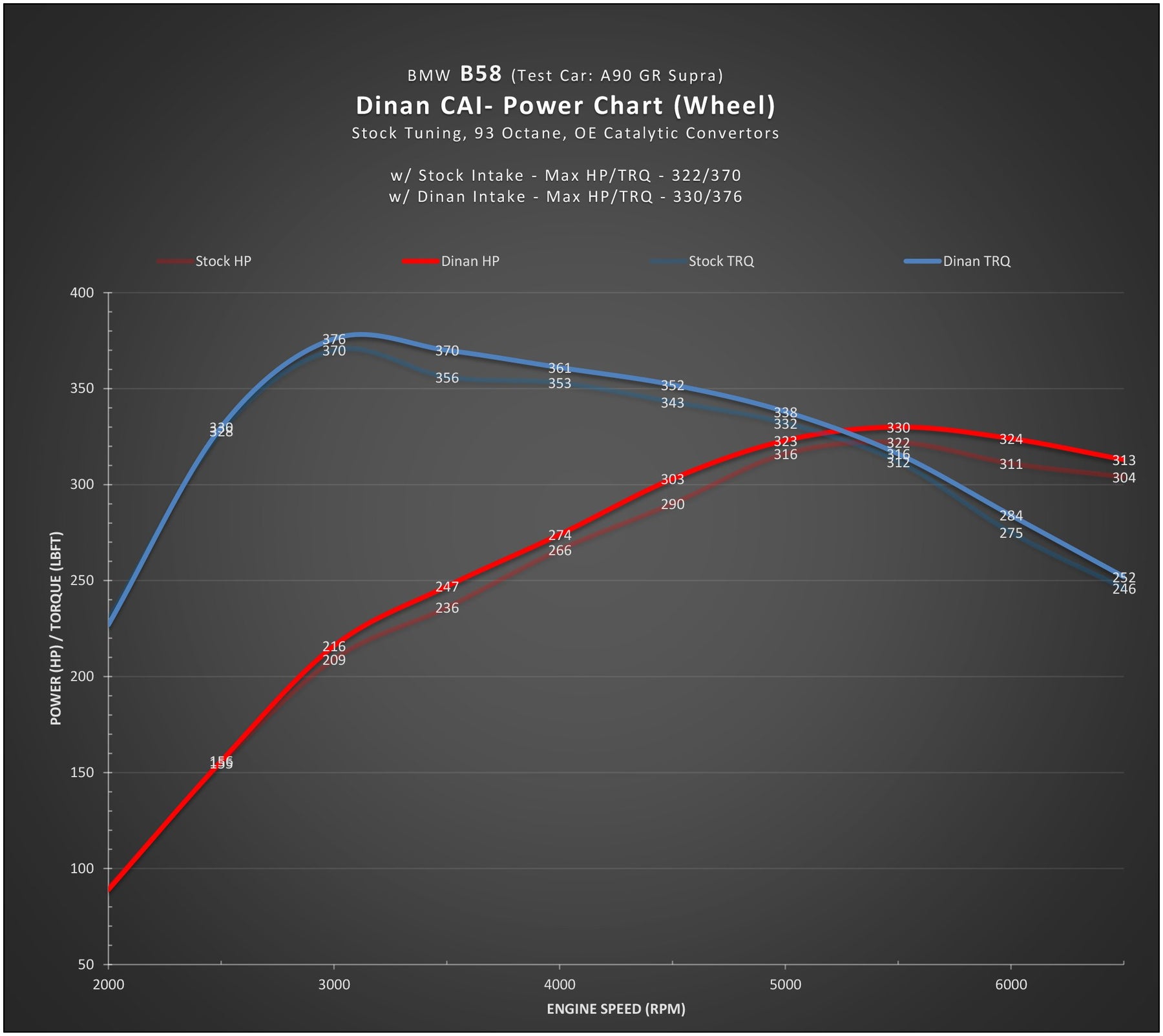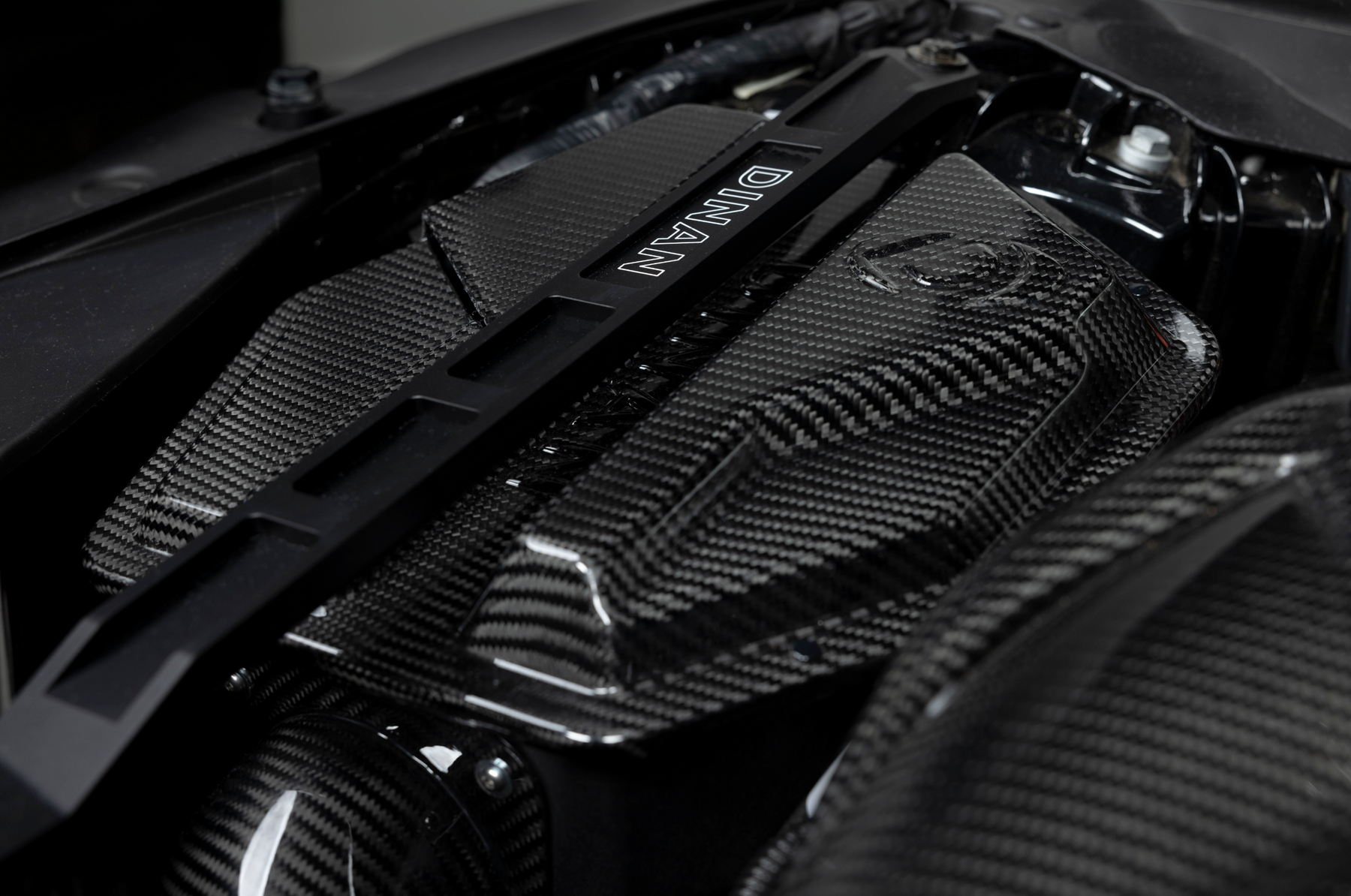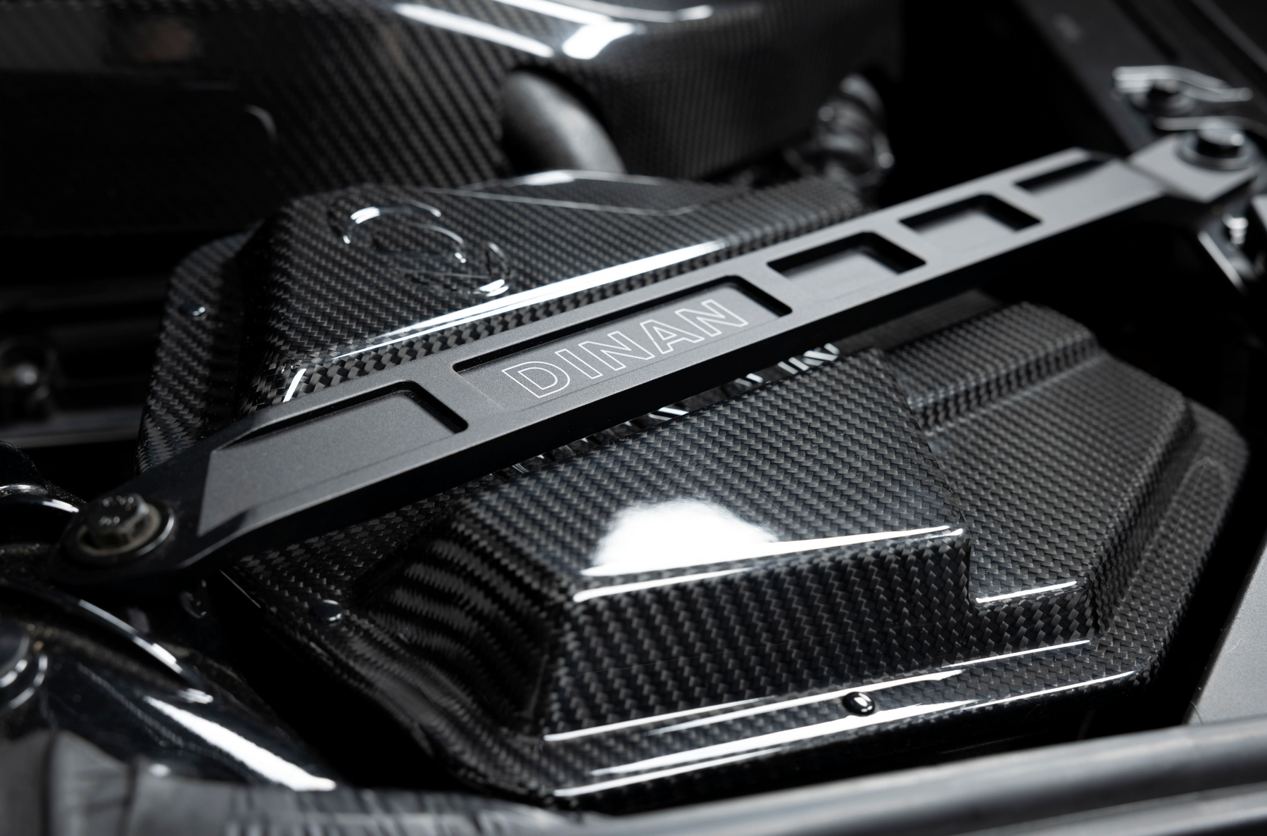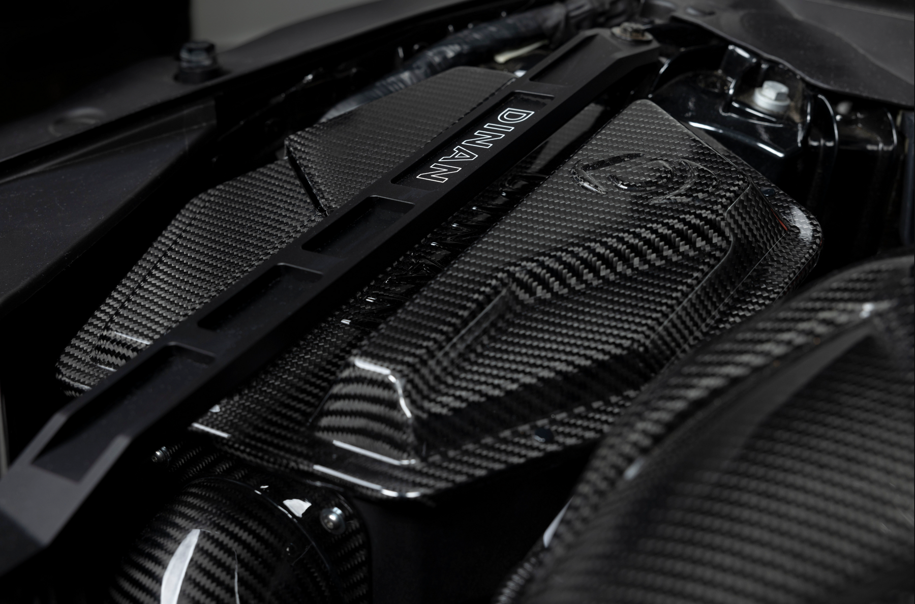 Both the Toyota GR Supra as well as the BMW Z4 are their respective brands answer to the modern 2-seater sports coupe delivering enhanced driving enjoyment in a compact and stylish frame. With aggressive organic lines used unabashedly throughout, they are unapologetic in their outward style to the point of nearing brashness. This character is limited to driving dynamics and external appearance however, with both the sound and under hood visuals not matching the colorful outer demeanor. The factory air box in particular is an uninspired design, albeit functional, and leaves substantial room for improvement in terms of flow and resulting power gains. It also purposefully includes an intake resonator whose sole purpose is the elimination of turbo/intake noises - the same noises that those in the performance world relish. The Dinan carbon fiber intake for the platform rights these wrongs and delivers an intake capable of flowing 58% more air than the stock system resulting in improved throttle response, additional power and the elimination of a potential roadblock when opting to pursue a high-powered build (upgraded turbo, fueling, etc). At the same time revealing a more aggressive, sporty carbon fiber appearance, and an increase in sound courtesy of the removal of the intake resonator and implementation of a semi-open design. To achieve the gains in flow that the Dinan intake delivers, the entire lower box of the system, and not just the lid, has been reworked and enlarged in an effort to make use of as much of the available real estate as possible within the engine bay. In turn, this allows a 40% larger, custom, free flowing filter to be housed within and maximum flow to be realized. However, a secondary inlet has always been desired by Dinan to effectively fill the volume of the enlarged air box and increased filter surface area. This desire led to a multitude of experiments being conducted on the effectiveness of a possible open-air inlet in the system. With different shapes, locations, and sizes of openings being tested, the goal was to ensure that the added secondary inlet did not cause any unwarranted side effects such as an increase in air temps in the system. This is commonplace with open-air intake systems where overheated engine bay air is employed in the intake tract. The results of these tests showed that the patterned openings present in the final iteration of the box located on the opposite side from the engine provided a perfect balance of additional volume to assist the factory inlet all the while not causing an increase in turbo inlet temperatures. This was the case regardless of testing conditions (single/multiple gear pulls, constant speed, 0-100mph runs, etc.). With more air being pulled into the system, throttle response is improved, and additional power is realized in the form of max gains of +13 WHP / +14 lb-ft of torque on an otherwise completely stock vehicle. Beyond stock or basic bolt-on equipped vehicles, the Dinan intake would expand the potential of the platform's power ceiling. Put simply, those striving to build a more potent and robust solution, complete with turbo and fueling upgrades, will be allowed to maximize the results without worry of the intake system being a limiting factor. Regardless of the level of the build, the secondary air inlets, as well as the sound slot present on the lid, allow the intake system to be more audible so the turbo spool and BOV can be appreciated. A stark difference from Dinan's traditional fully sealed systems where induction noise is not nearly as recognizable. Not to be outdone by the increased power and sound, the outwardly visible system is made of immaculate 2x2 gloss twill carbon fiber resulting in vastly improved under hood appeal. Joined by the aluminum Dinan strut braces and matching carbon fiber engine cover, the engine bay instantly becomes equally as showy as the exterior. A unified style, inside and out, with a bit of turbo attitude.
