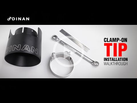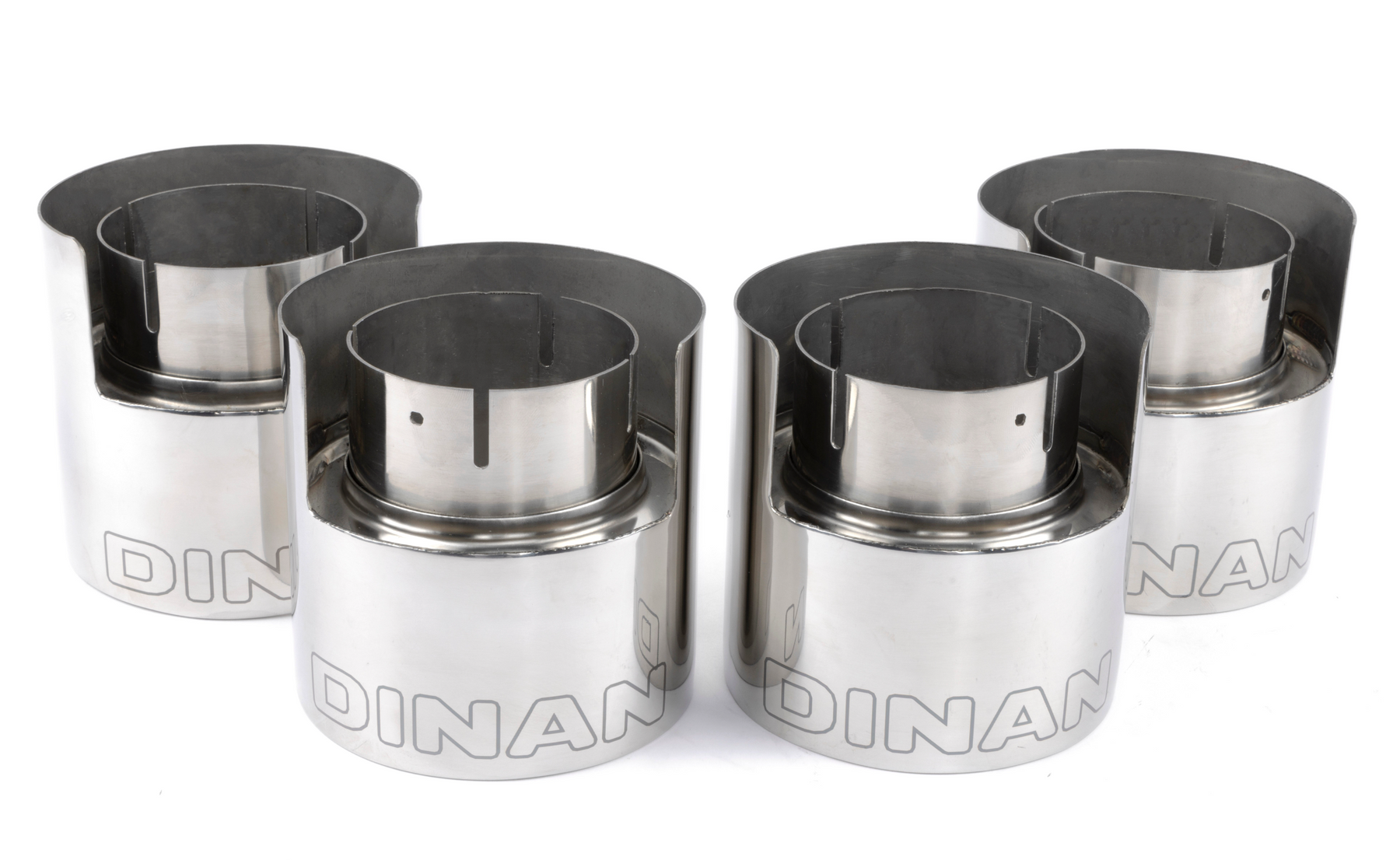 • Four, diffuser filling, 4.5-inch (114mm) double-walled, polished stainless steel clamp-on tips with laser engraved Dinan logo