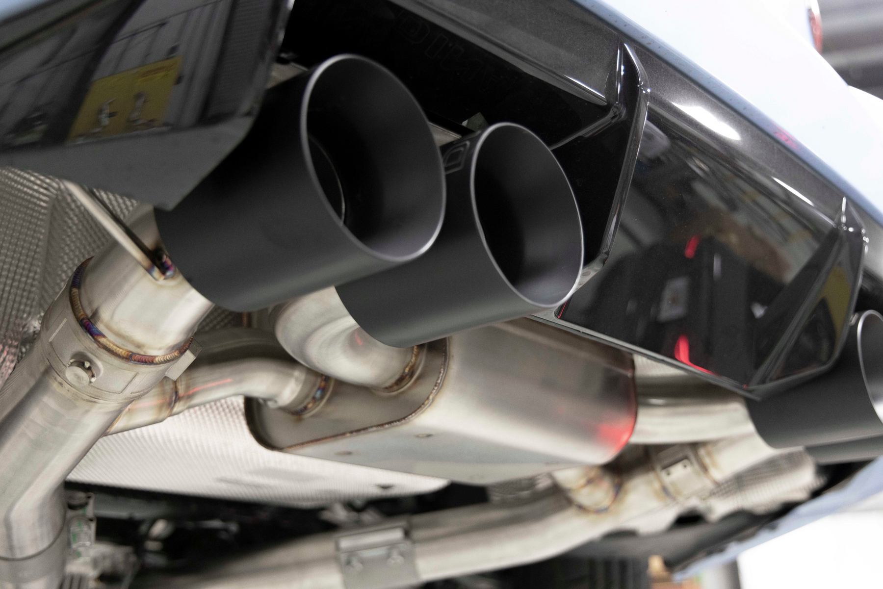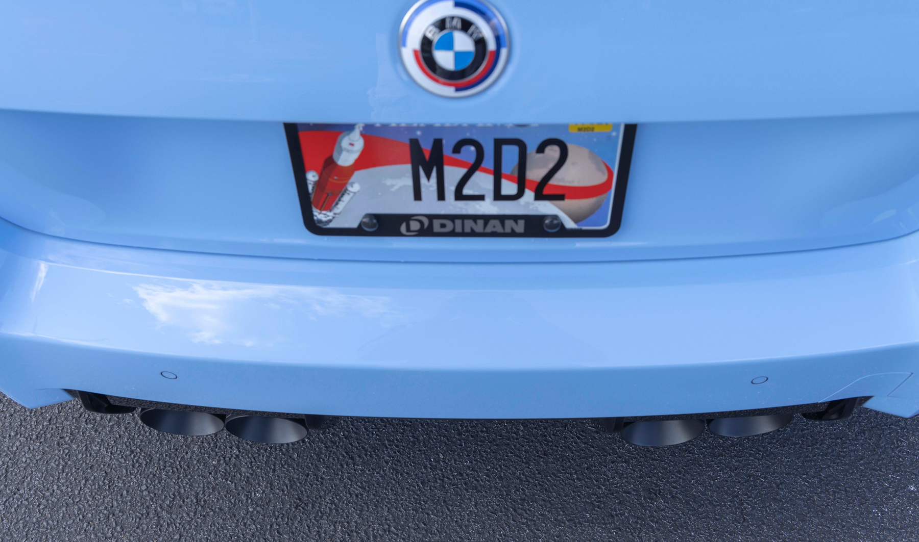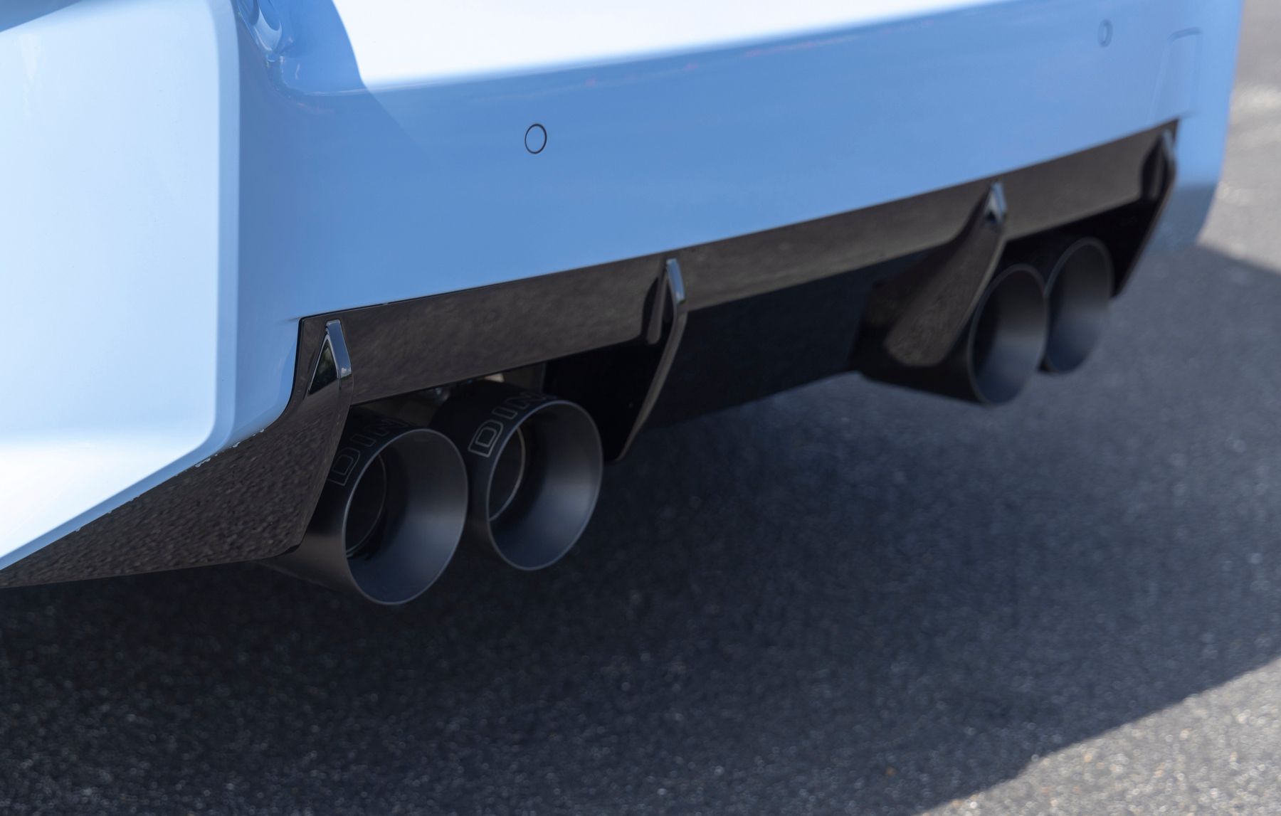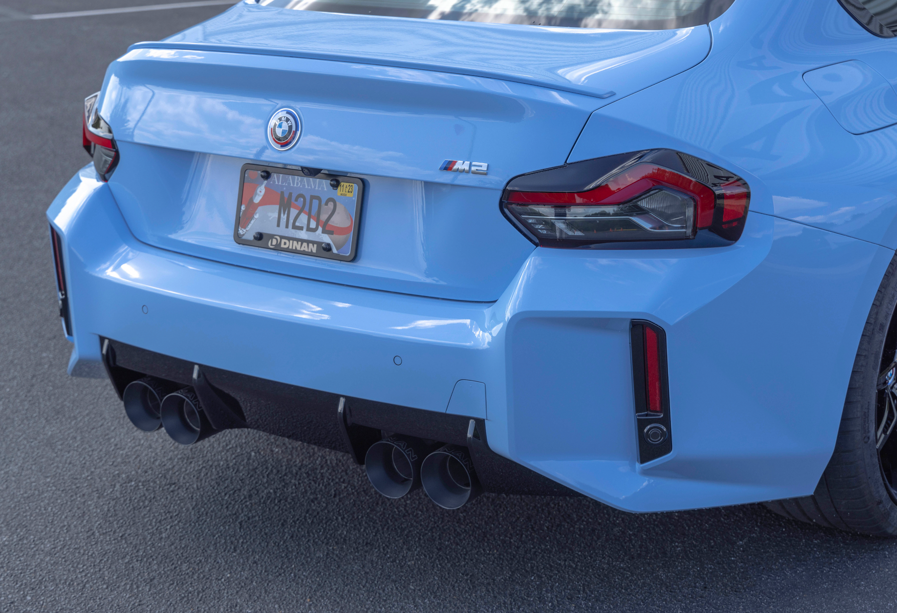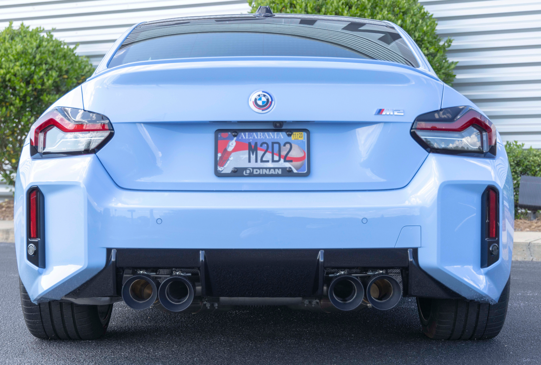 Like its brethren, the M3 and M4, the G87 M2 is a giant leap forward from its predecessor in terms of overall performance and its capabilities. Not surprising given the latter model borrowing heavily from its older siblings' part catalog resulting in a wide swath of components being interchangeable amongst the trio. A few inlet pipe bends prevent the exhaust from being one of those but the M2 is still largely the same as the G8x M3/M4 system. This allowed the extensive drone abatement development applied on those platforms to be used on the G87, fast tracking the R&D process. The result is the introduction of another member of G8x valved axle back exhaust family that elevates the tone to a deeper, more meaningful note while also delivering an extra level of amplification above and beyond its stock counterpart. To achieve desired sound volume and tone worthy of the G87 M2 the tubing was enlarged to 76mm (vs 70mm stock) to allow freer flow, and reduce backpressure, throughout the entirety of the system. The larger piping gives way to multiple pathways as it nears the rear of the vehicle -- the choice of which is utilized determined by the factory exhaust valves which are retained. When valves are closed, flow is directed into the Dinan muffler, where absorption and reactive technologies are used, and exit out the two inner tips. This limits noise during low-speed driving and produces a more subdued, albeit deeper, and agreeable note. However, when the valves are open during high-load conditions the bulk of the gases bypass the muffler altogether for a near straight pipe design and maximum aural enjoyment to be achieved. It's the perfect marriage for all tastes and allows civility or impassioned aggression depending on what the situation demands. The combination is one Dinan has deemed fitting for the marques signature performance models that cater to the tasteful enthusiast who demand the best for all situations. Visually, the Dinan G87 M2 exhaust has been skillfully crafted entirely out of T304 stainless steel and TIG welded for the best visual appearance and color. The entire system is then brush finished to further guarantee an immaculate looking system out of the box. The attention to detail is not limited to parts of the system you can't see once the exhaust is installed but is also extended to the exhaust tips themselves. The Dinan exhaust includes massive, quad 4.5-inch (114mm) clamp-on, double-walled, polished stainless steel and laser engraved exhaust tips. Despite the seemingly cartoonish size on paper, the tips mesh seamlessly and fill the factory cut-outs to complete the OEM+ look with a healthy dose of audible attitude.