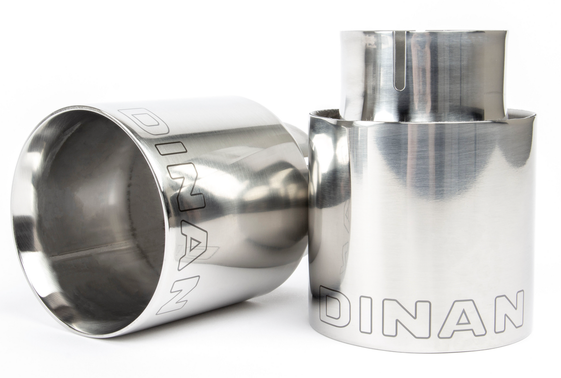 • Dual 4" (102mm) double-walled, polished clamp-on tips with laser engraved Dinan logo